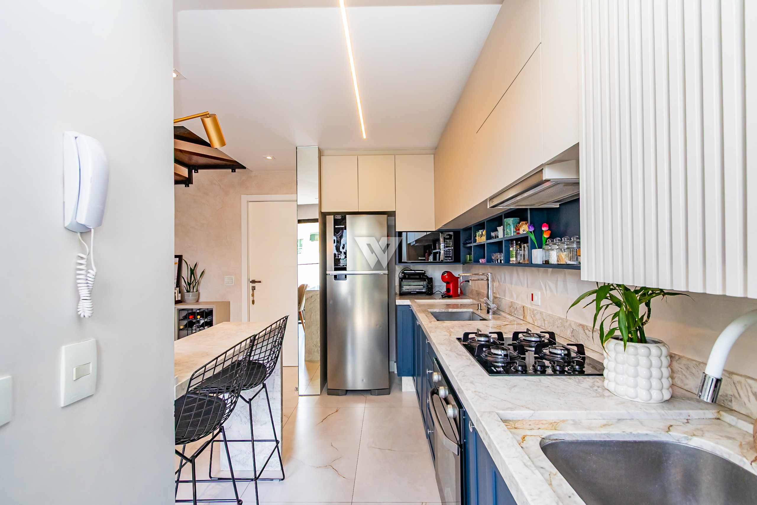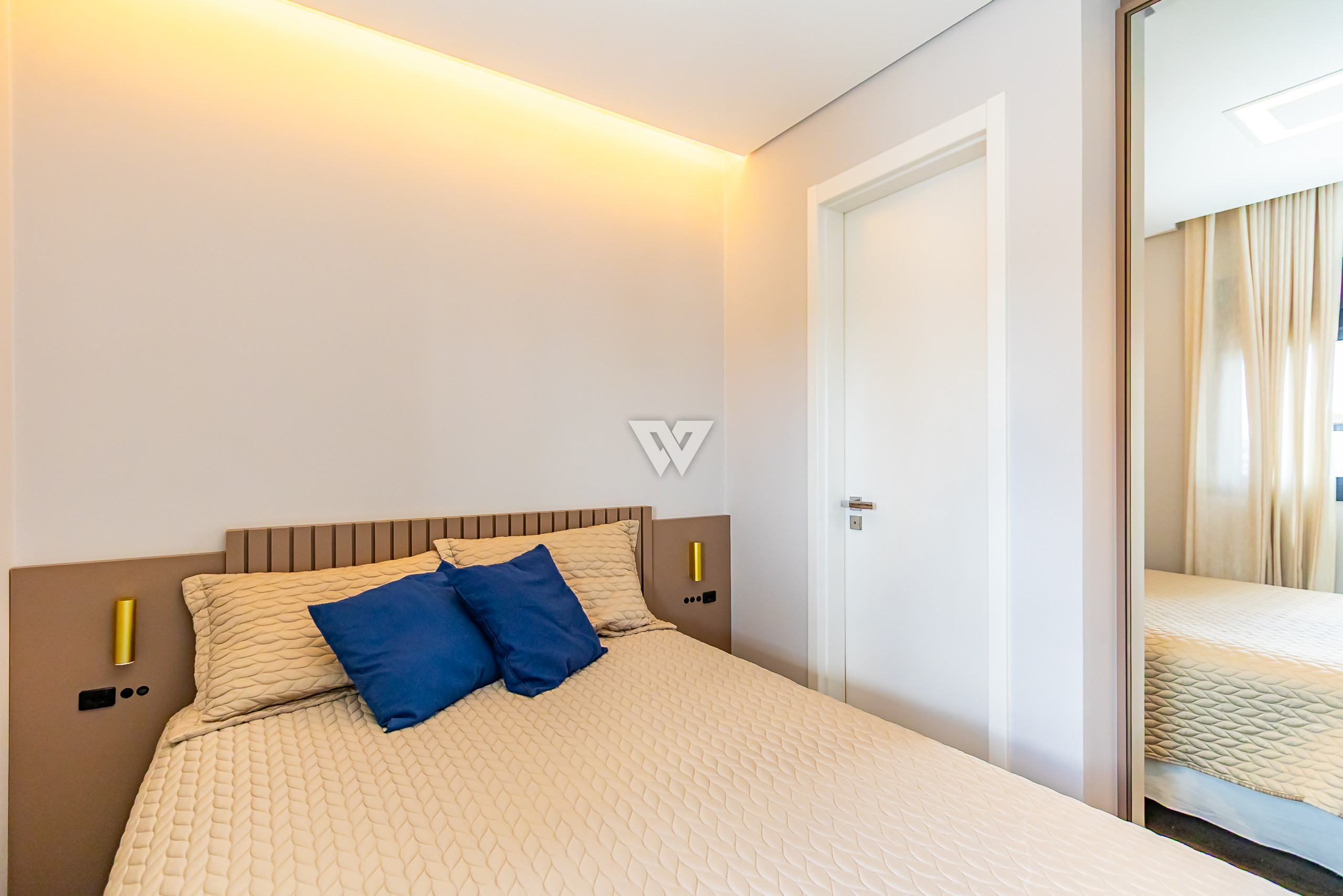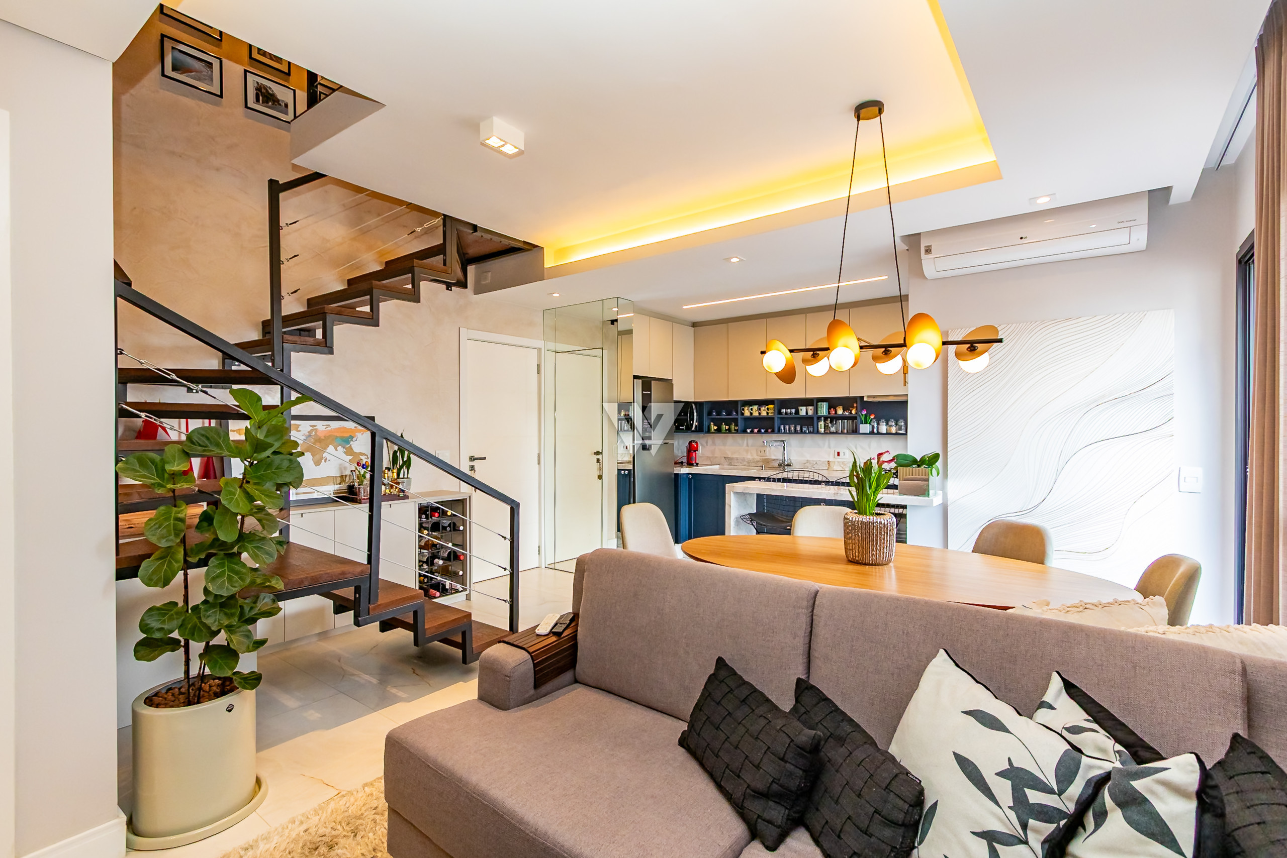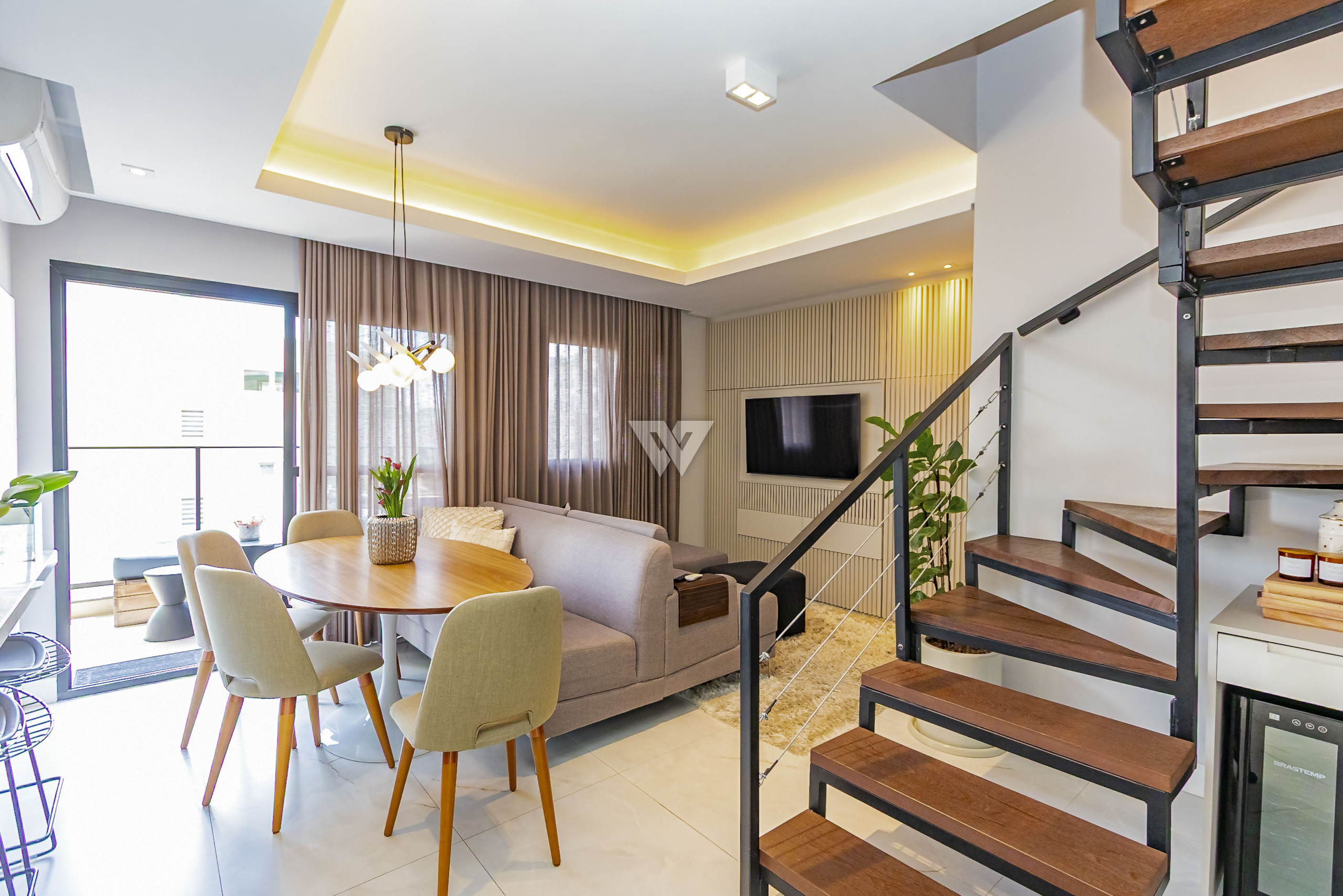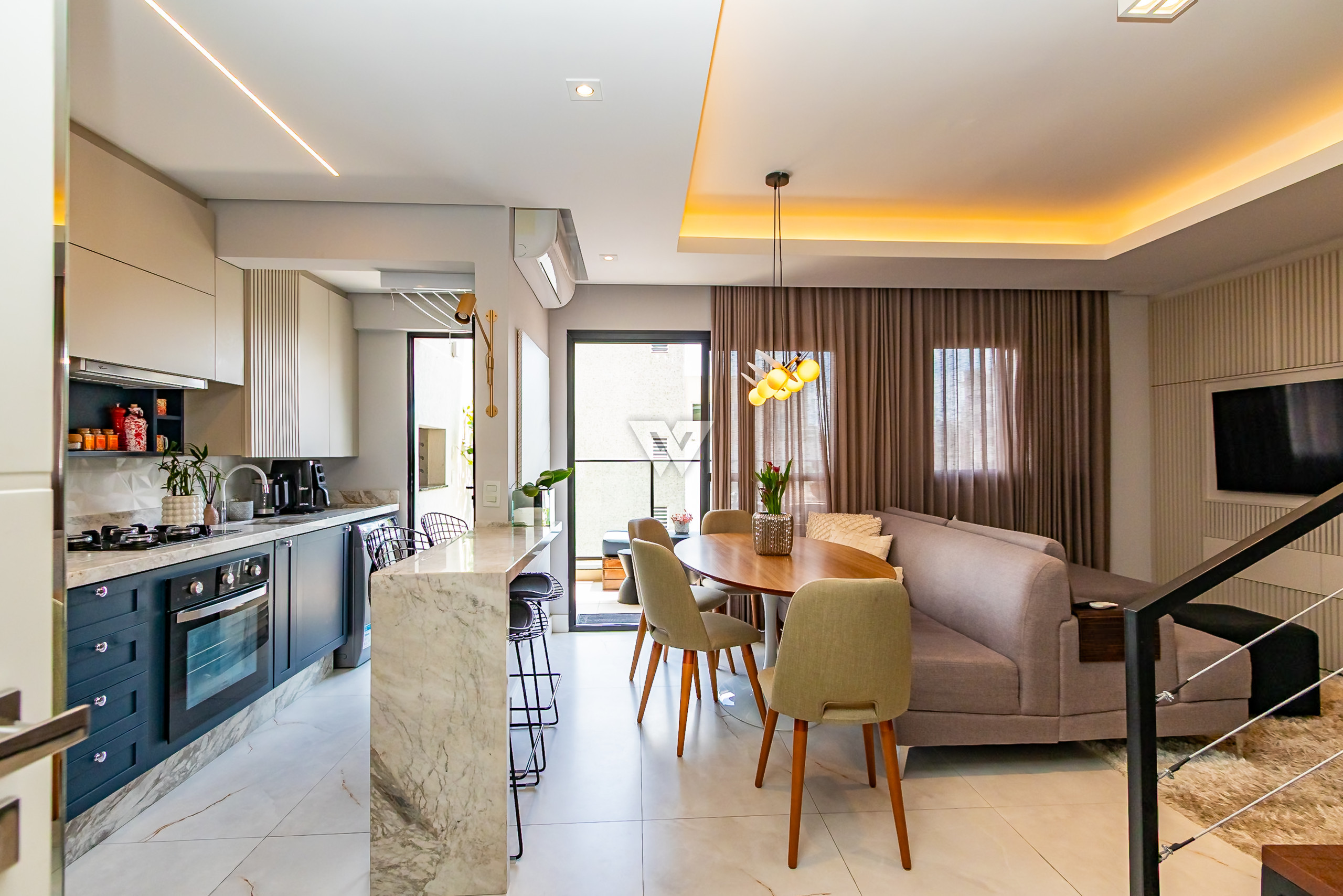 Apartamento duplex com 78,51m² privativos, distribuídos em 2 dormitórios, ambos suítes, que oferecem conforto e privacidade para você e sua família. A unidade conta com 2 vagas de garagem e um projeto de interiores assinado por André Cabral (CASACOR), com acabamentos de alto padrão. Entregue totalmente mobiliado (exceto eletrodomésticos e televisores), o imóvel possui churrasqueira a carvão na sacada, cozinha com bancada em mármore Branco Paraná, persianas embutidas nos quartos, aquecedor de toalhas na suíte principal e ar-condicionado na sala e nos dormitórios.