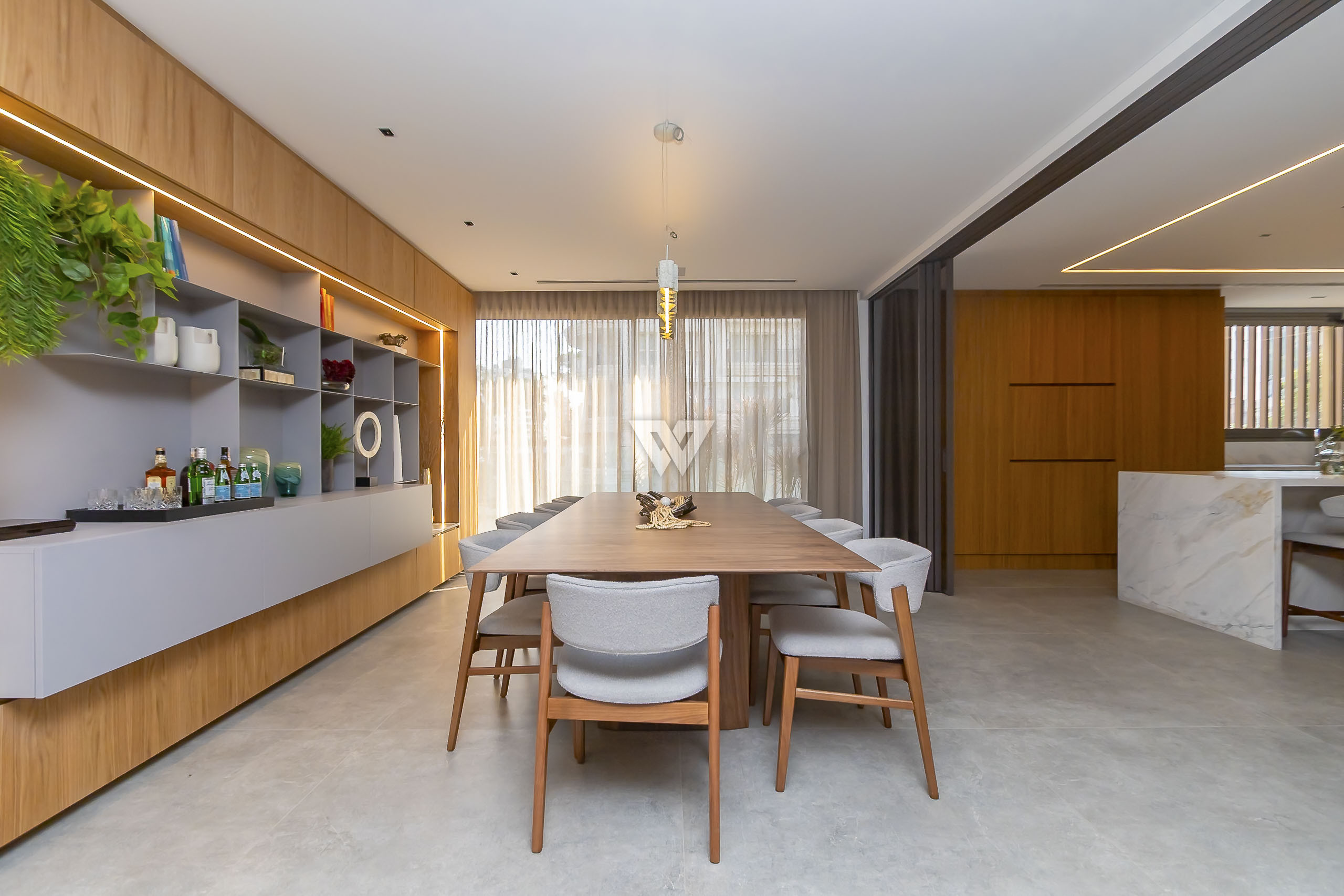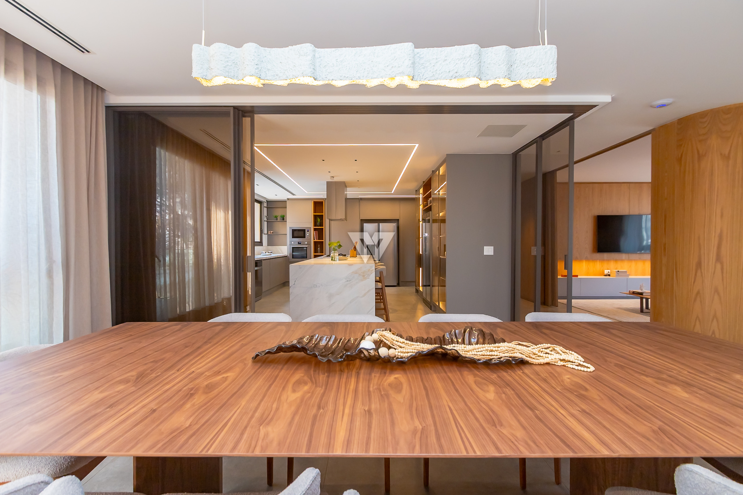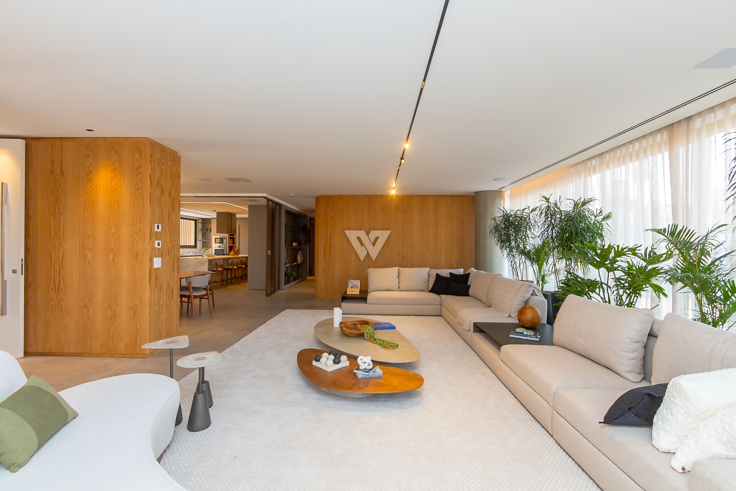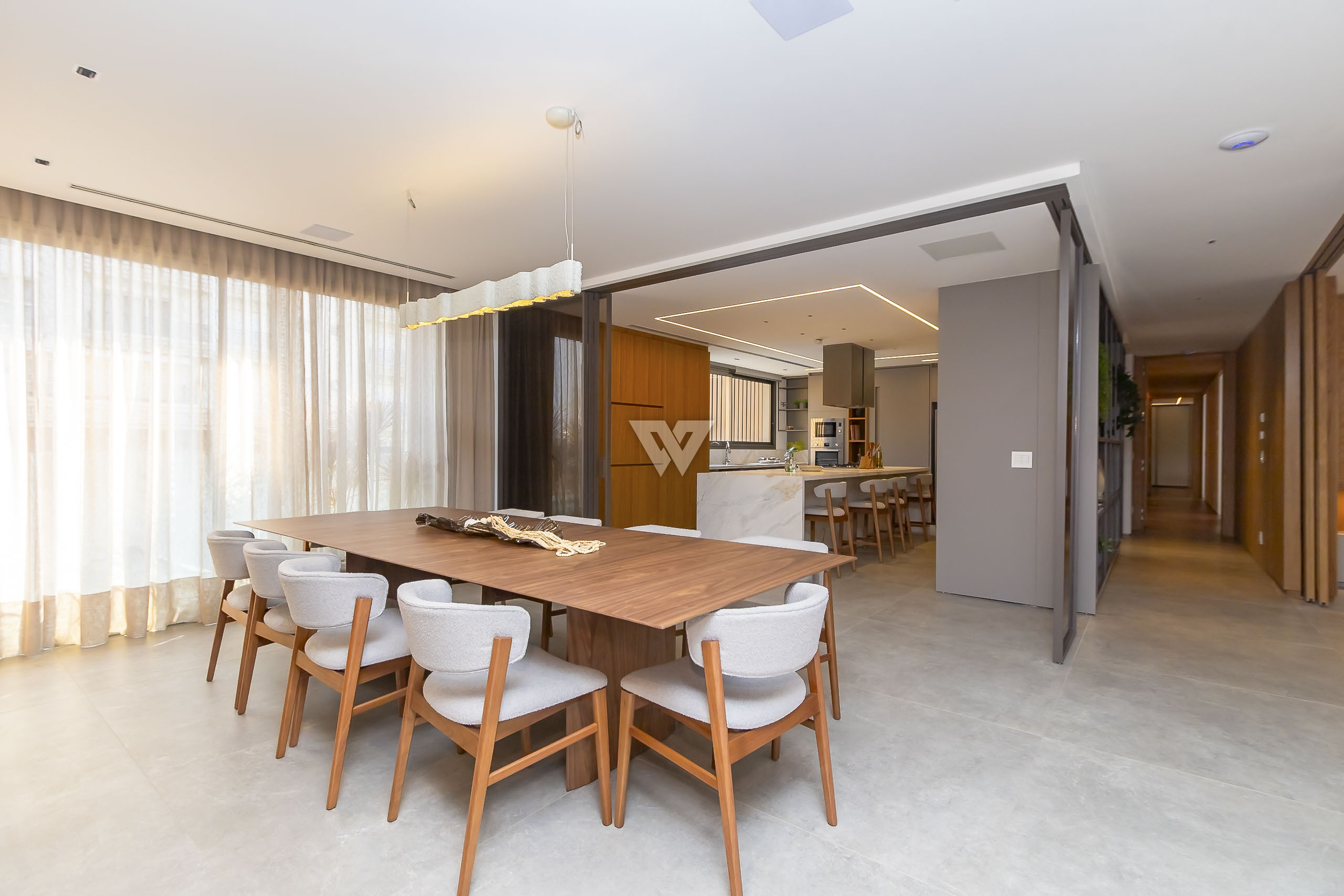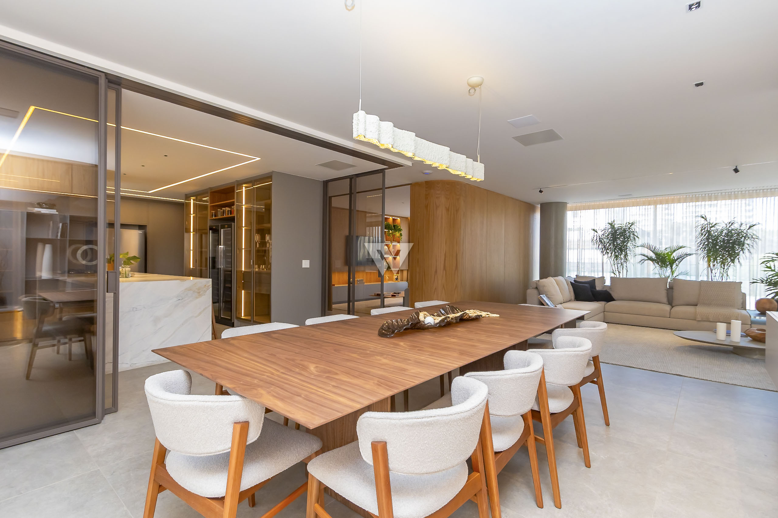 Possui como divisão interna sala para 3 ambientes, cozinha planejada com eletrodomésticos e armários, lavabo, área de serviço, banheiro de serviço, área técnica, despensa, 4 suítes sendo uma máster, piso em todos os ambientes.