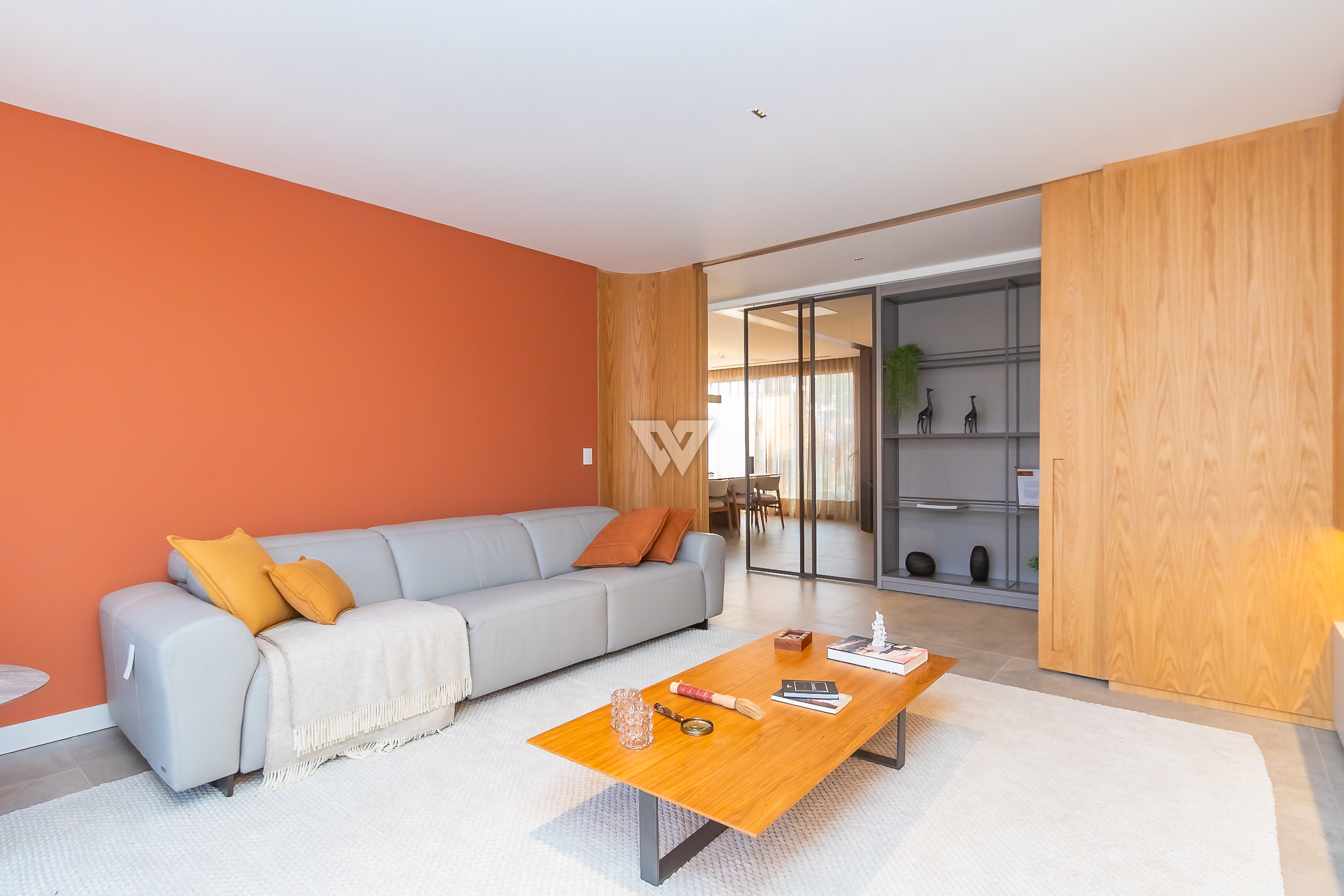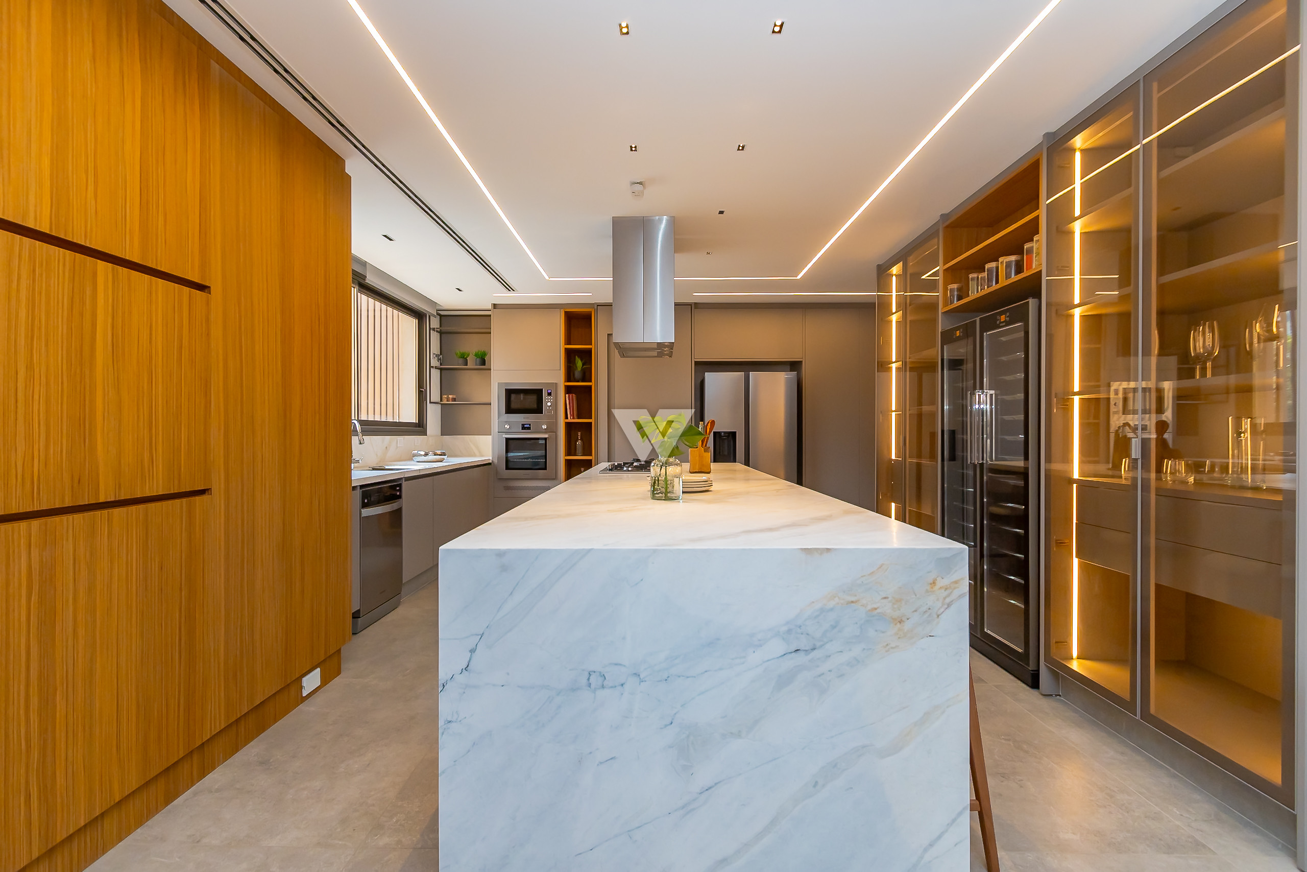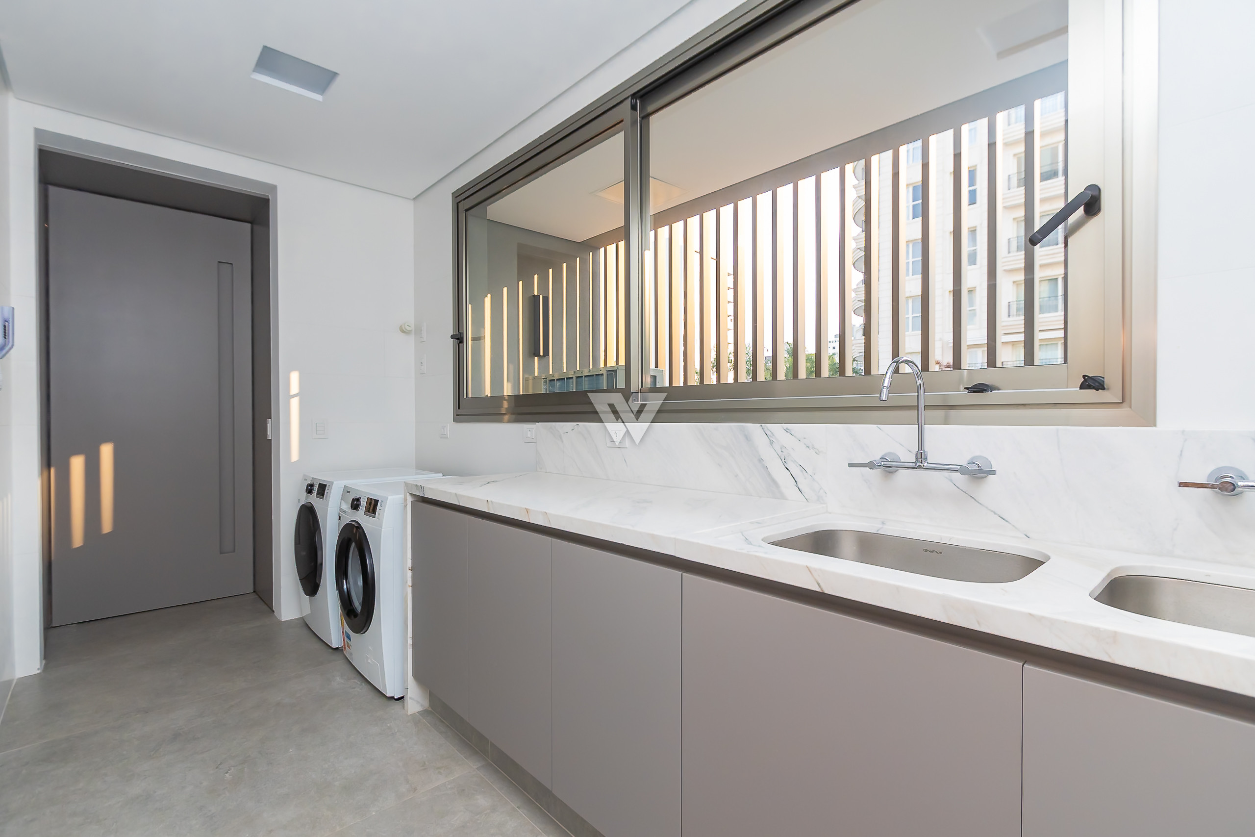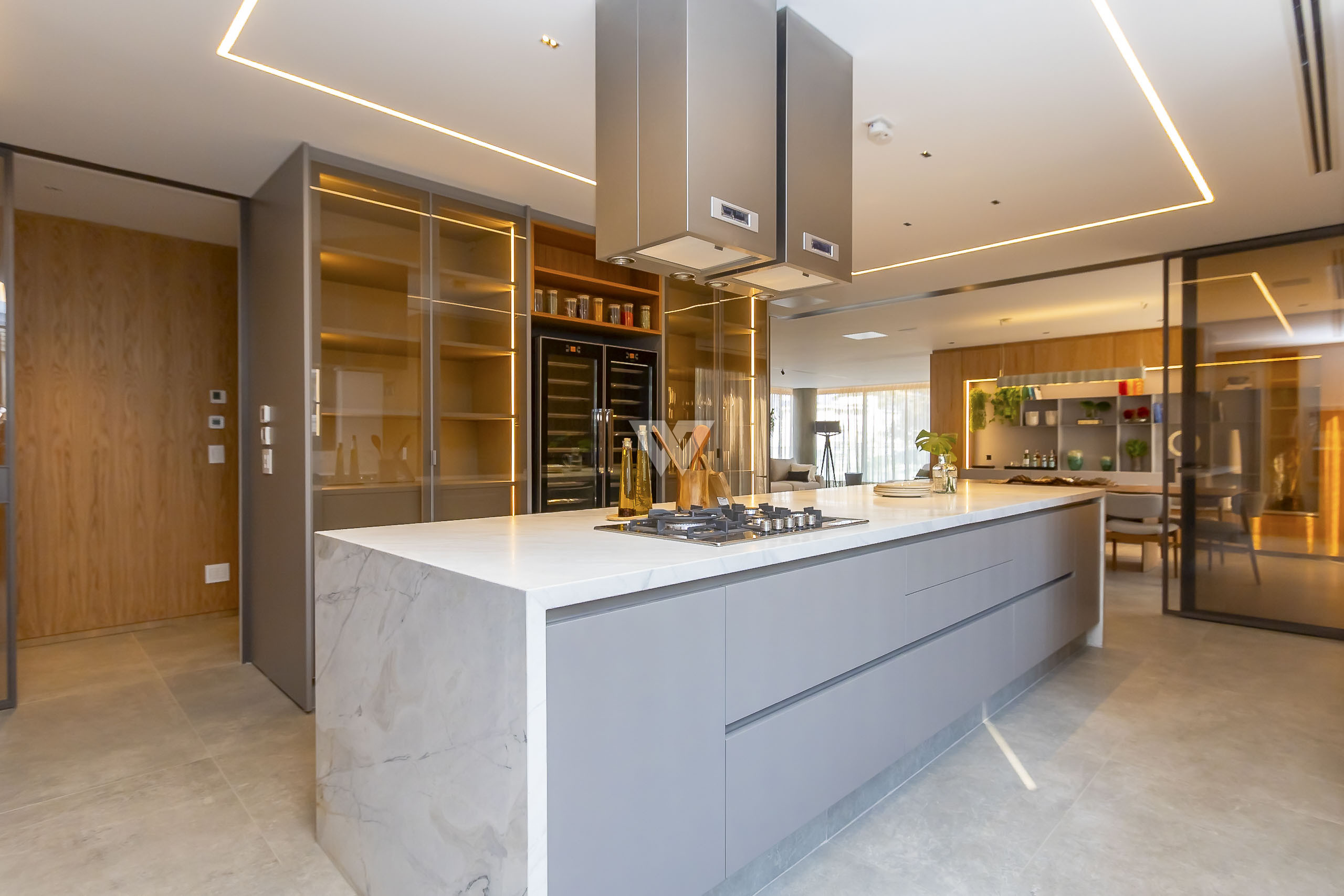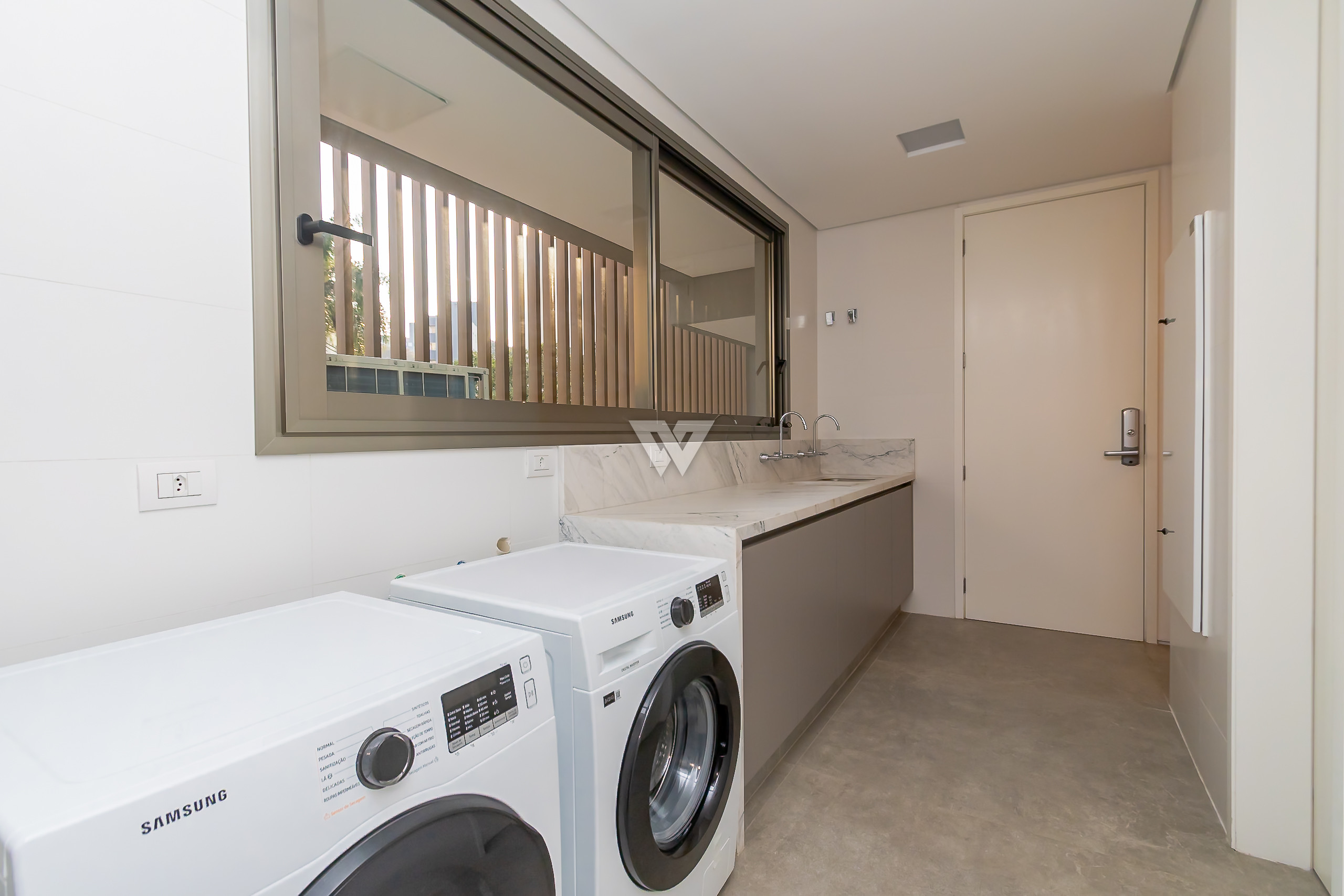Possui como divisão interna sala para 3 ambientes, cozinha planejada com eletrodomésticos e armários, lavabo, área de serviço, banheiro de serviço, área técnica, despensa, 4 suítes sendo uma máster, piso em todos os ambientes.