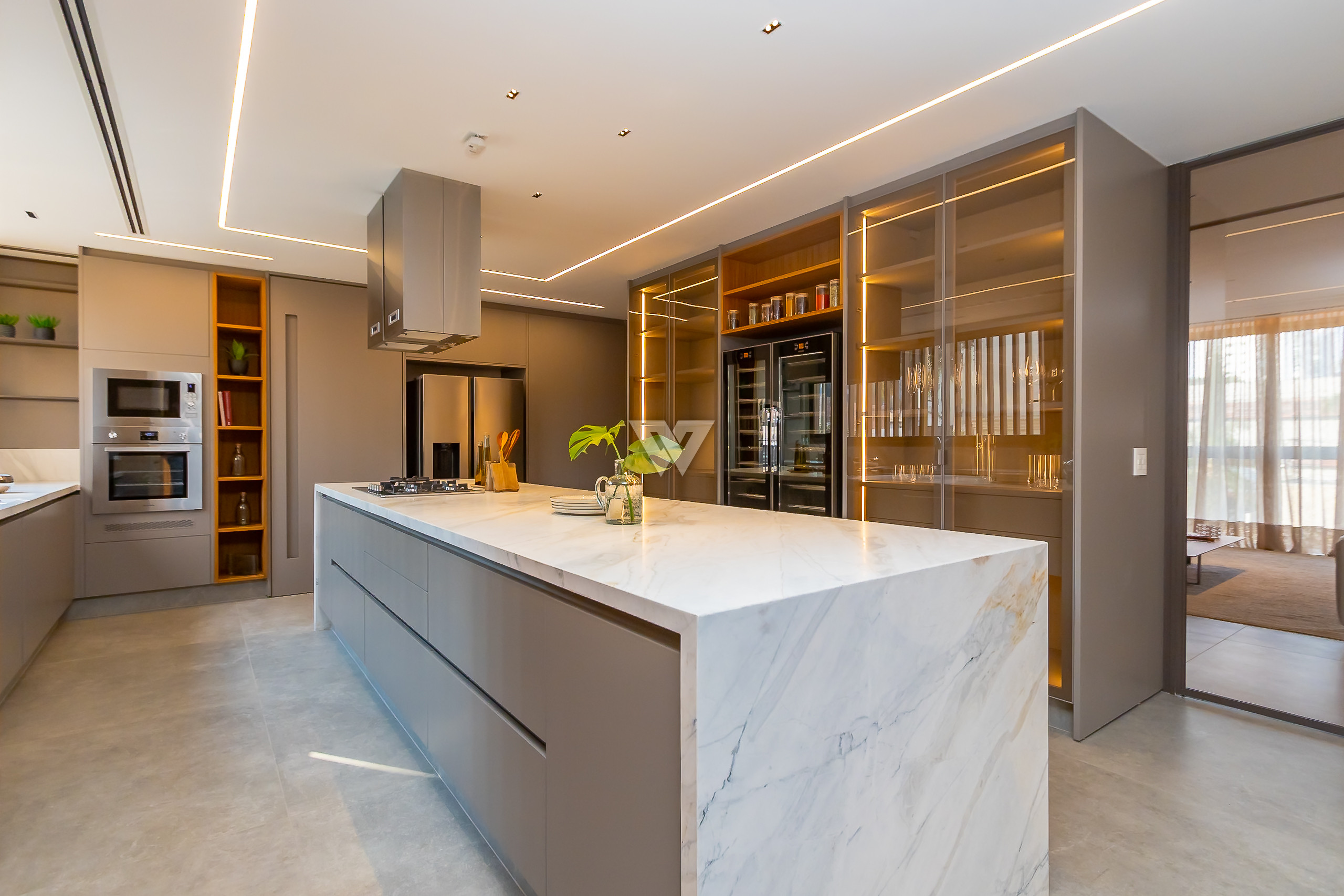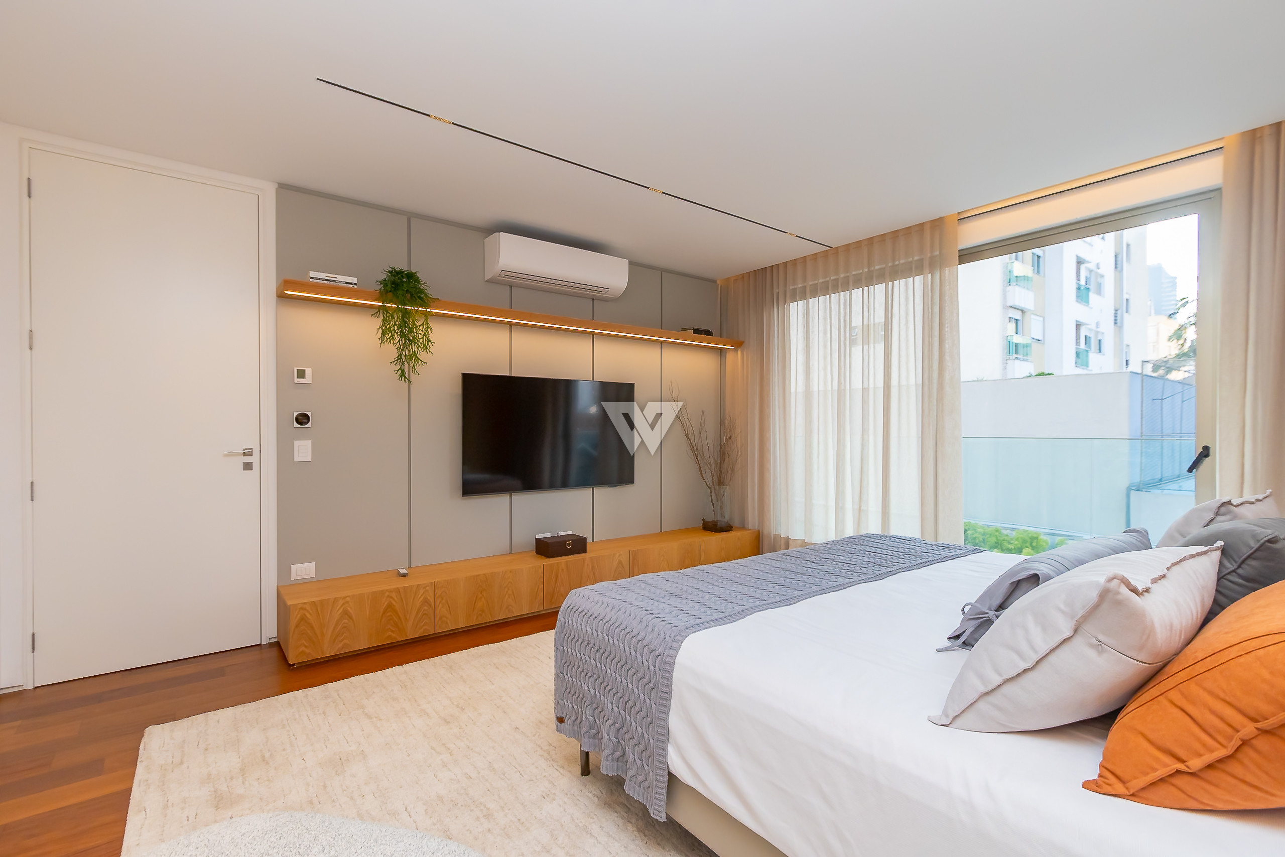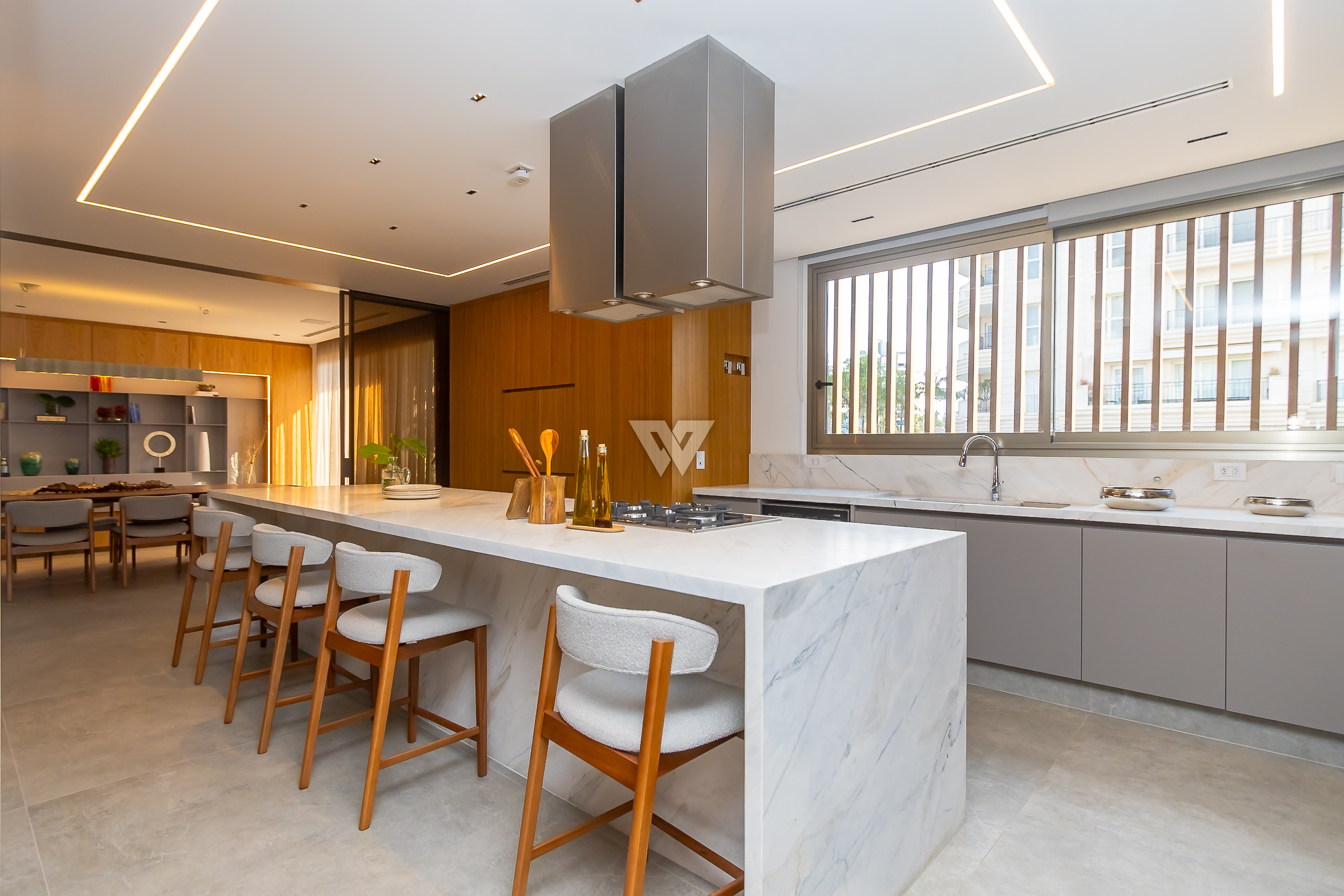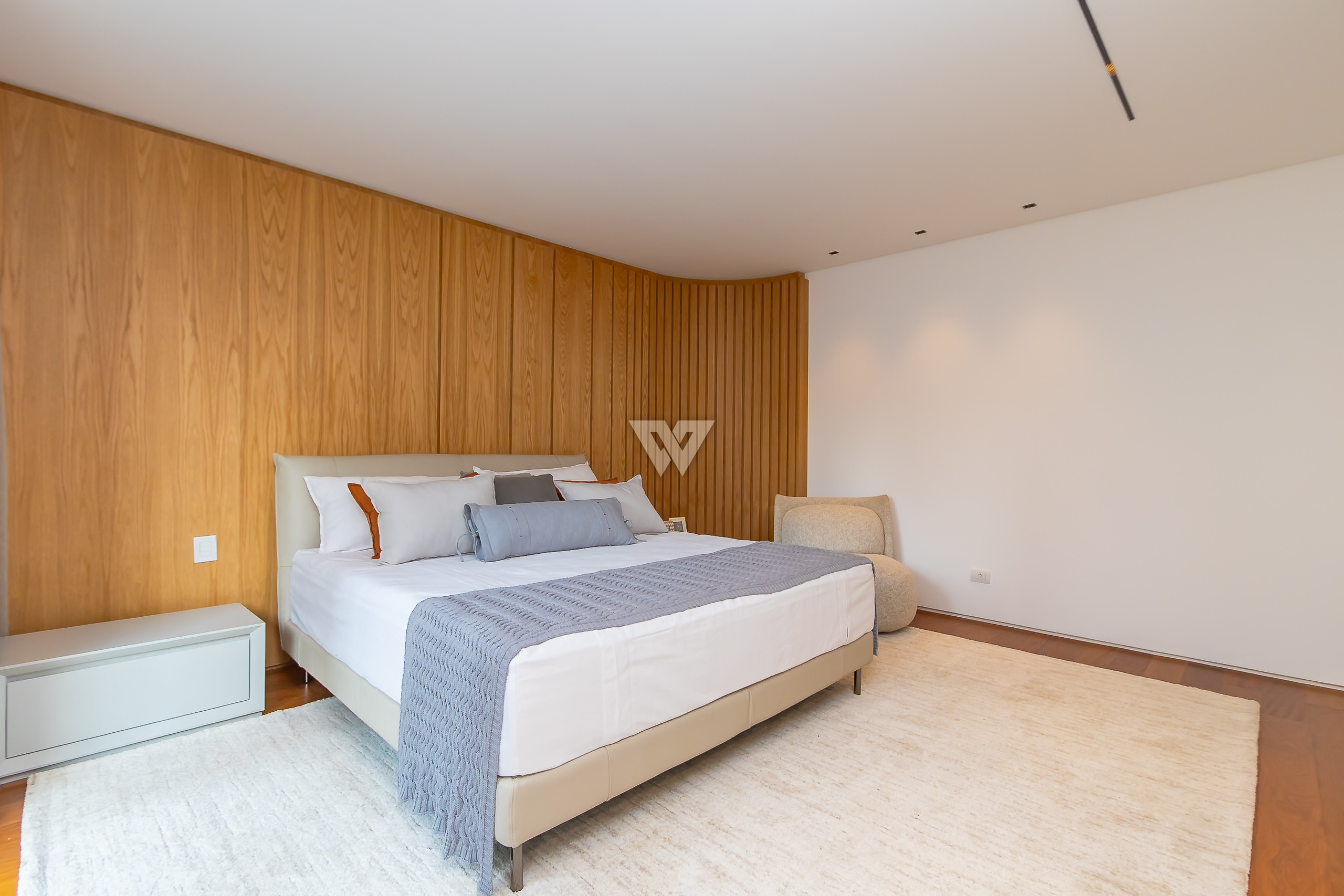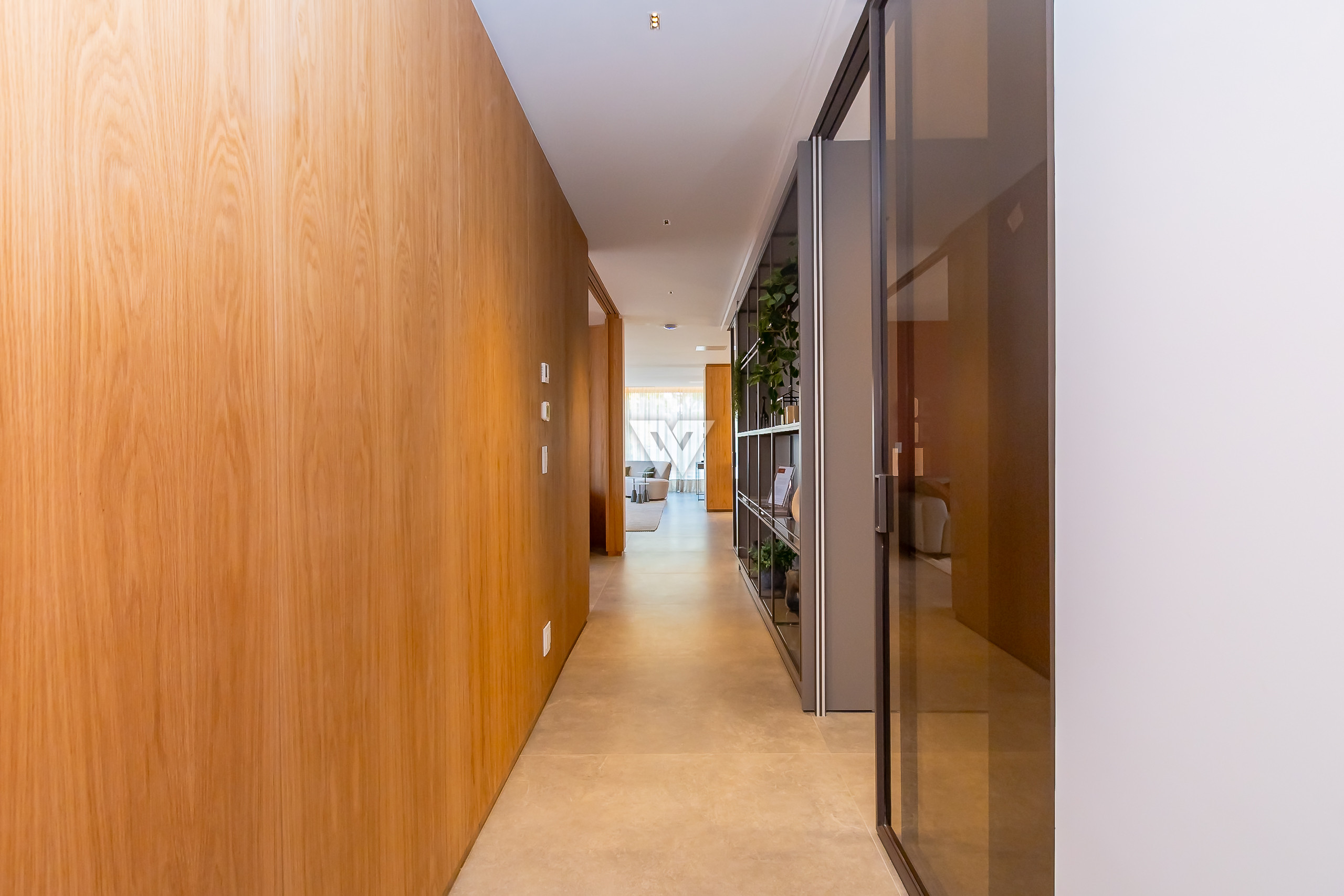 Possui como divisão interna sala para 3 ambientes, cozinha planejada com eletrodomésticos e armários, lavabo, área de serviço, banheiro de serviço, área técnica, despensa, 4 suítes sendo uma máster, piso em todos os ambientes.