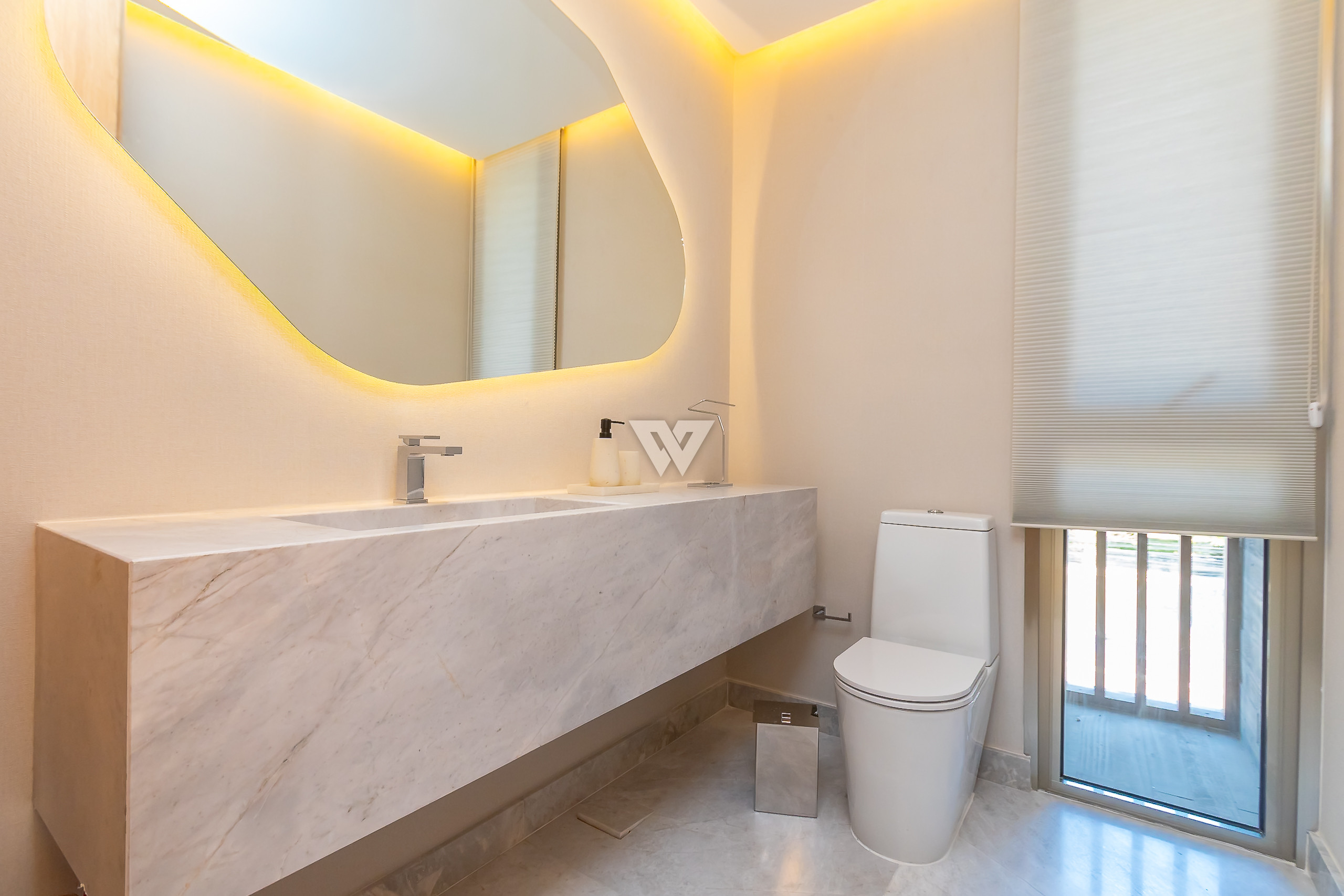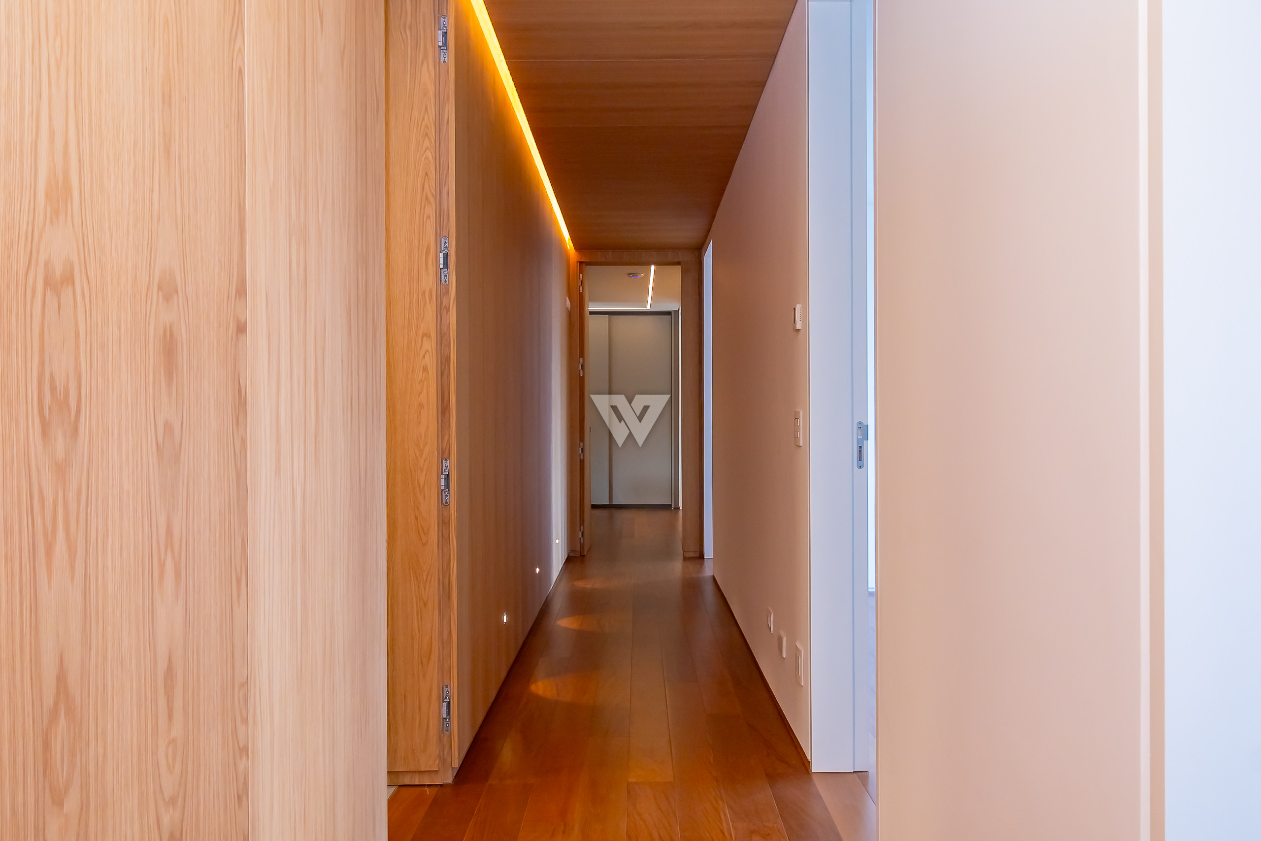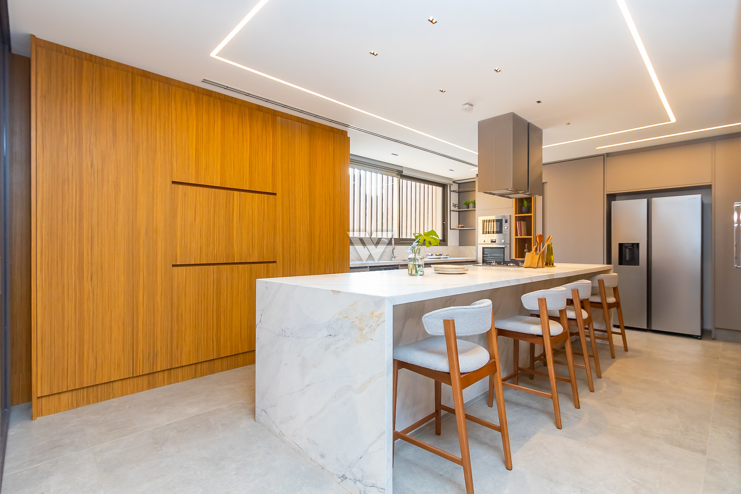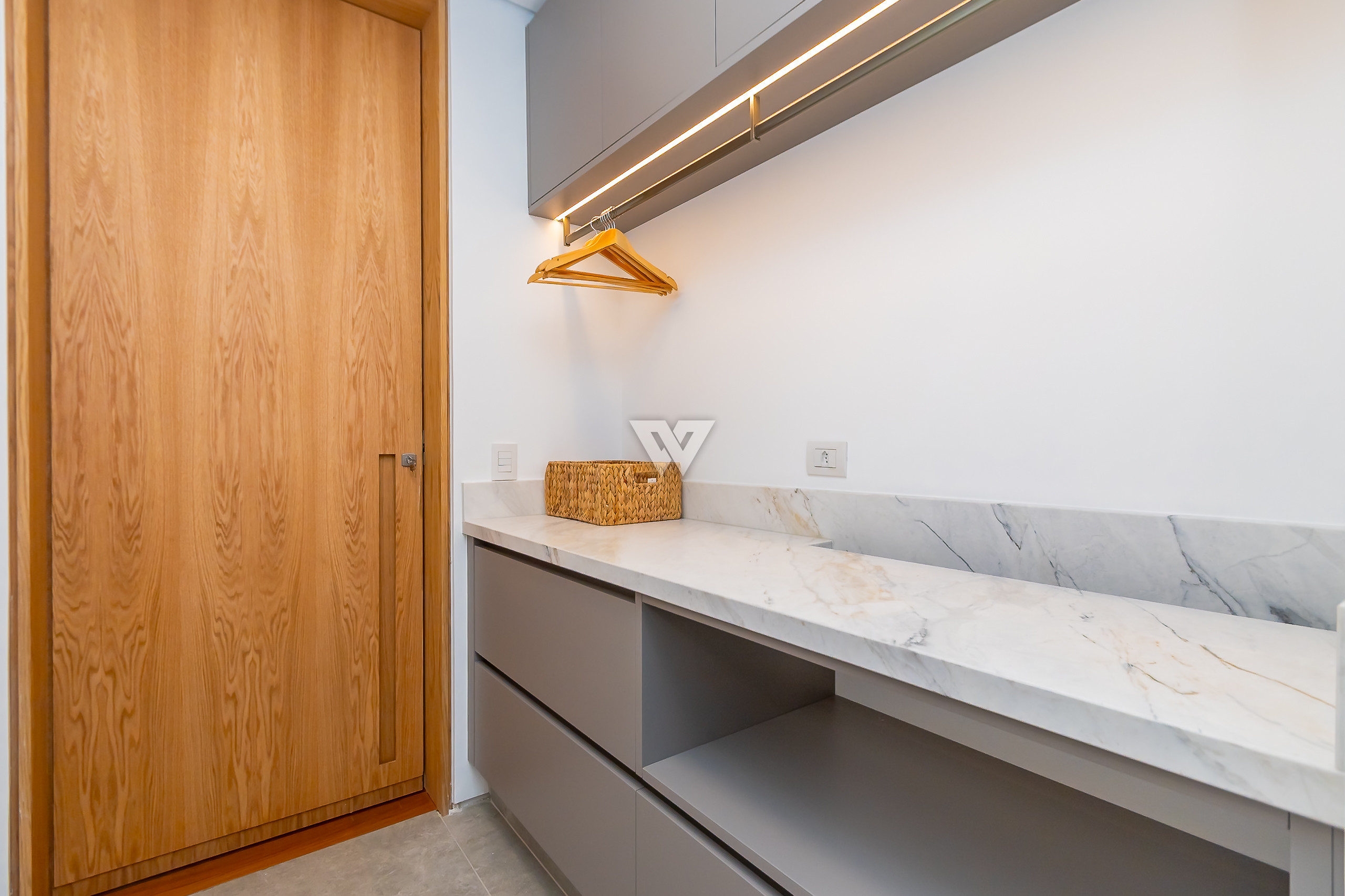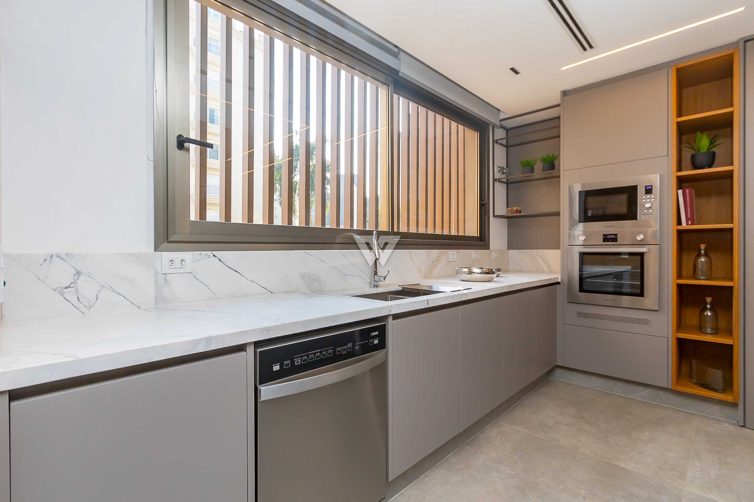 Possui como divisão interna sala para 3 ambientes, cozinha planejada com eletrodomésticos e armários, lavabo, área de serviço, banheiro de serviço, área técnica, despensa, 4 suítes sendo uma máster, piso em todos os ambientes.