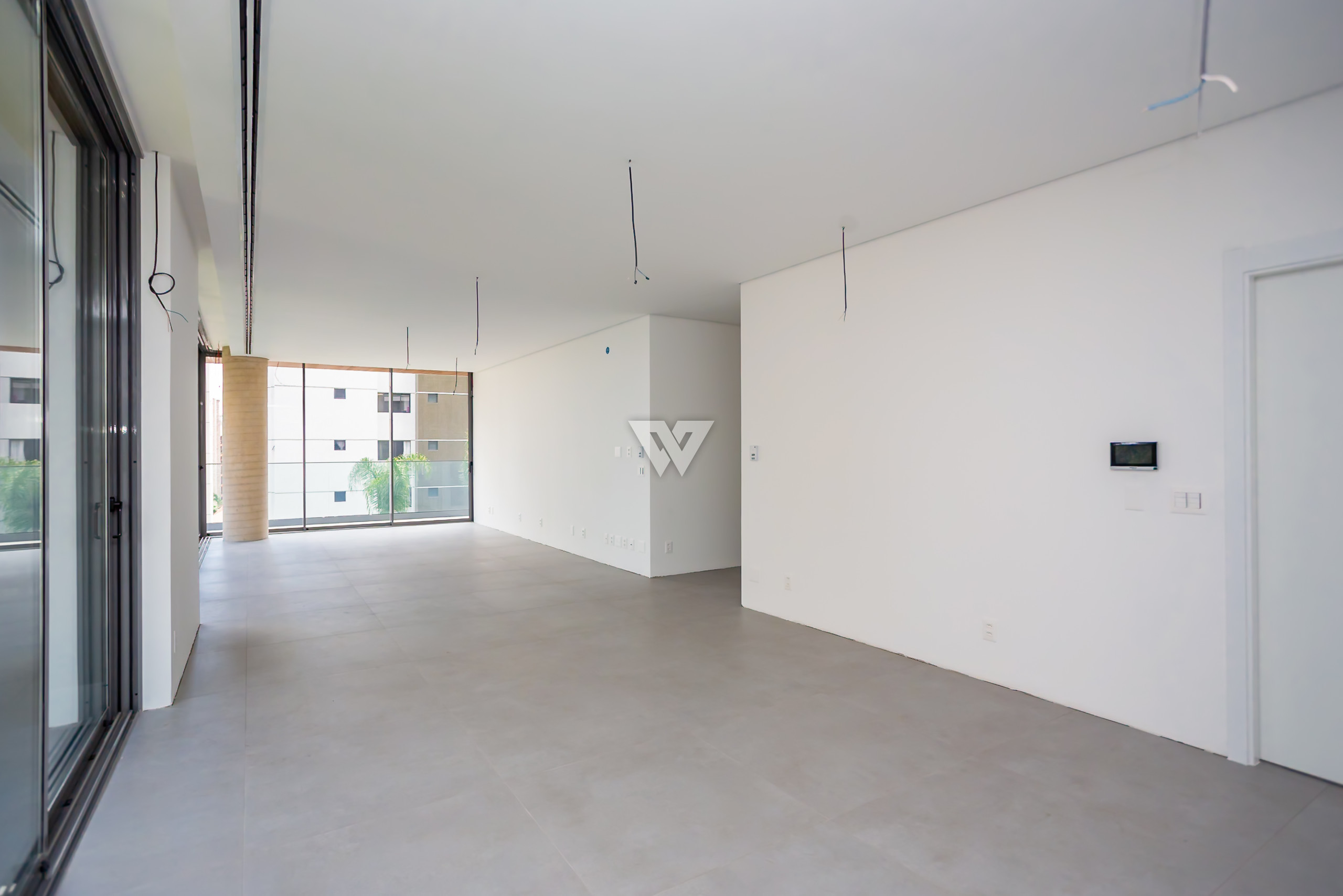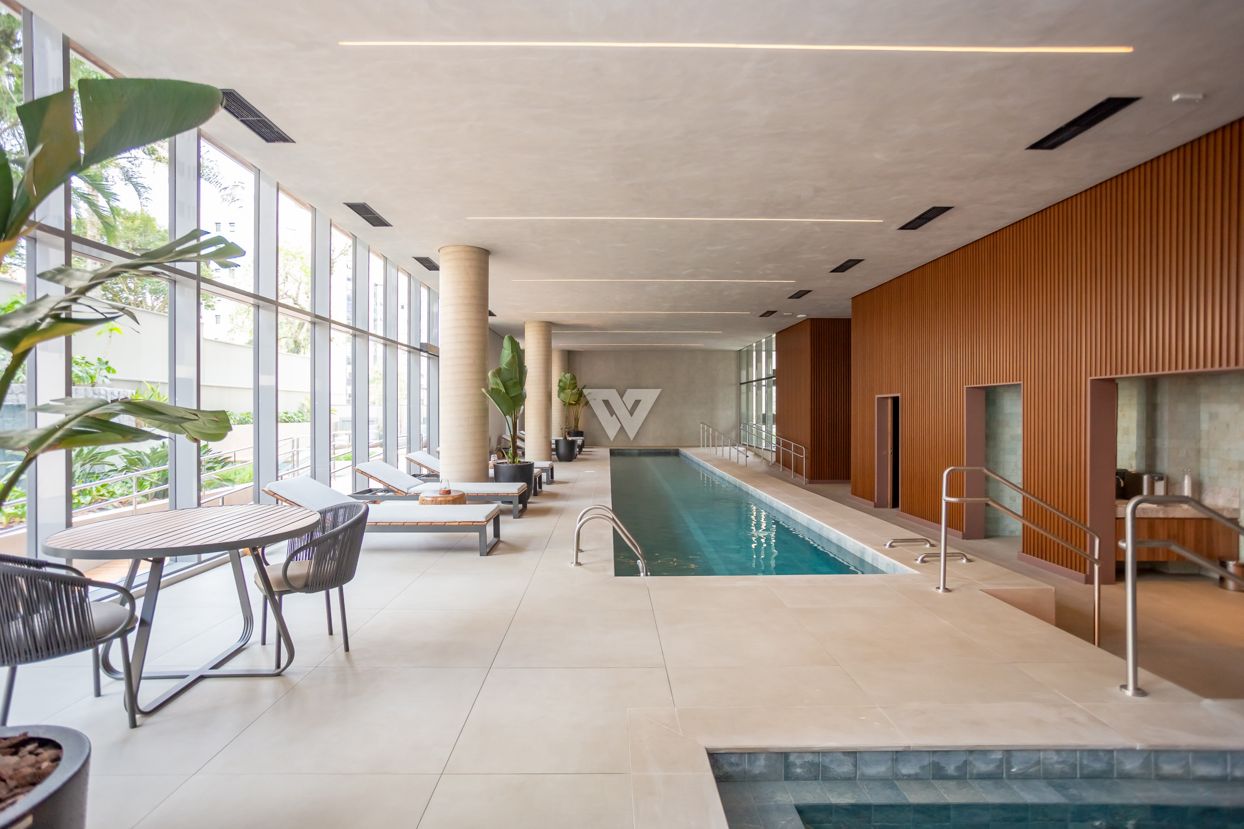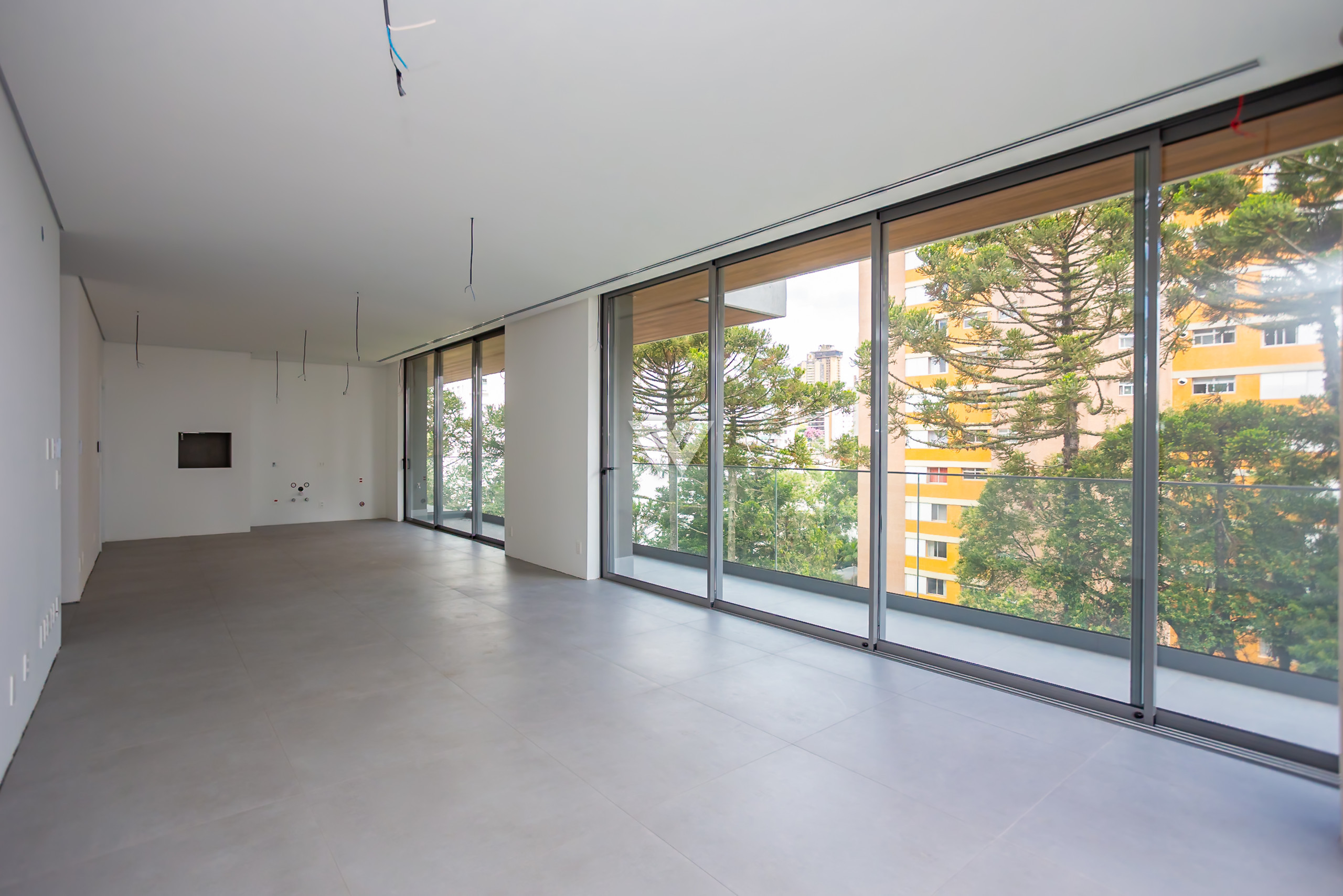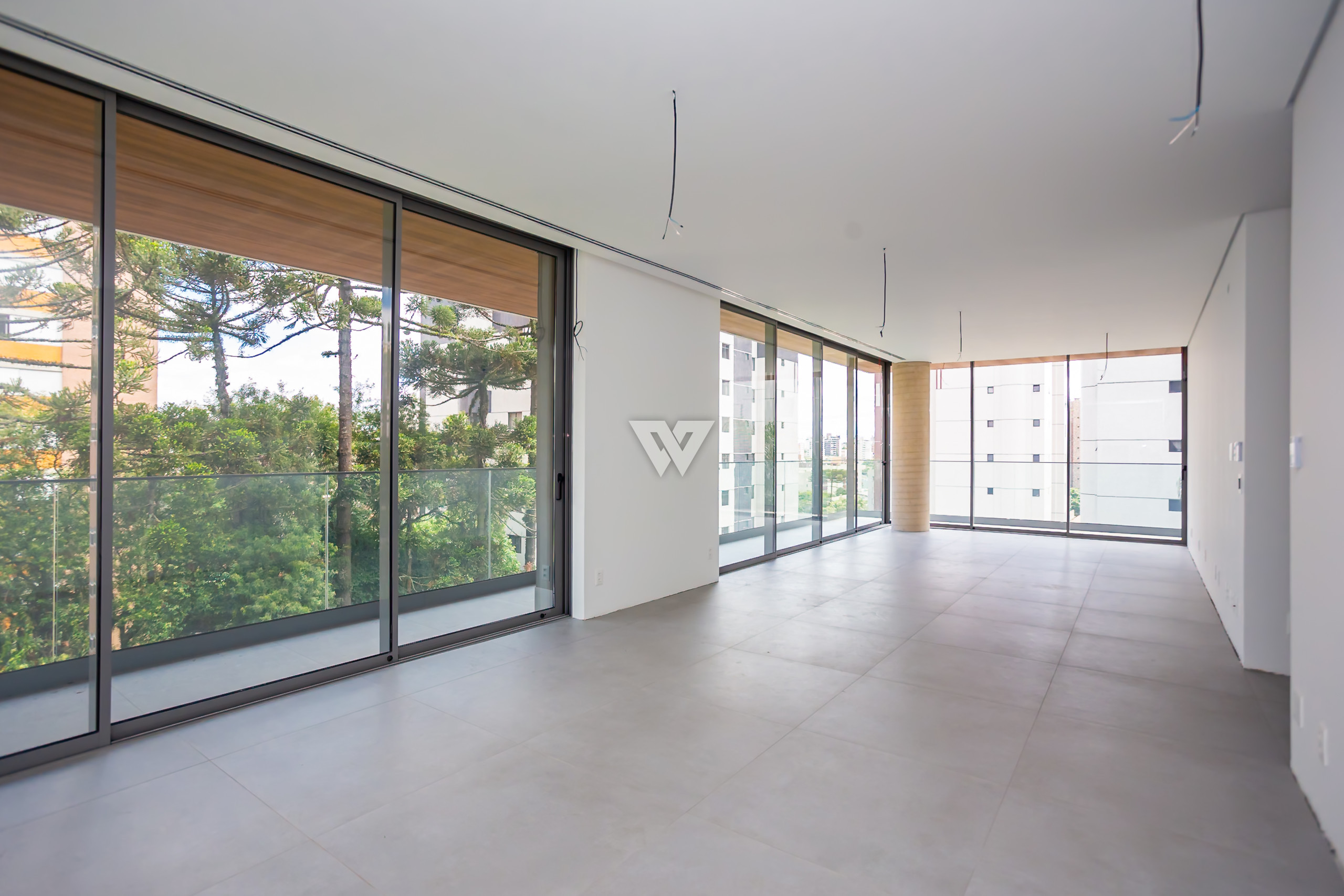 Esquadrias piso-teto de alto desempenho termoacústico e pé-direito elevado.