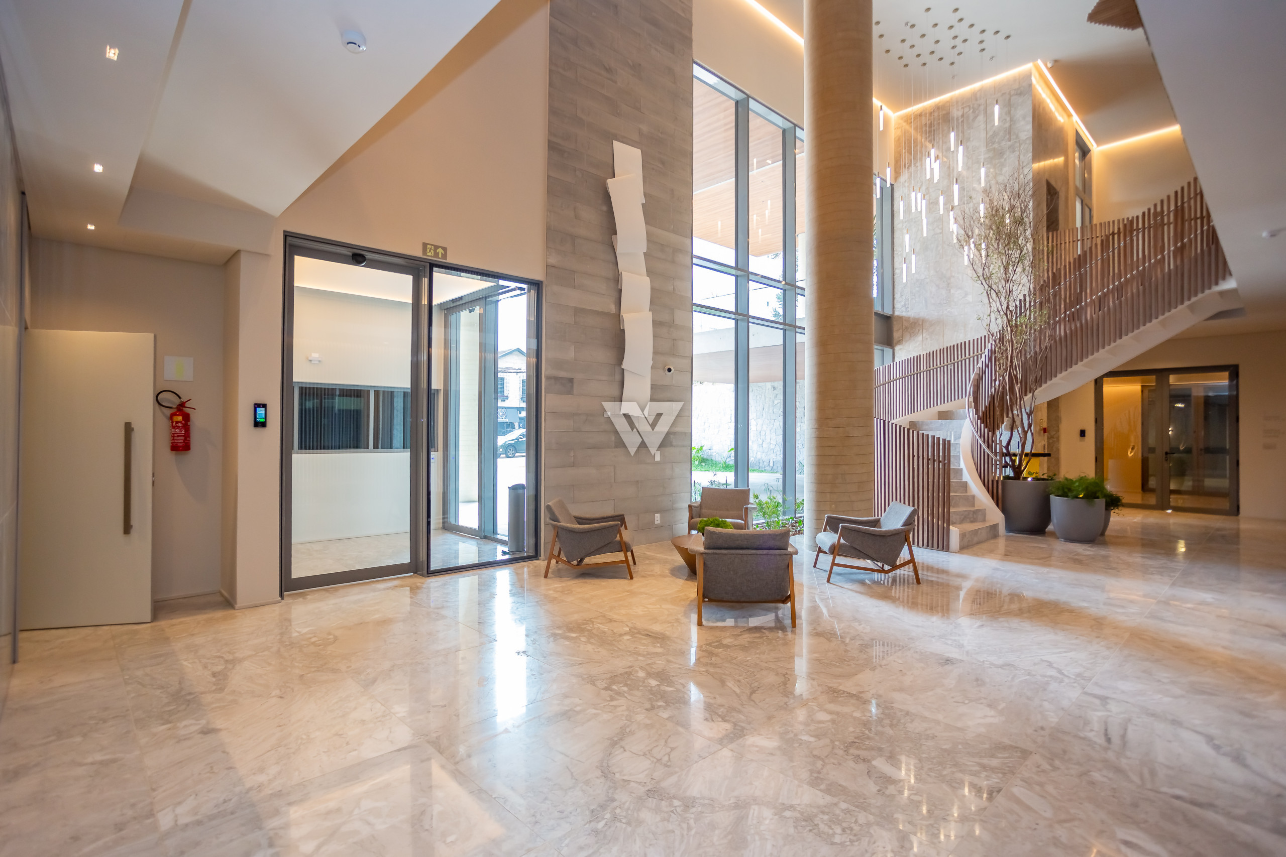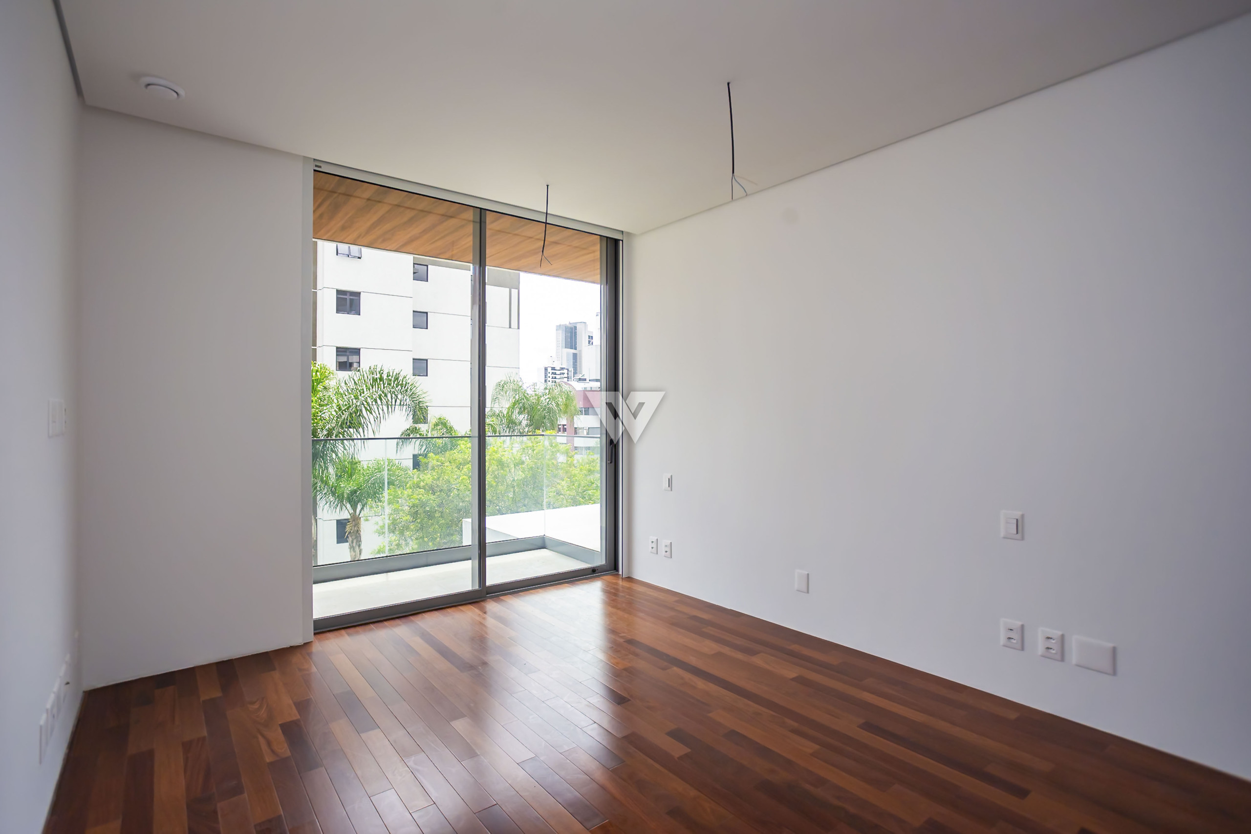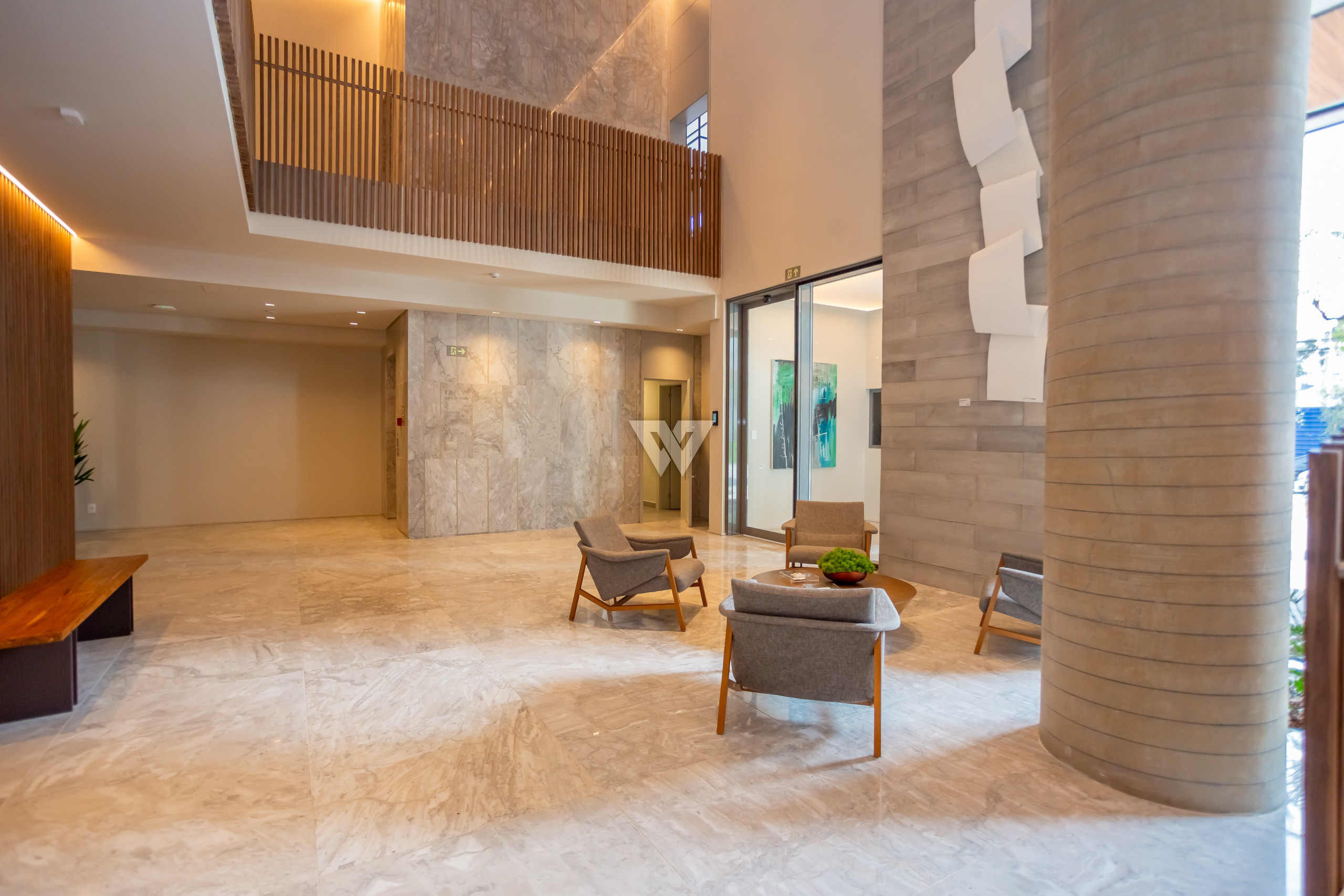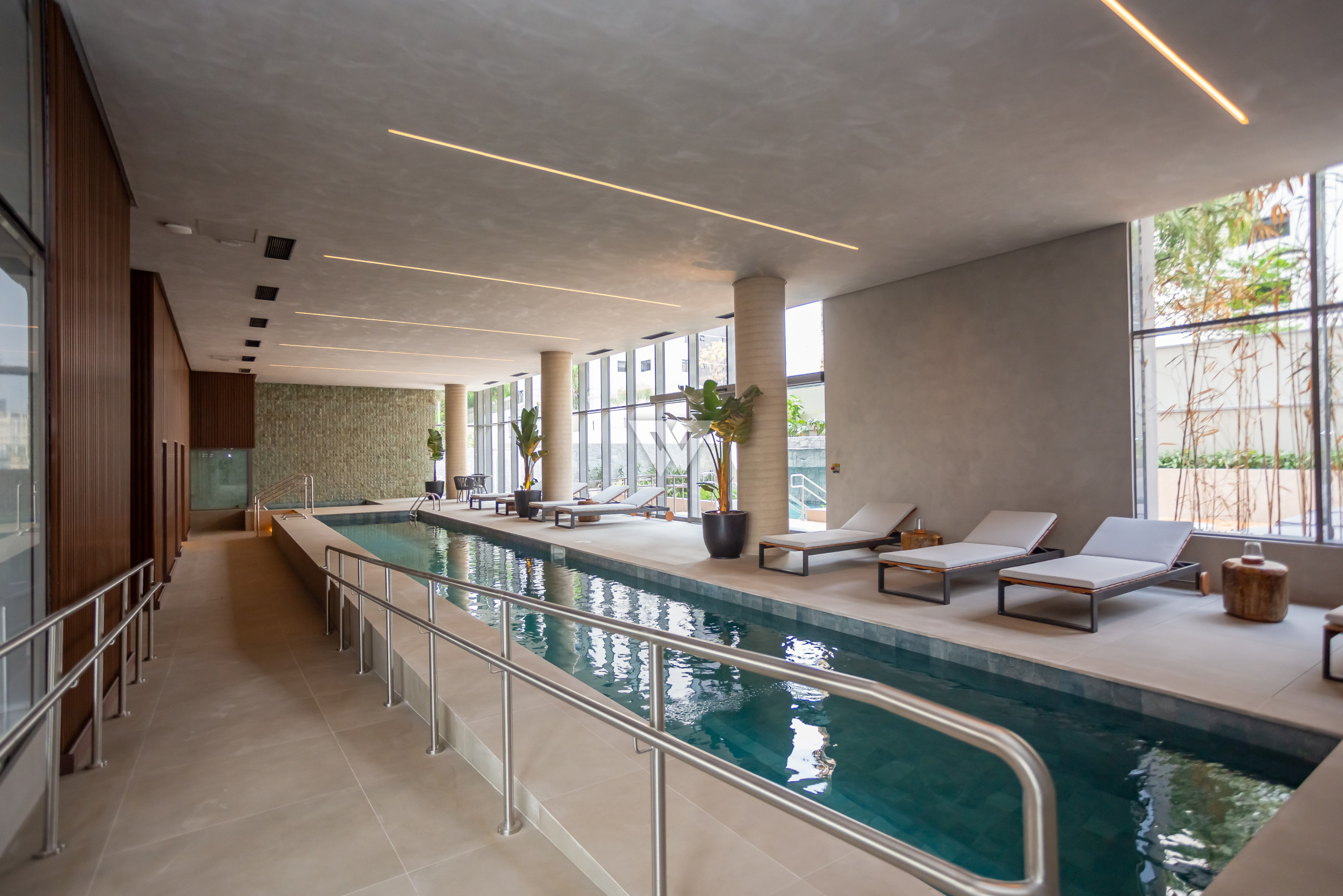 Esquadrias piso-teto de alto desempenho termoacústico e pé-direito elevado.