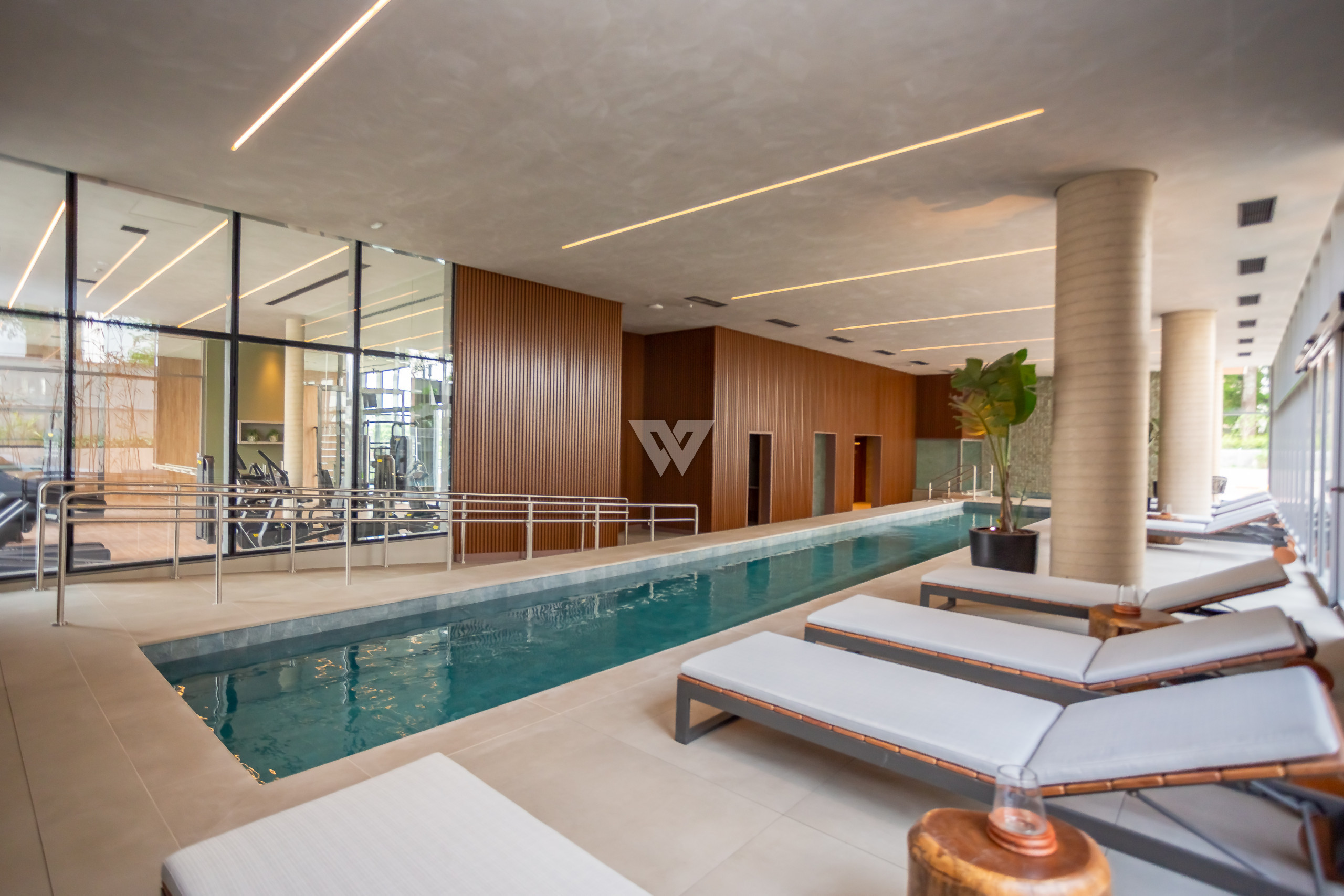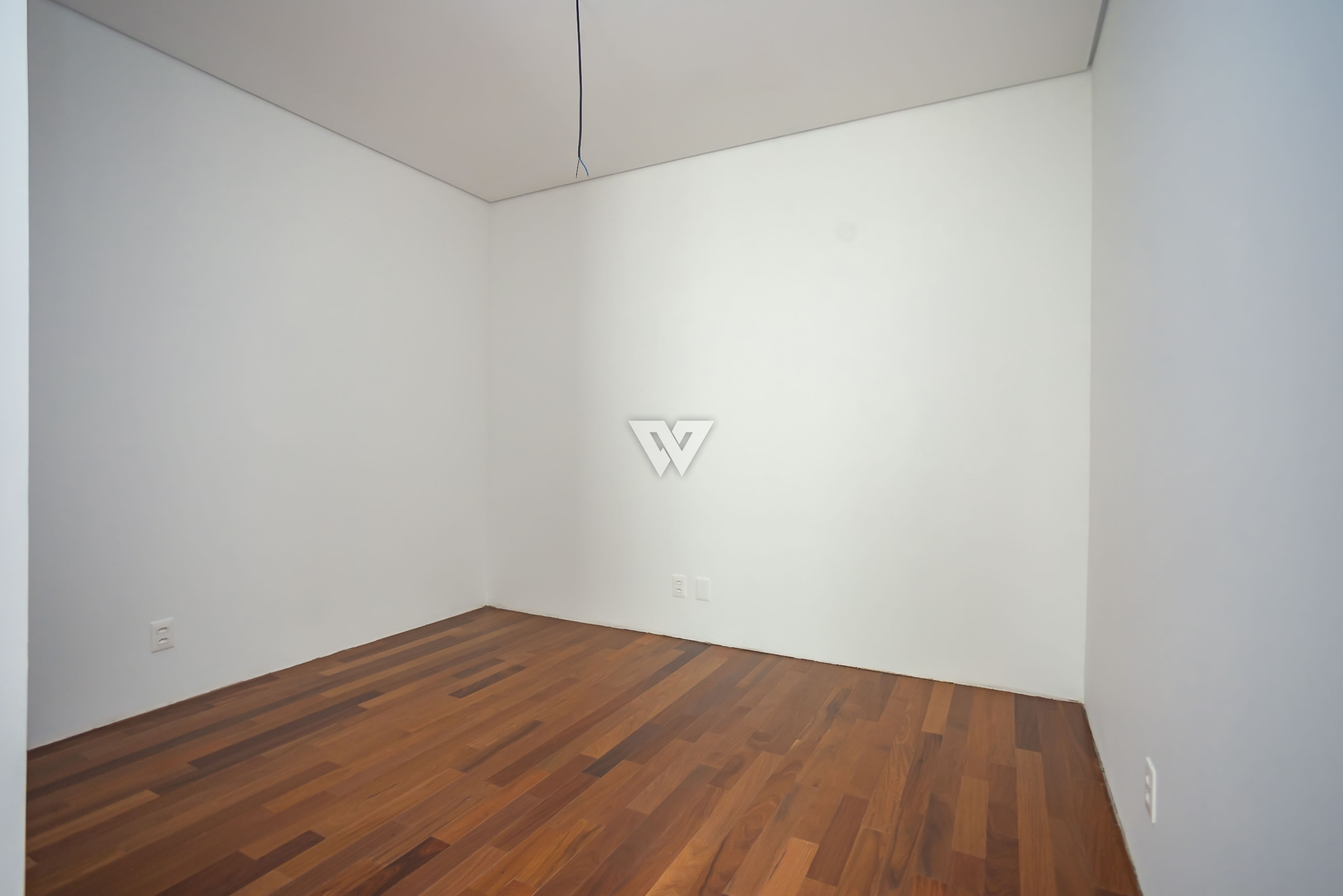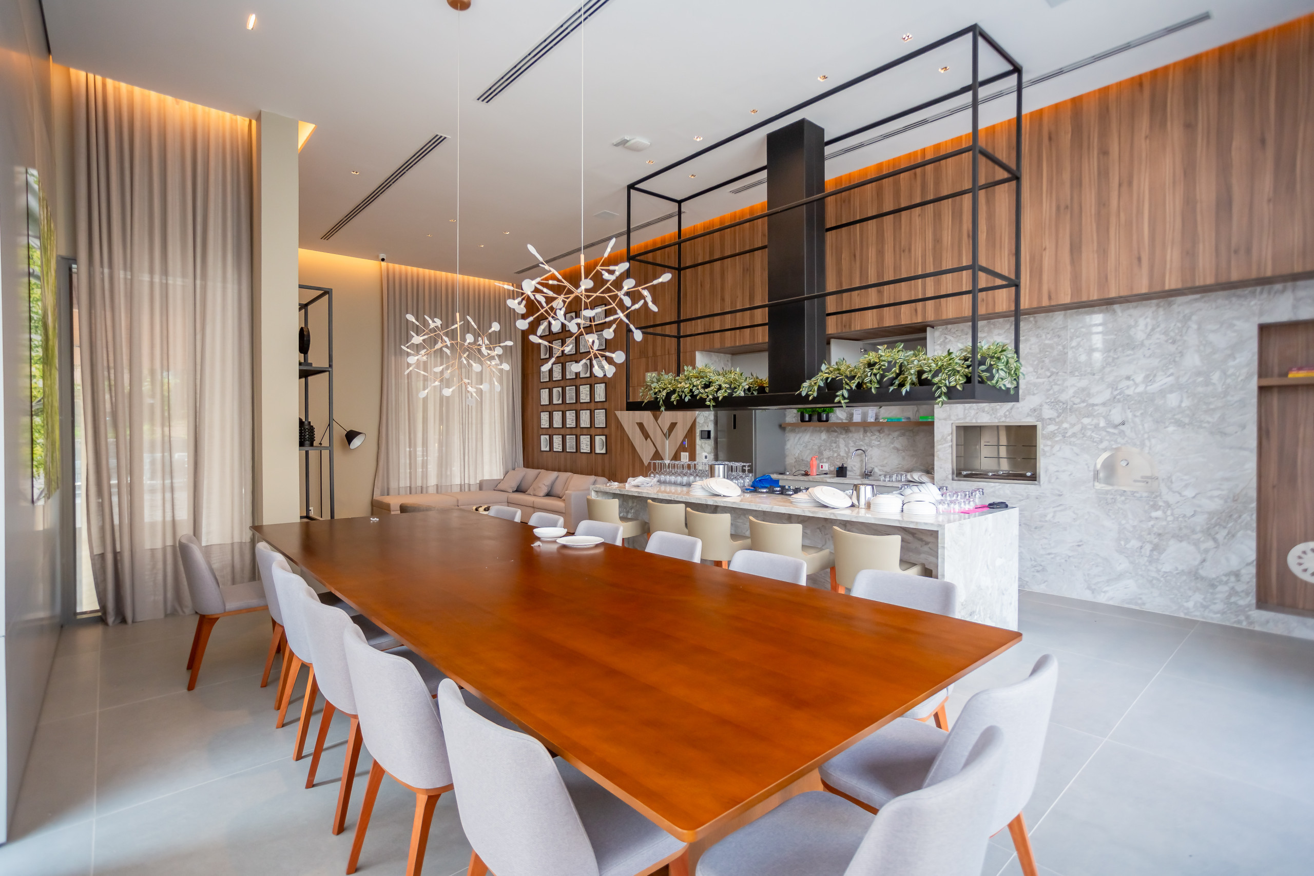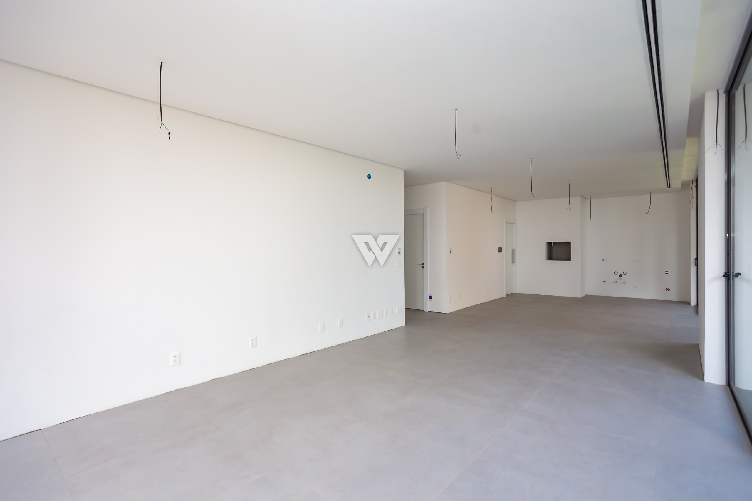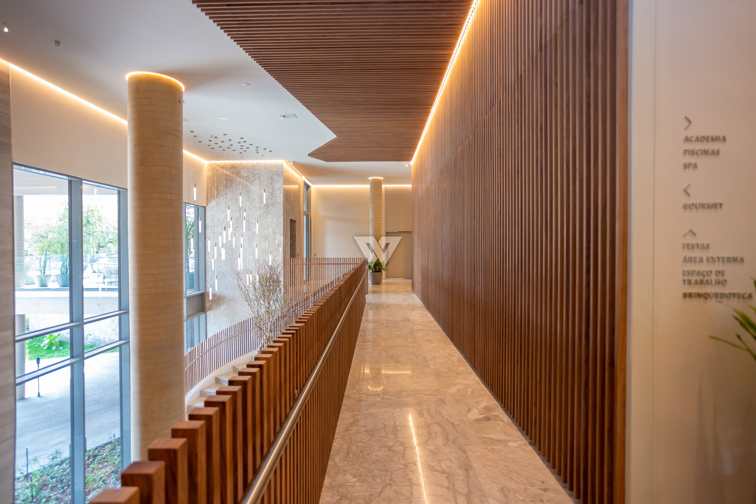 Porcelanato 90x90 nas áreas sociais e madeira engenheirada nas suítes.