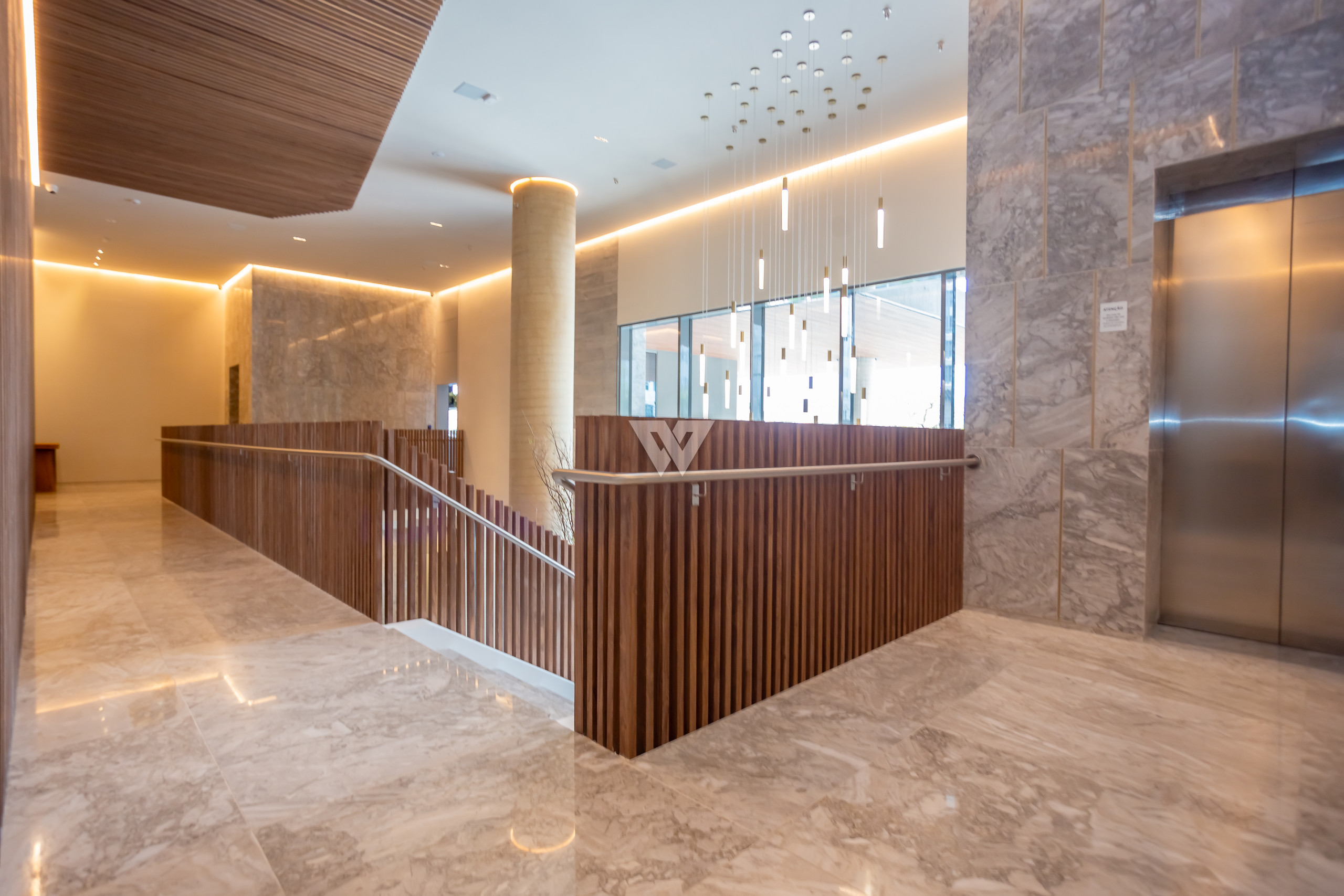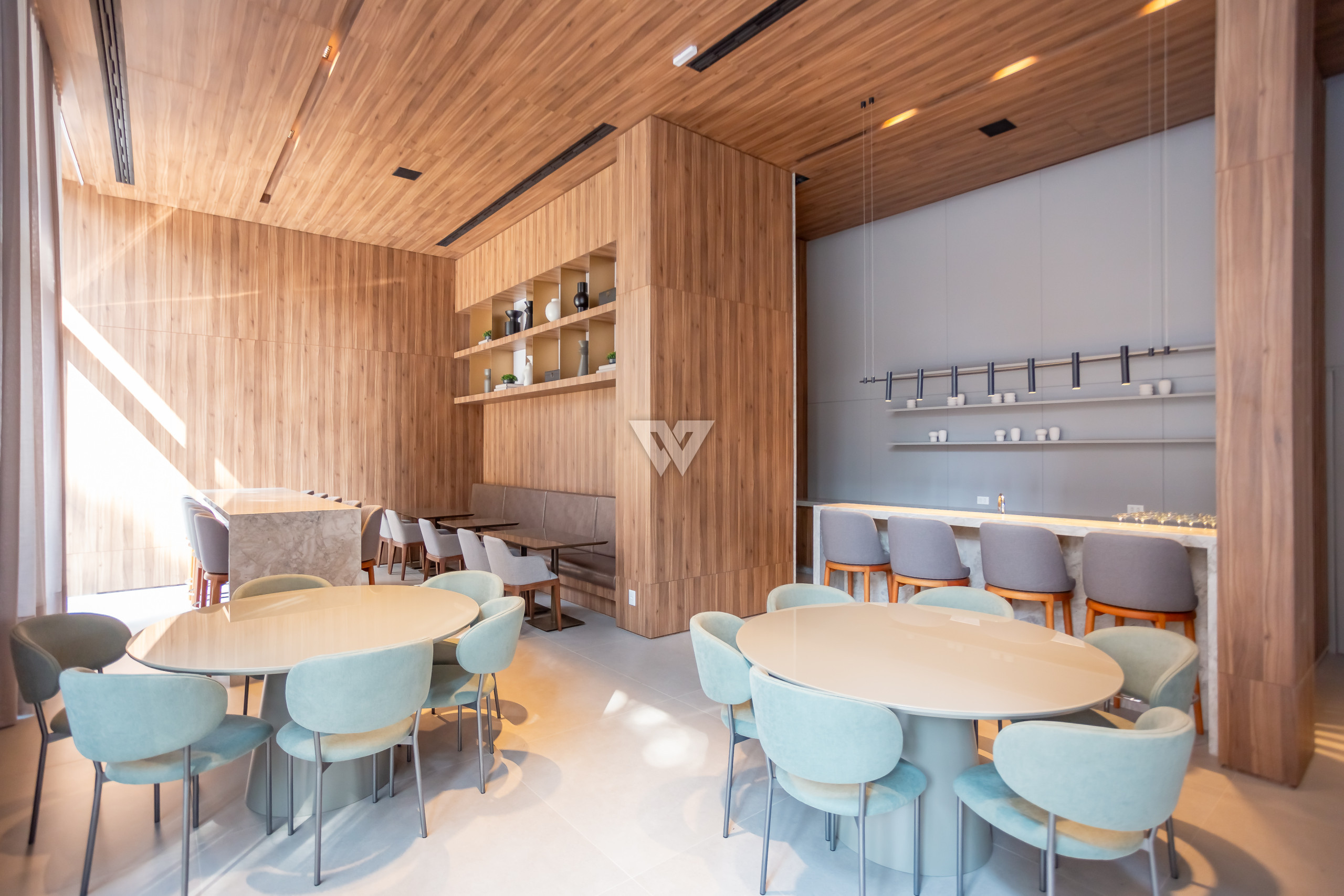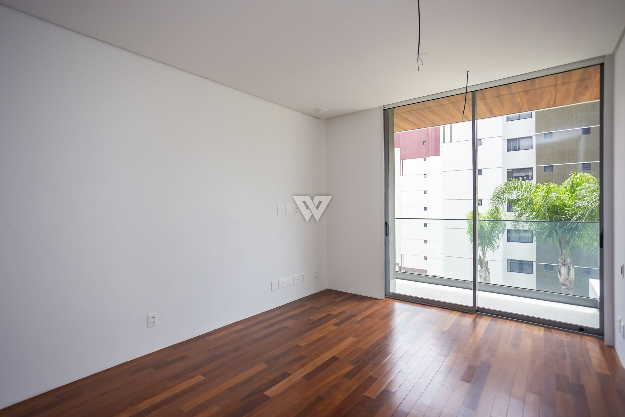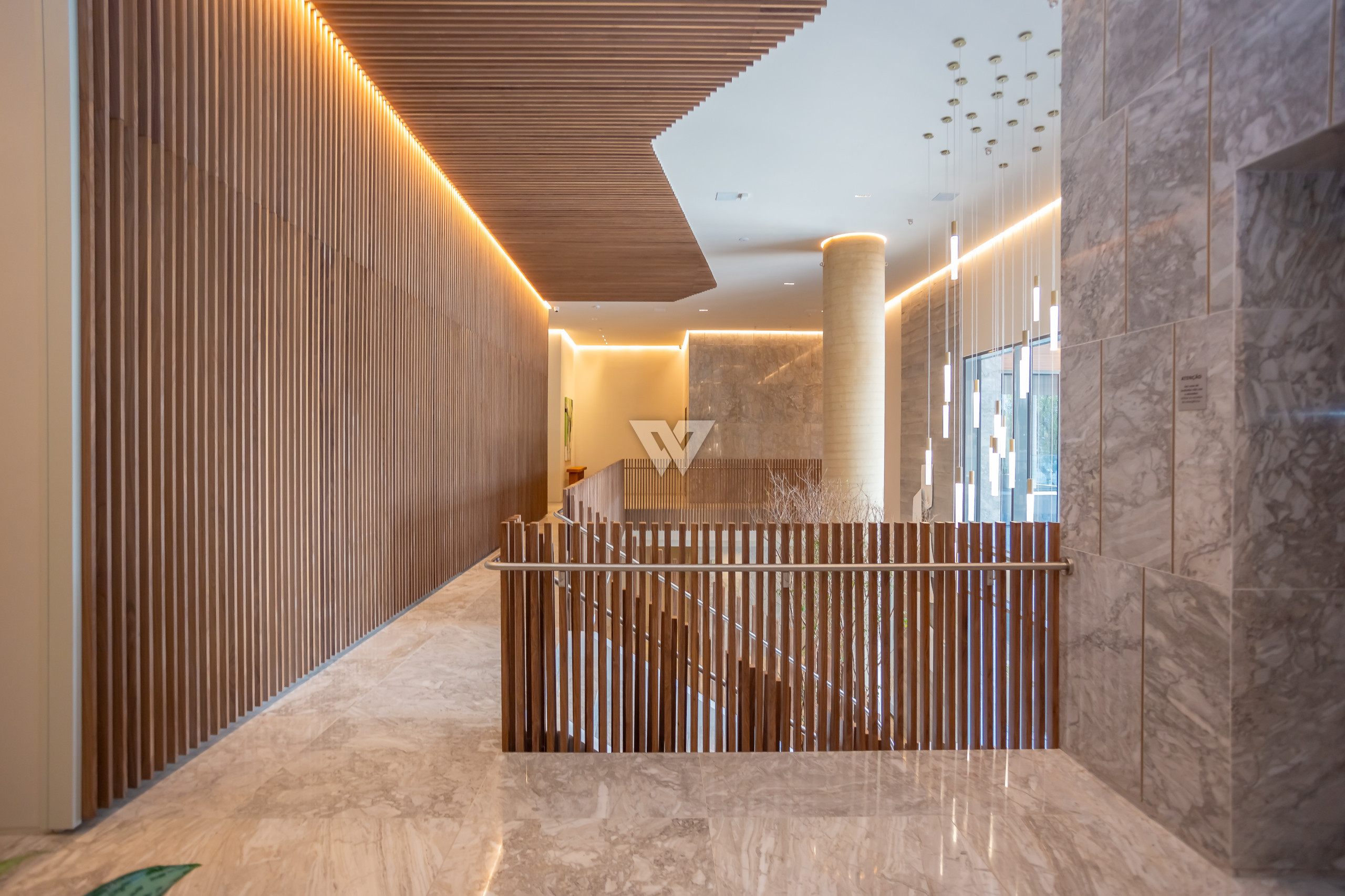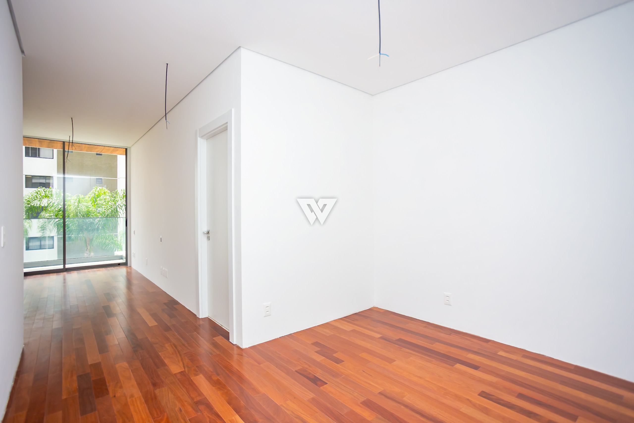 Porcelanato 90x90 nas áreas sociais e madeira engenheirada nas suítes.