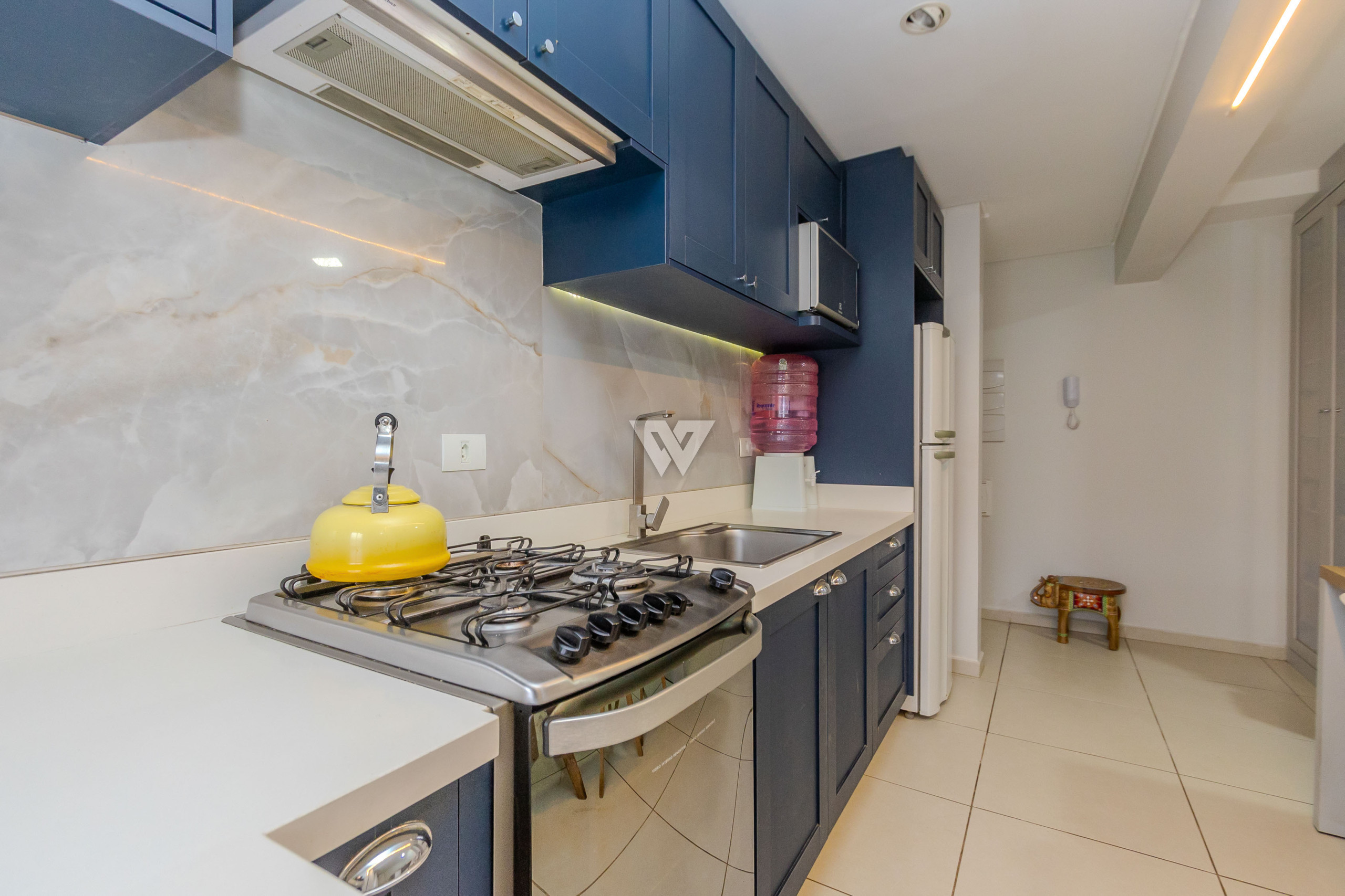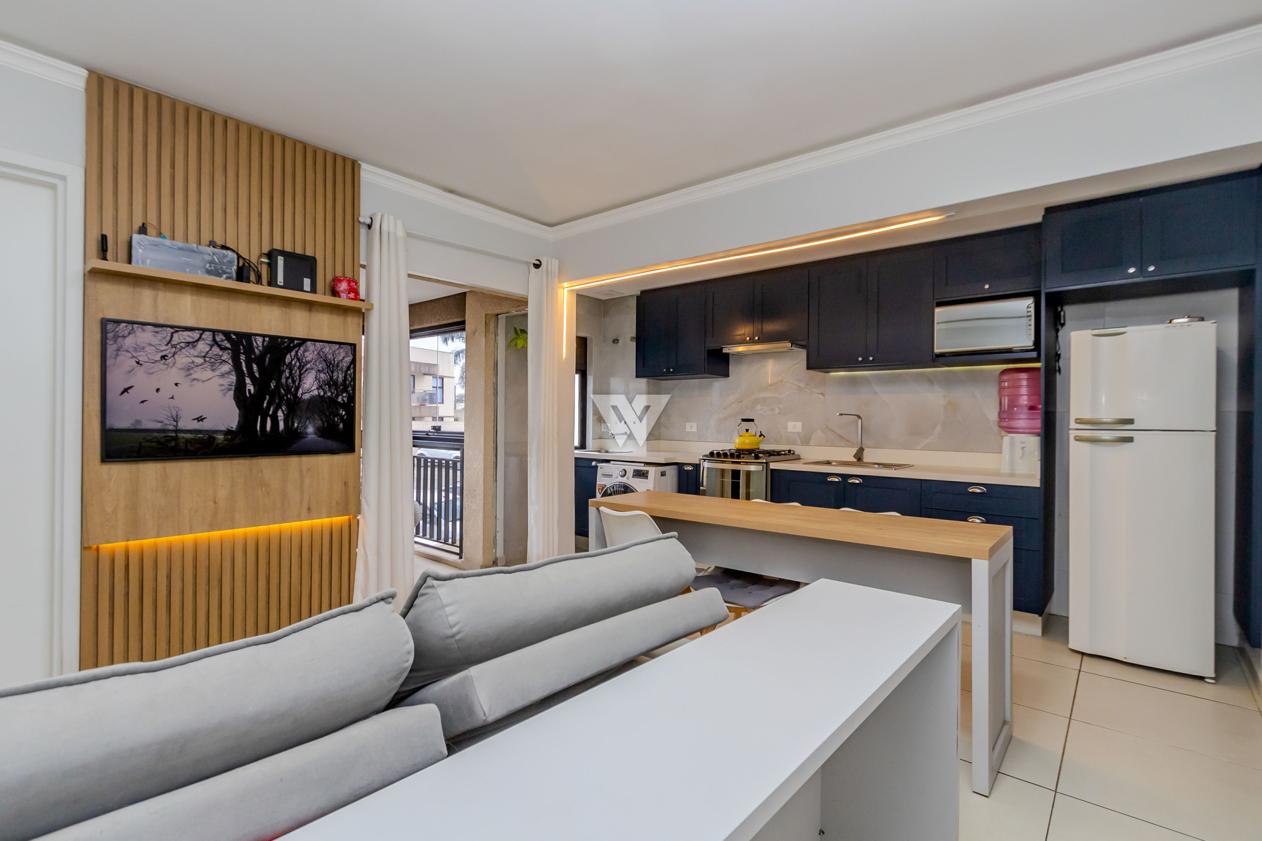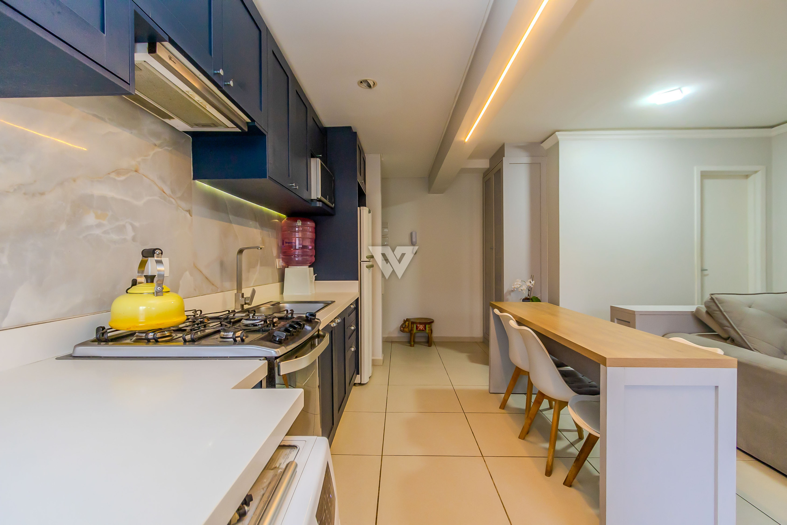 Lindo apartamento de 2 quartos e churrasqueira á carvão com uma cozinha elegante e equipada.