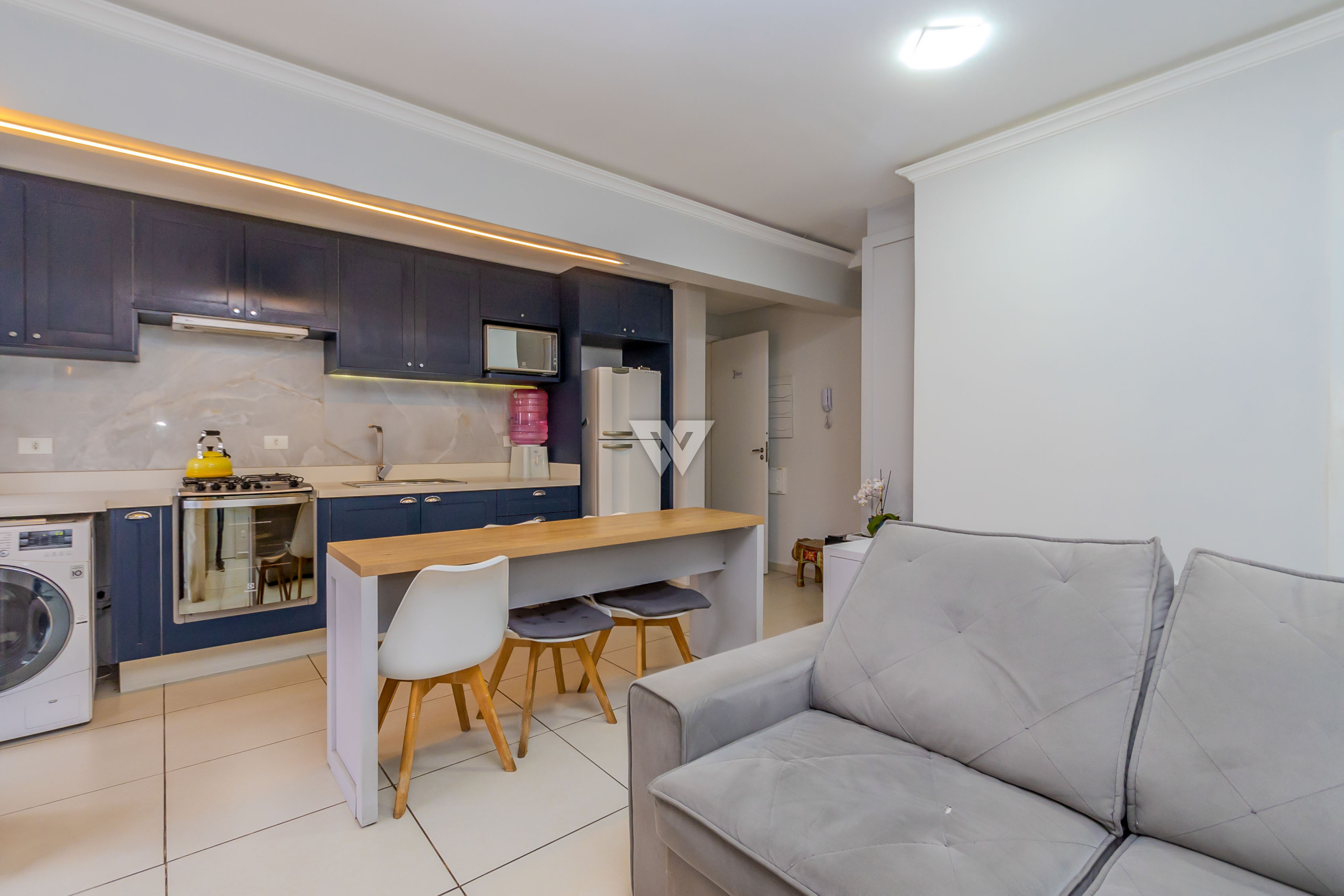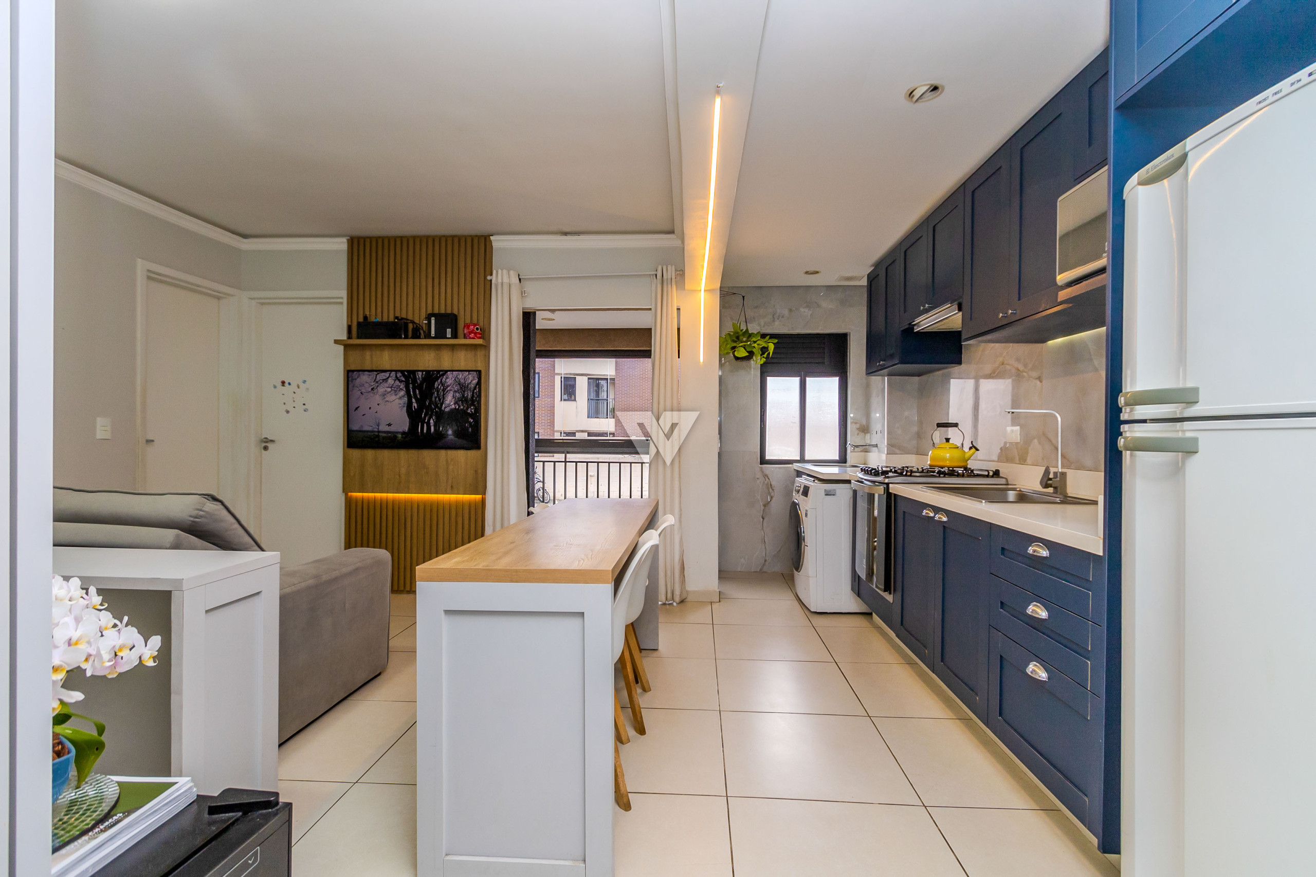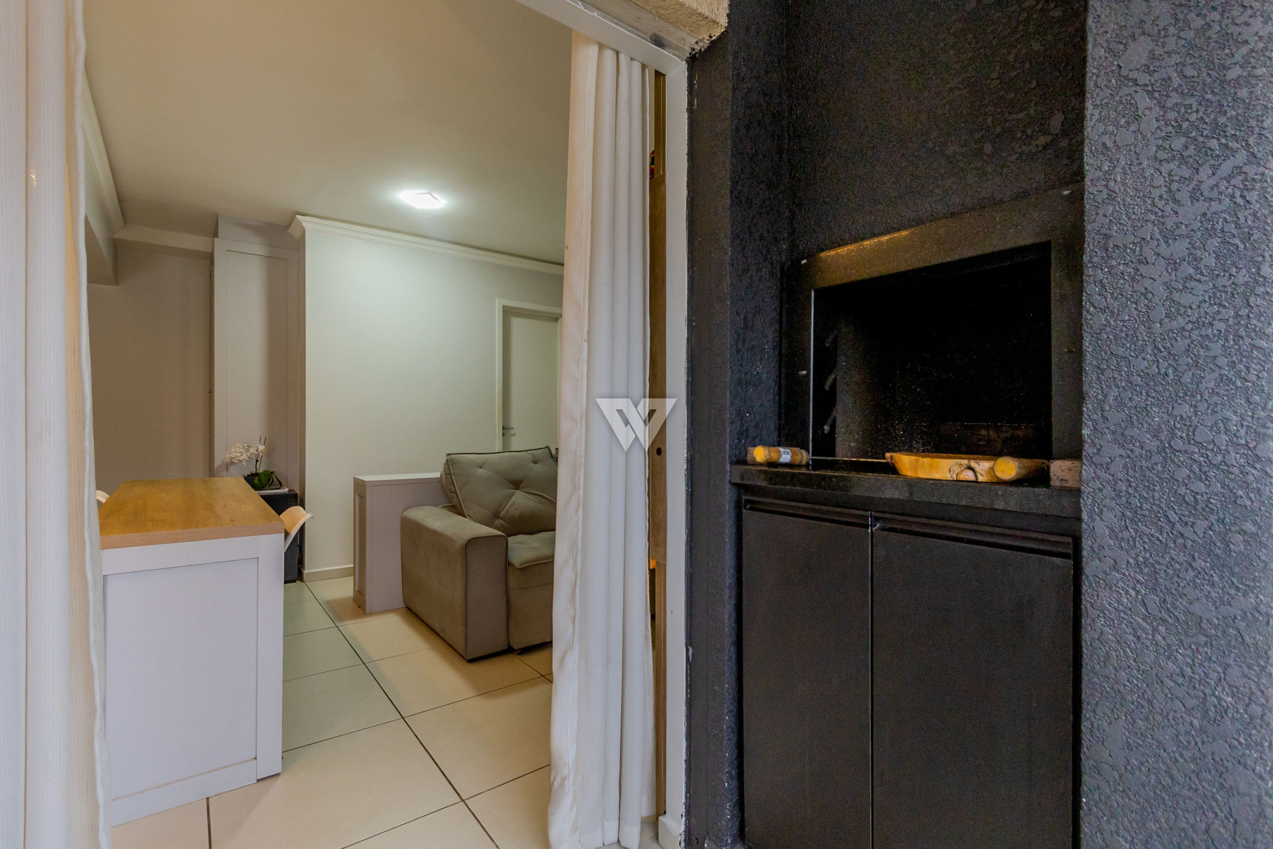 Lindo apartamento de 2 quartos e churrasqueira á carvão com uma cozinha elegante e equipada.