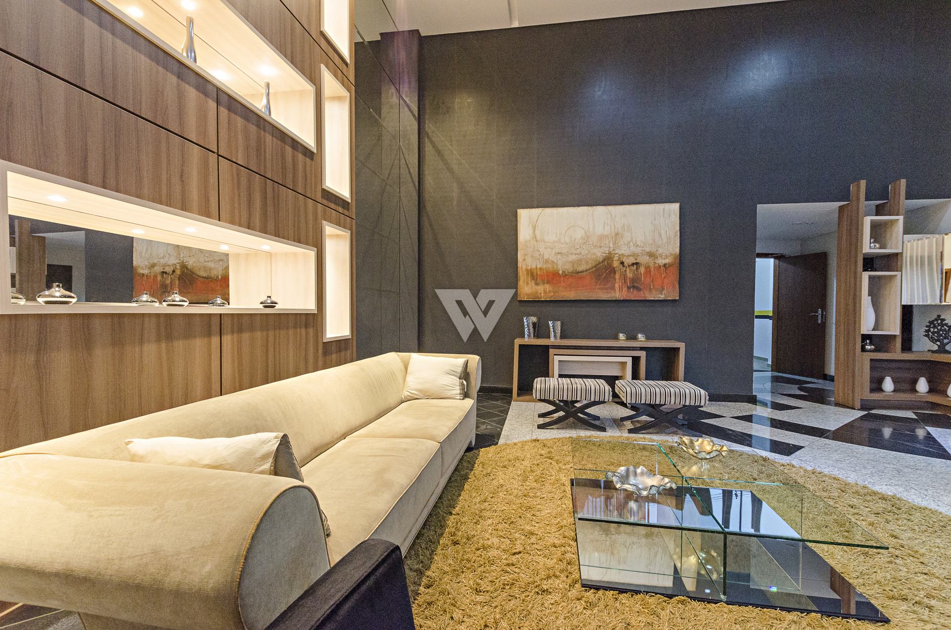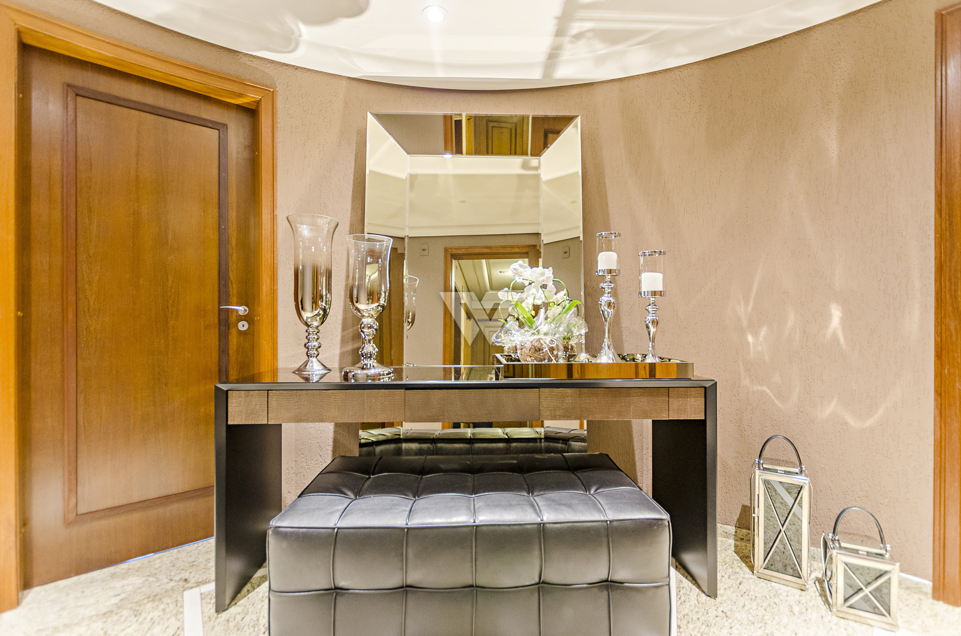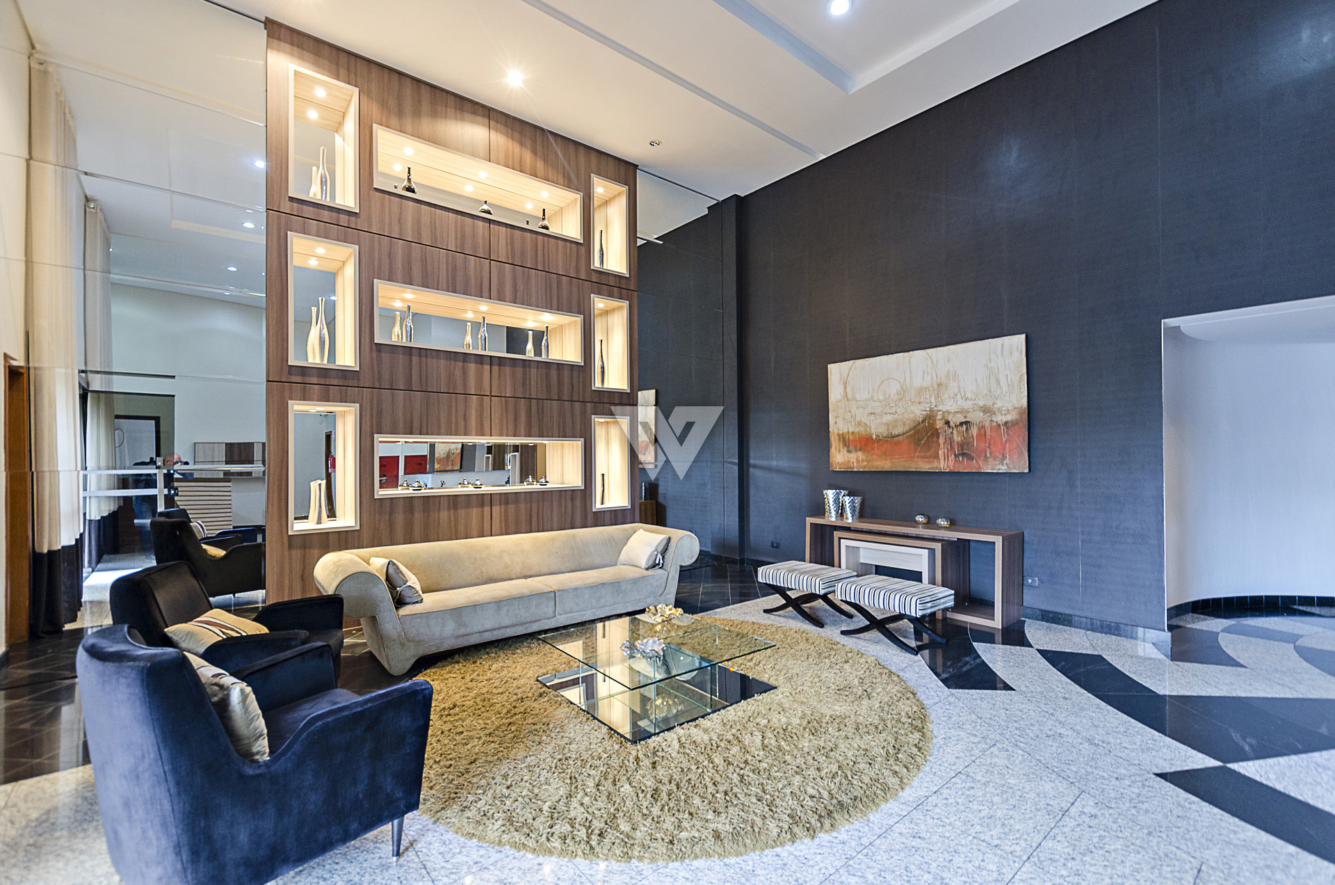 ; SALA ÍNTIMA: Piso em laminado de madeira, painel para TV com 1 prateleira e 2 gavetas, balcão com 4 portas, nichos para garrafas de bebidas, espelho, ar condicionado Split; LAVABO (BWC): Piso em granito, box Blindex, pia com tampo em granito, armário, espelho, iluminação embutida;
