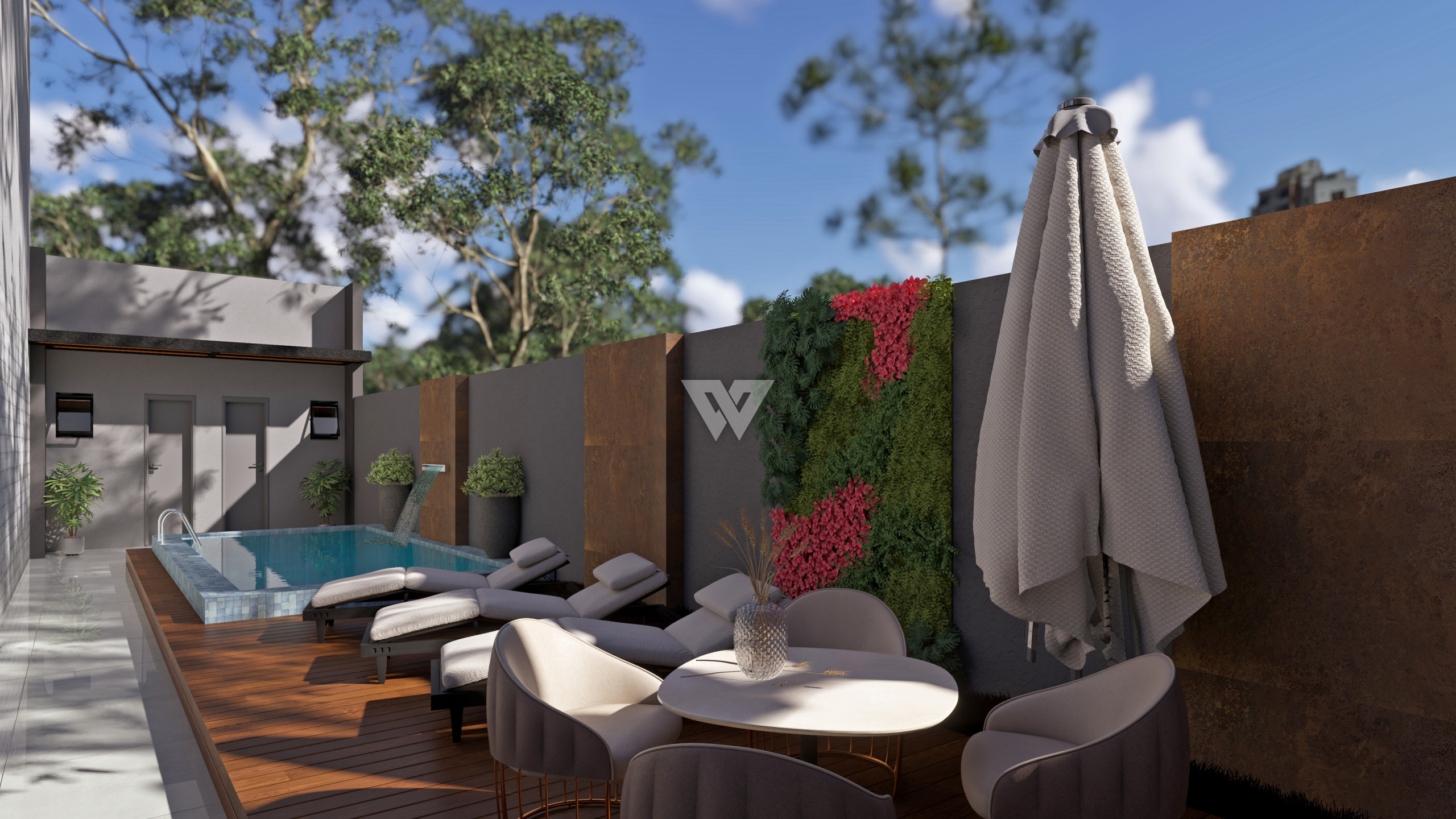 São 3 amplas suítes, sendo a suíte master com closet, sacada, pia e chuveiros duplos. Venezianas automatizadas e infra estrutura para ar condicionado em todos os quartos. Lving integrado com o garden, ampla sala de jantar, cozinha gourmet e rooftop com spa e churrasqueira, além de 2 vagas de garagem; Possibilidade de conversão do ático em uma quarta suíte.