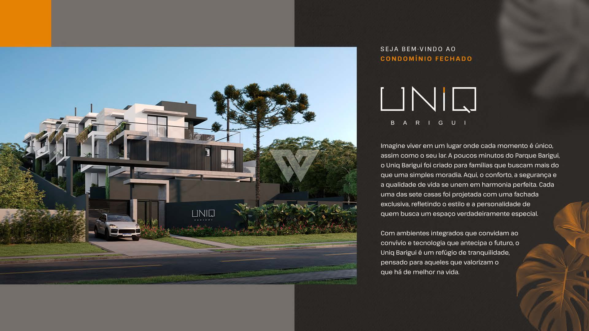 Imagine viver em um lugar onde cada momento é único, assim como o seu lar. Então, esse lugar é o UNIQ BARIGUI. Casas triplex de alto padrão de 186,00 a 226,57m² de área privativa, com 03 dormitórios (01 suíte ou 03 suítes), de 02 a 04 vagas de garagem. Cada uma das sete casas do UNIQ BARIGUI foi projetada com uma fachada exclusiva, refletindo o estilo e a personalidade de quem busca um espaço verdadeiramente especial. A apenas 700 metros do Parque Barigui, você vai viver em um lugar onde a tranquilidade da natureza encontra o conforto da cidade.