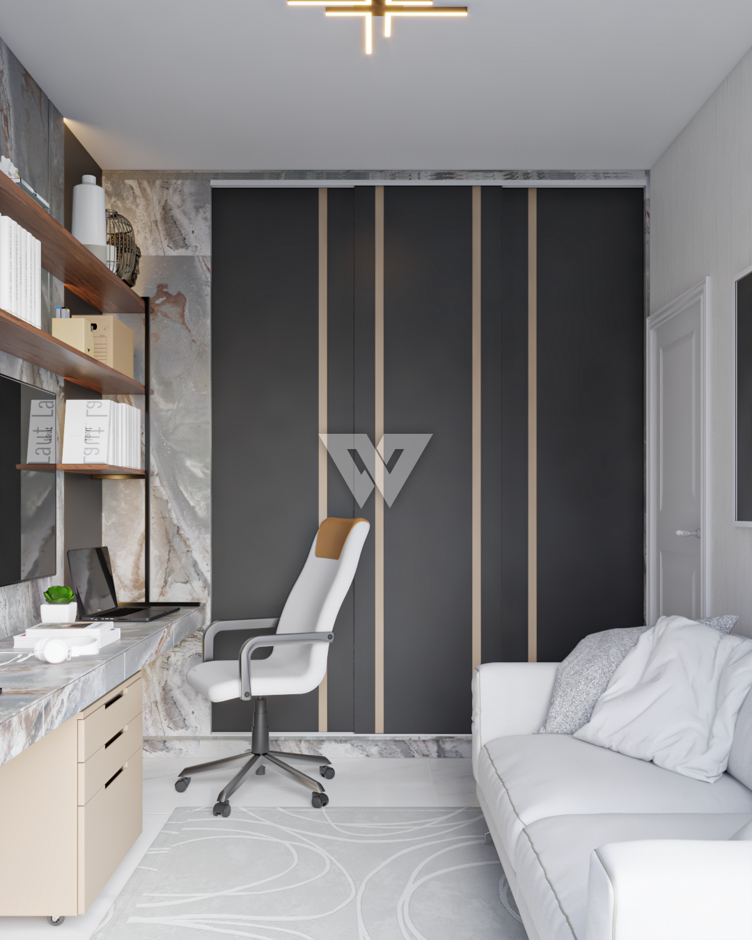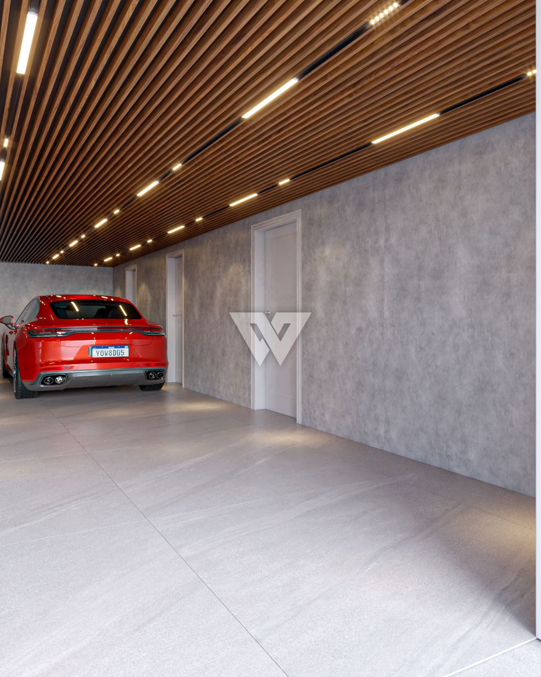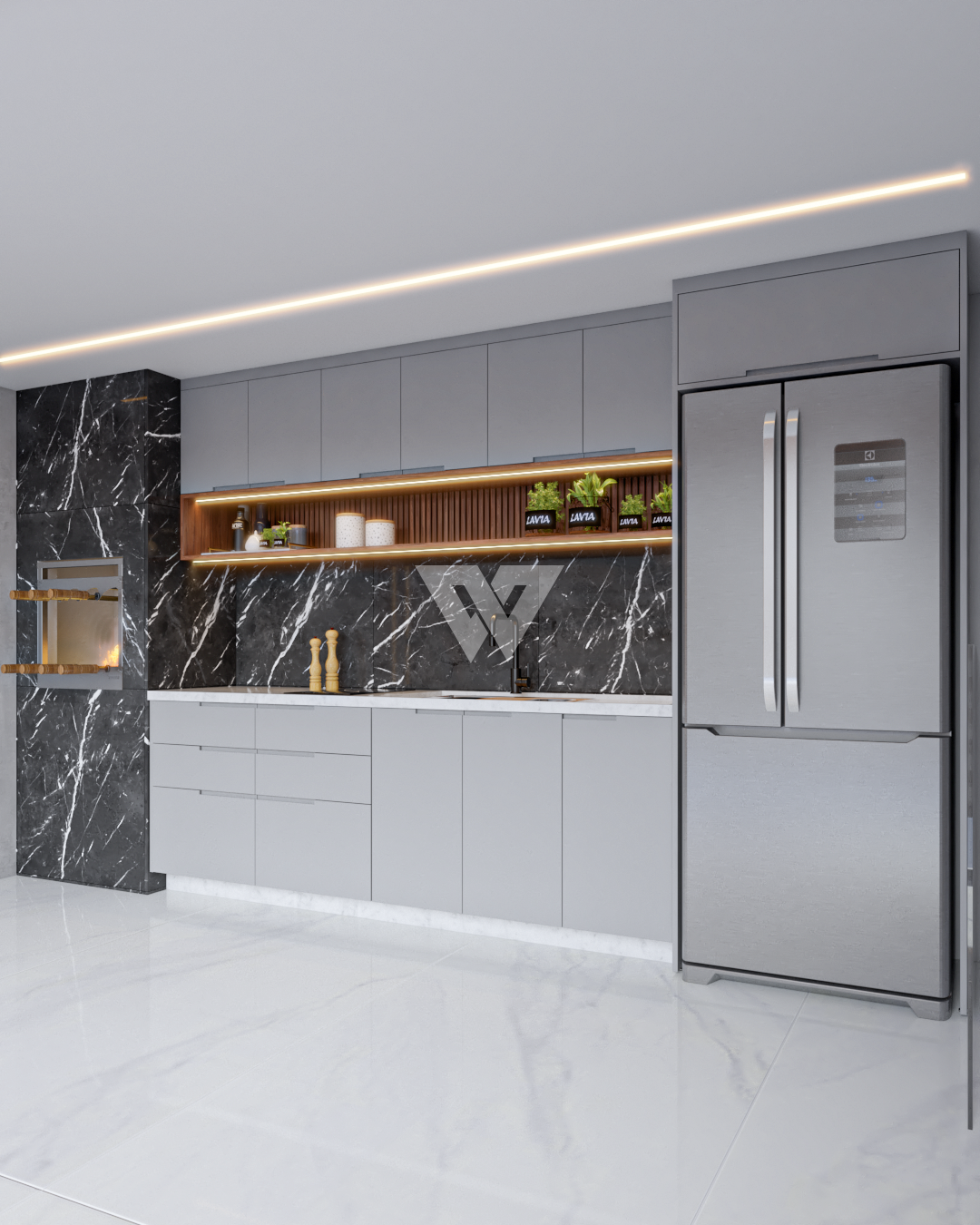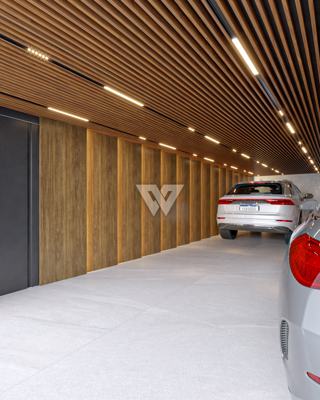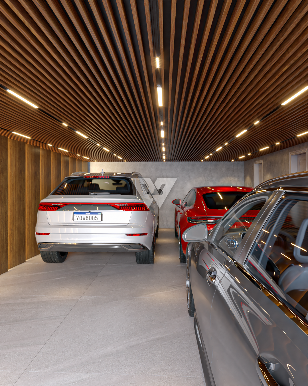 acabamento em gesso. Incluso painel ripado na lateral direita com luminárias.