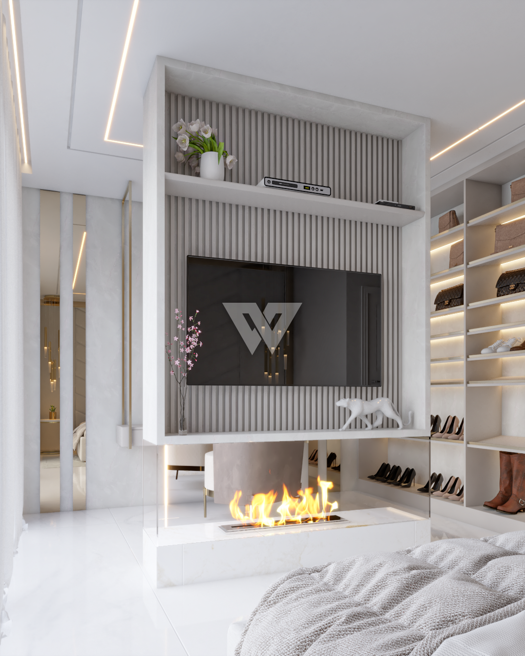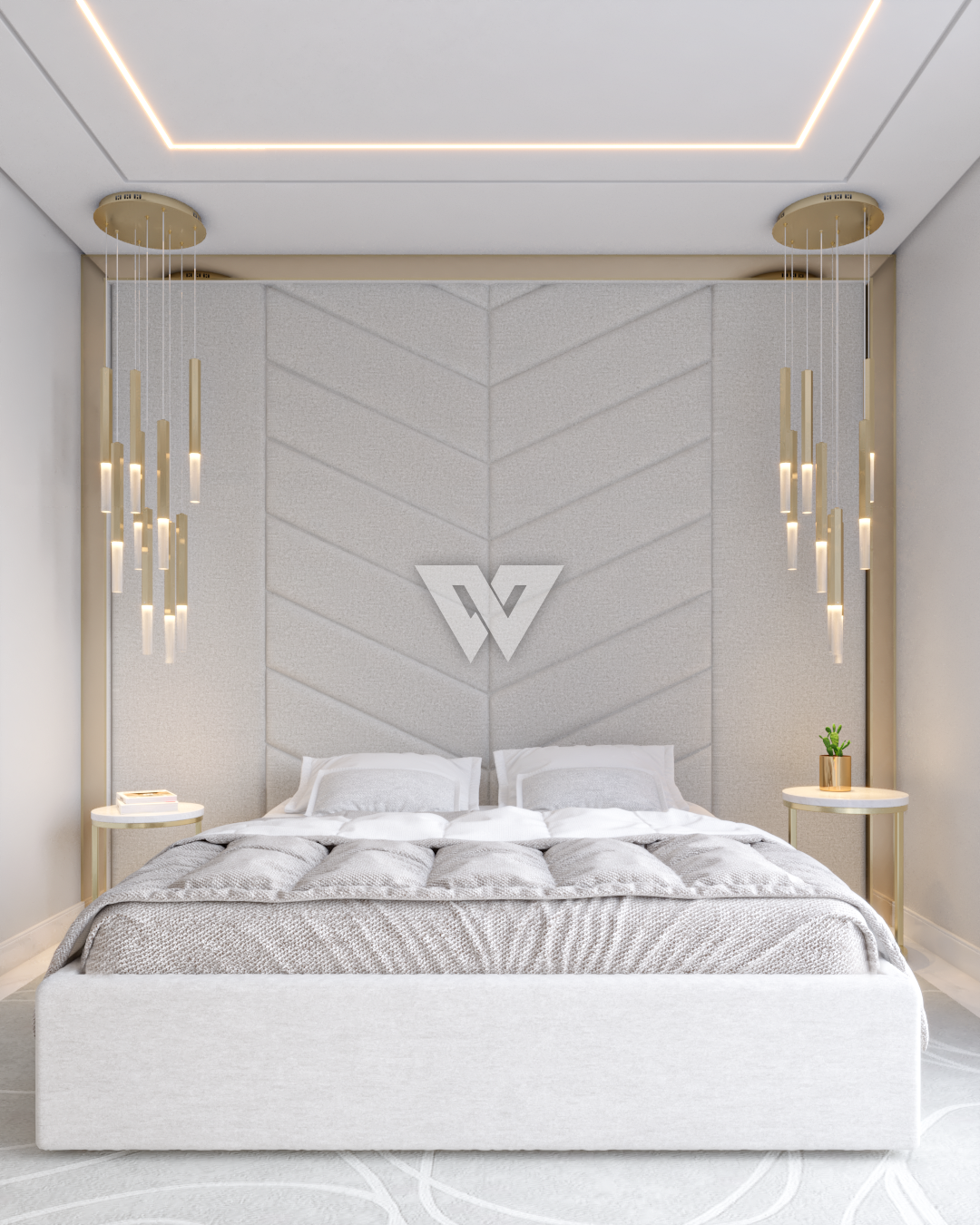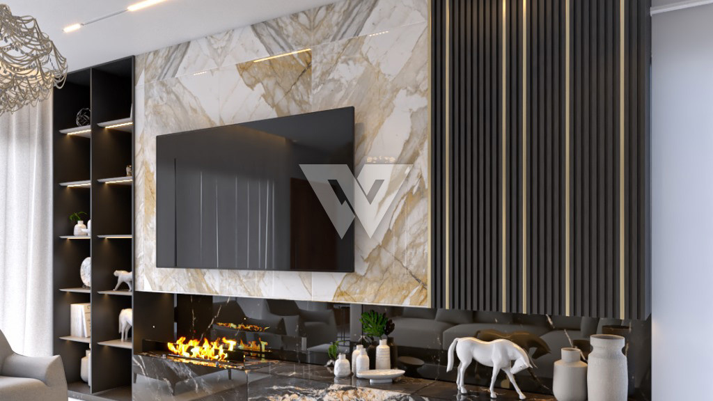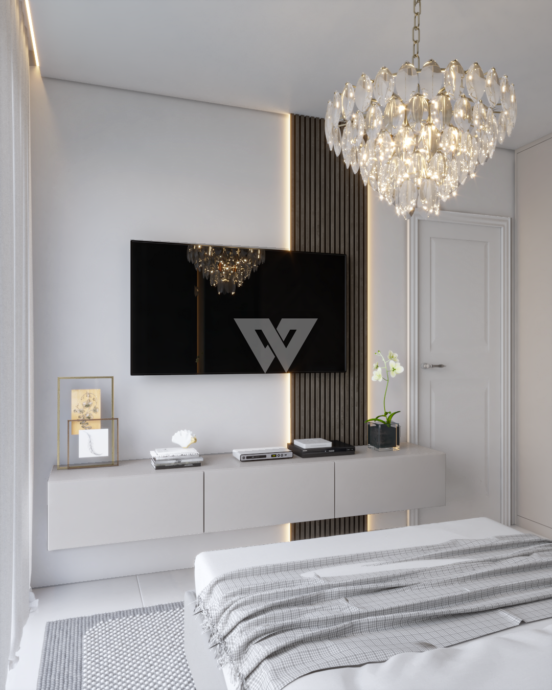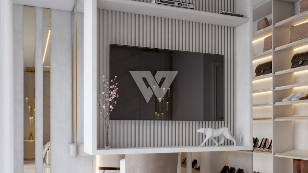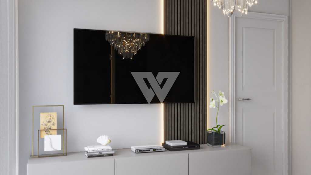 acabamento em gesso. Incluso painel ripado na lateral direita com luminárias.