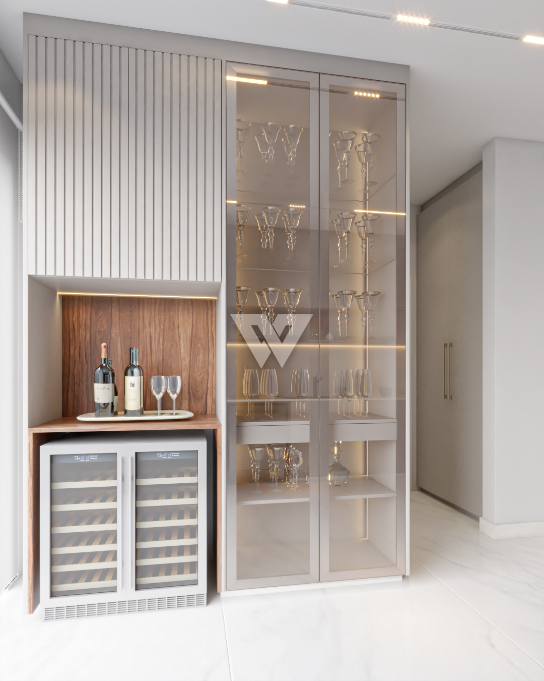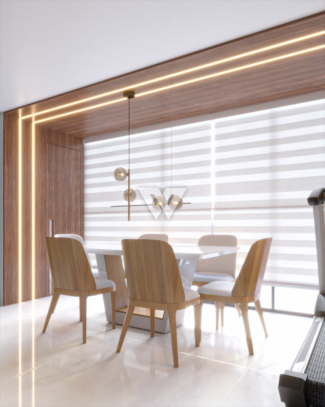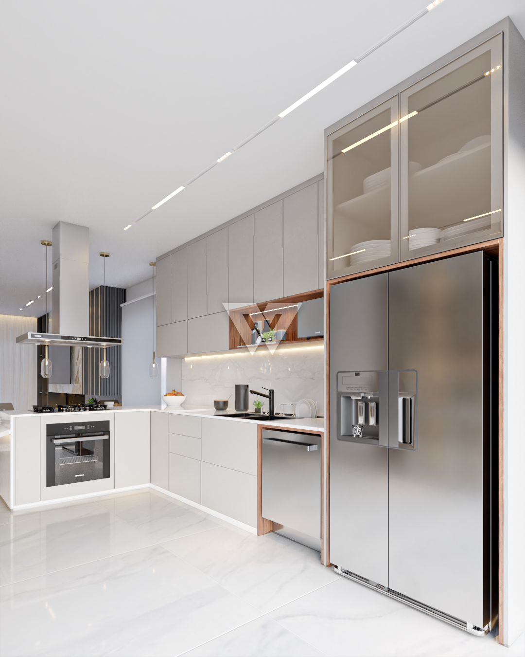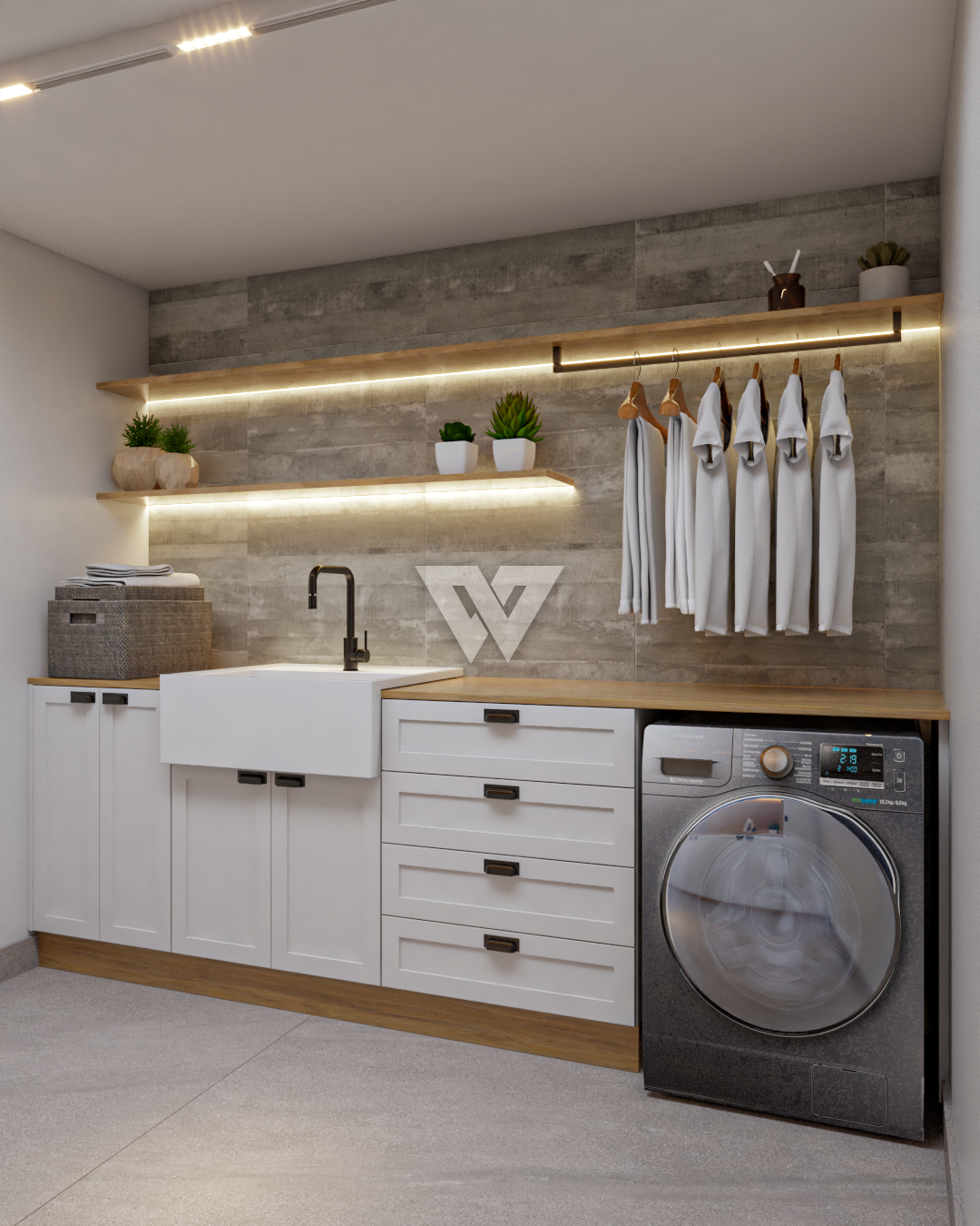 acabamento em gesso. Incluso painel ripado na lateral direita com luminárias.
