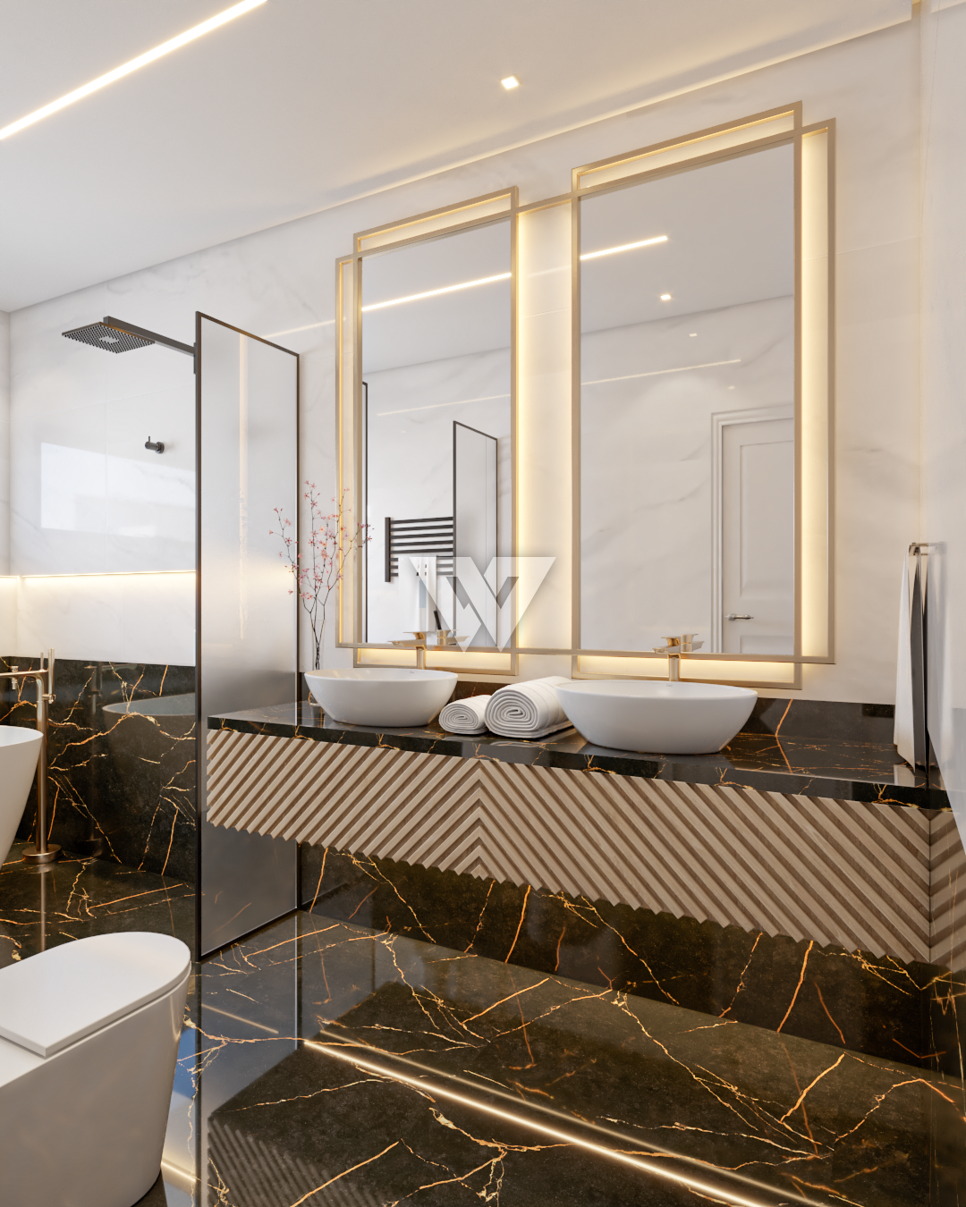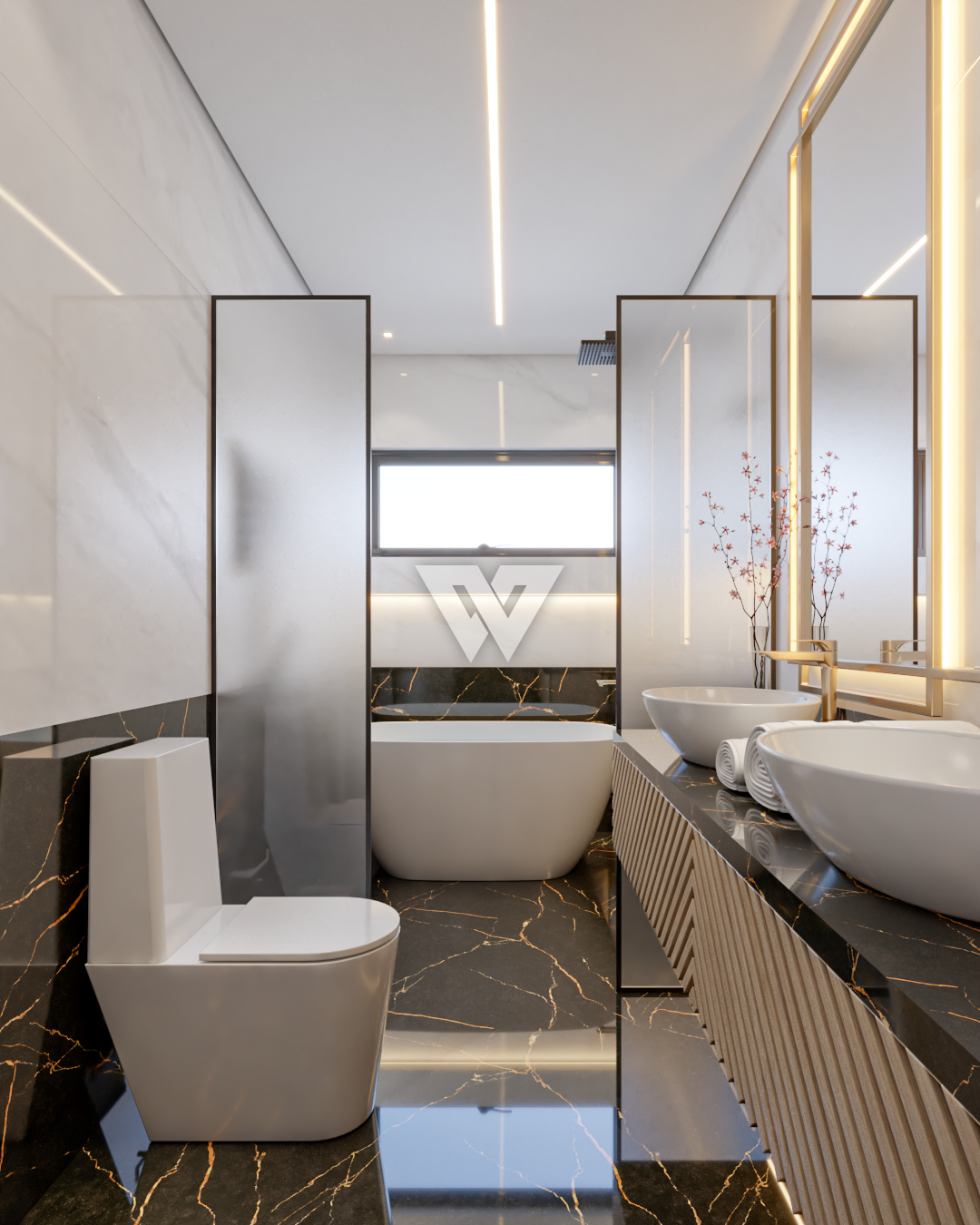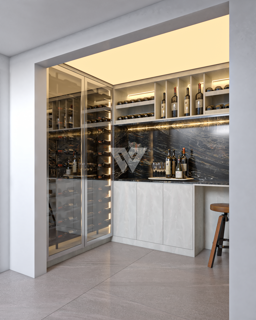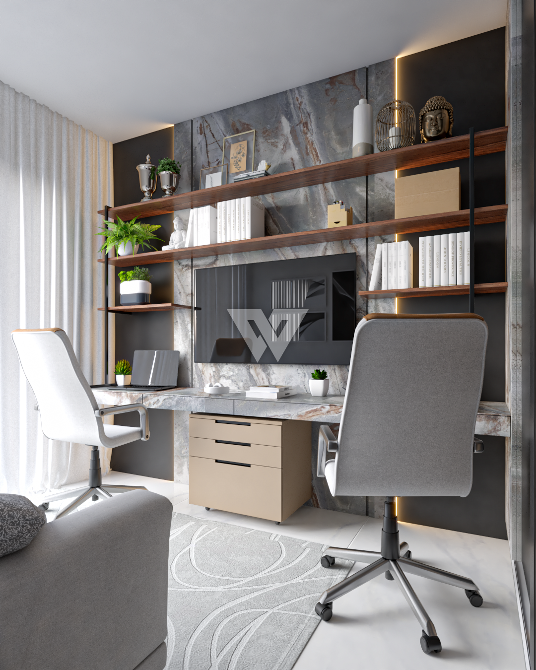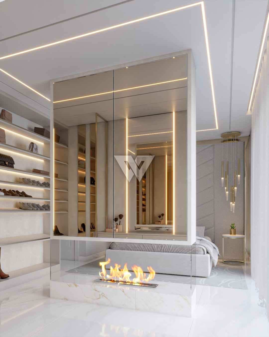 acabamento em gesso. Incluso painel ripado na lateral direita com luminárias.