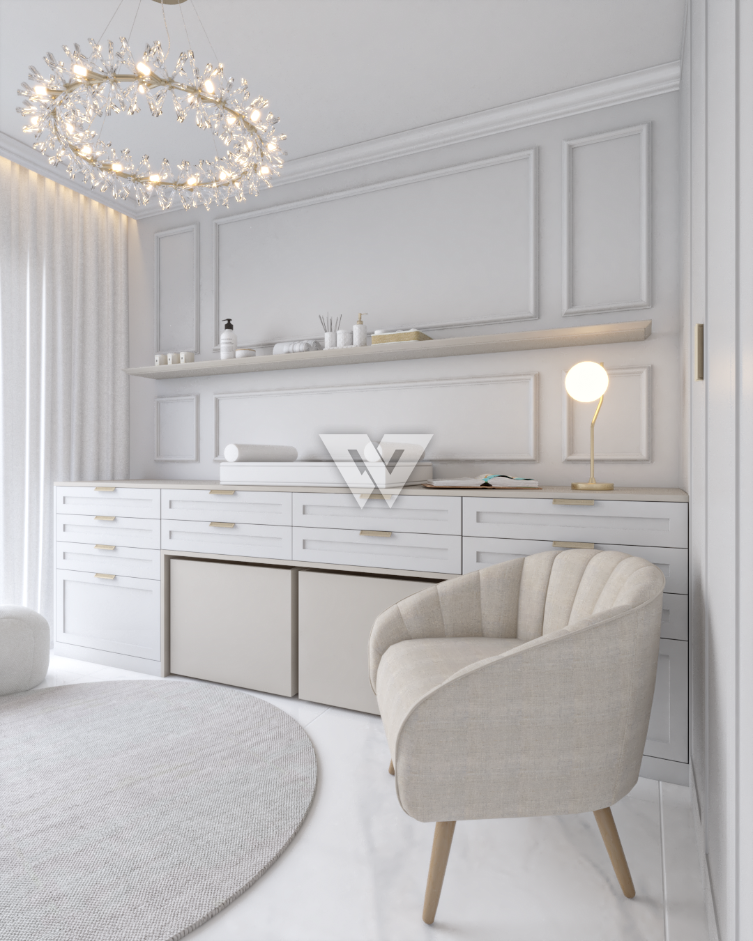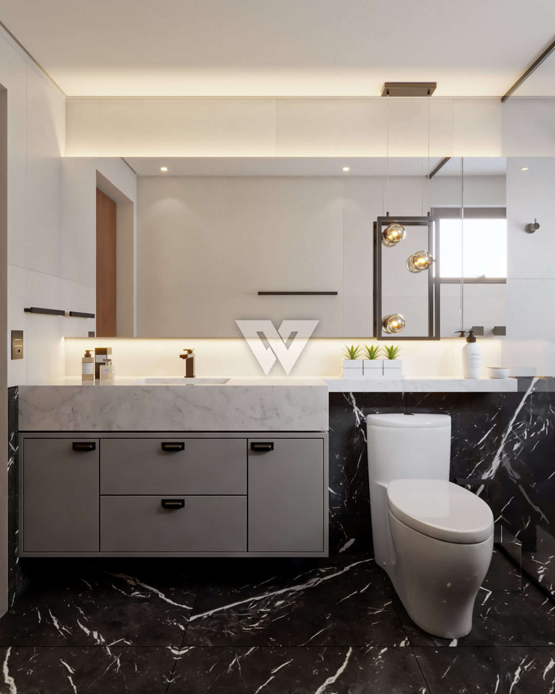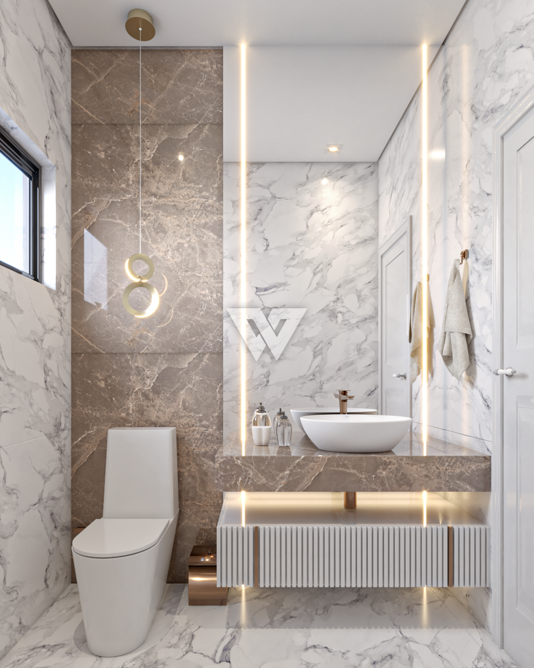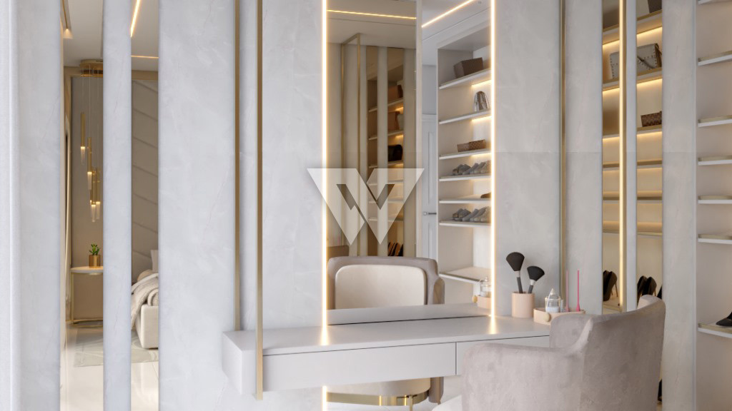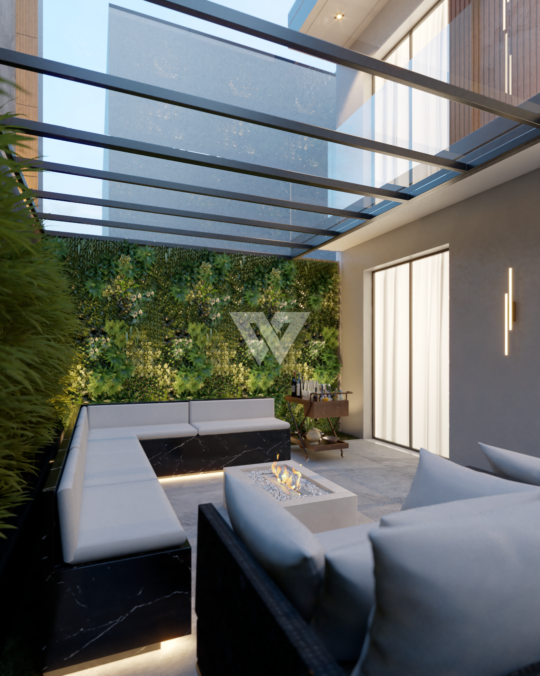 acabamento em gesso. Incluso painel ripado na lateral direita com luminárias.