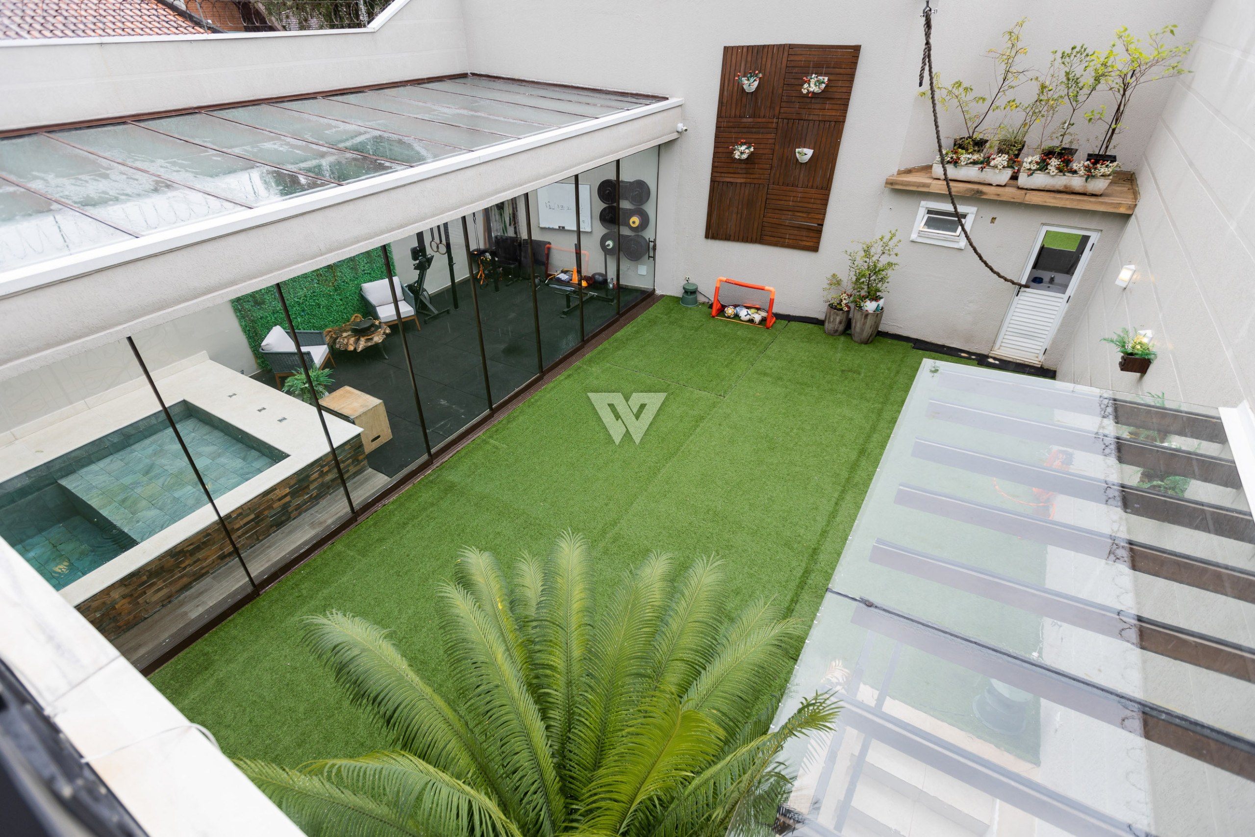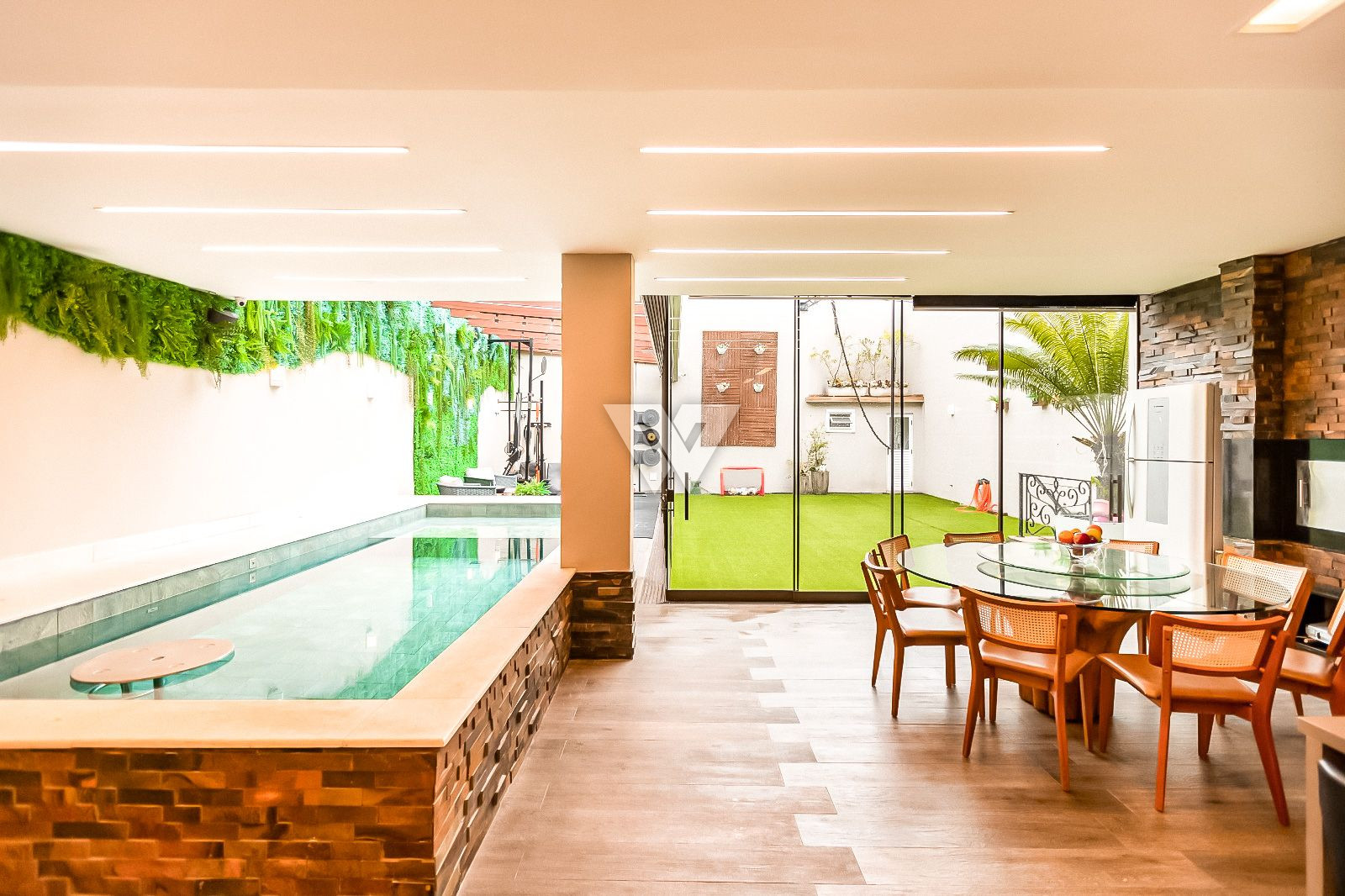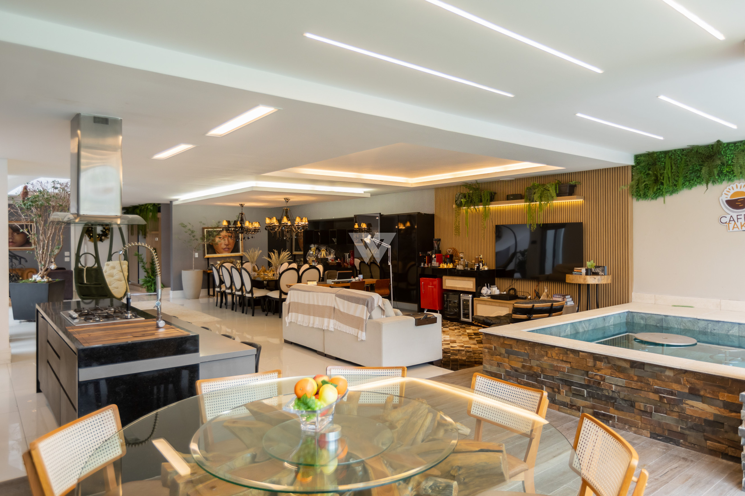 No térreo o destaque vai para as espacosas salas, cozinha gourmet, piscina aquecida com deck e solarium, mini campo defutebol e academia, dispensa e dependencia de empregada.