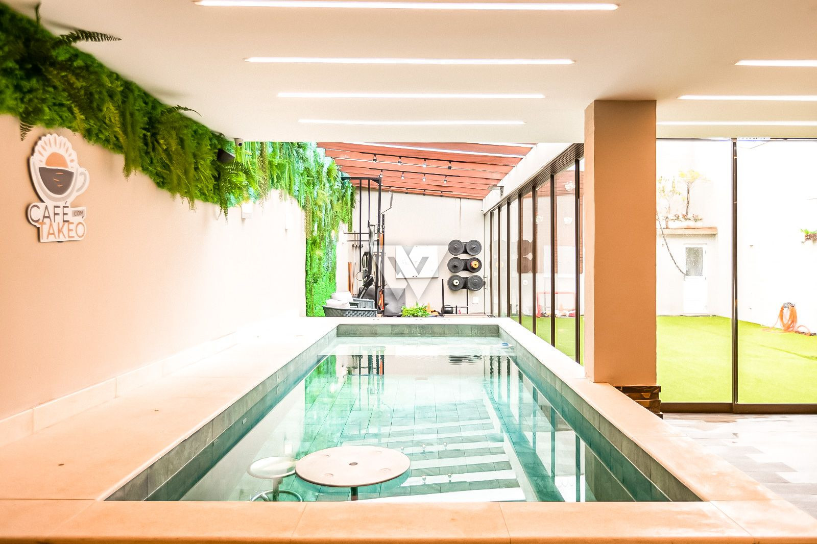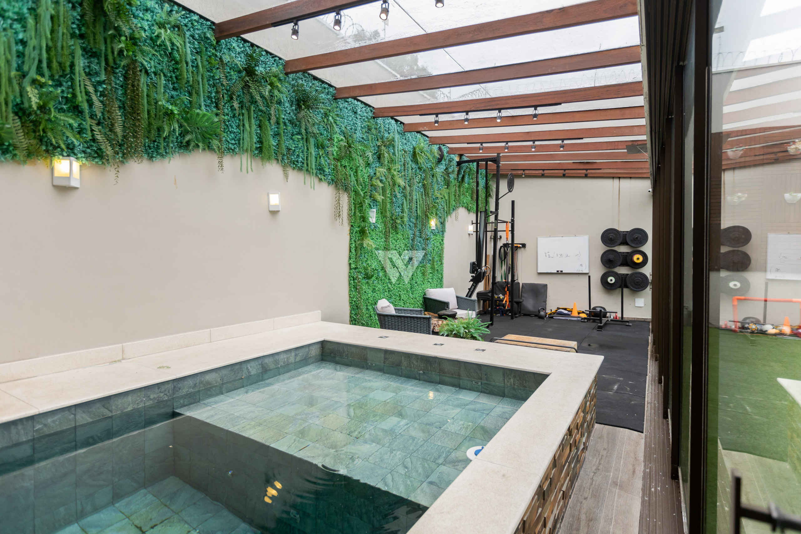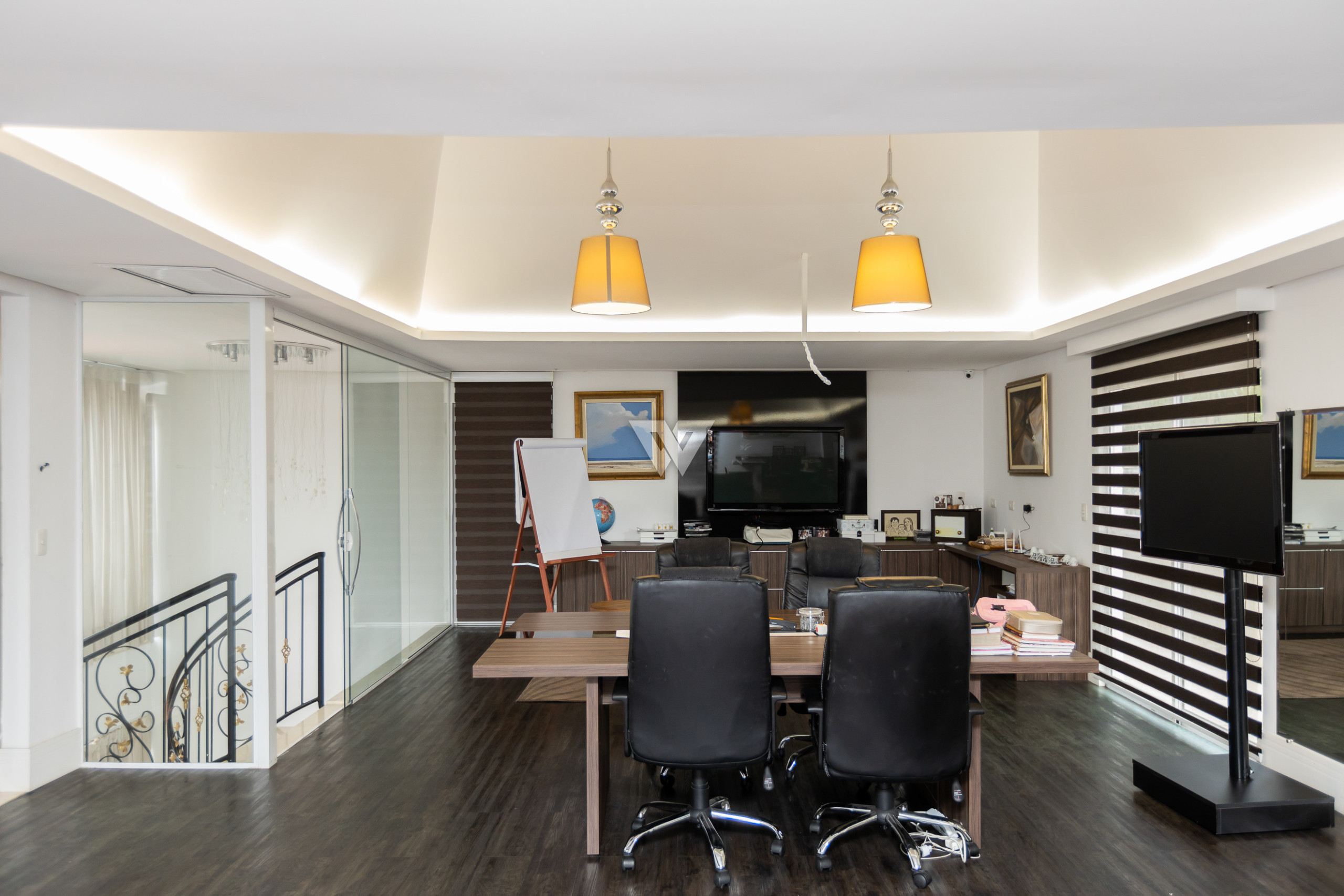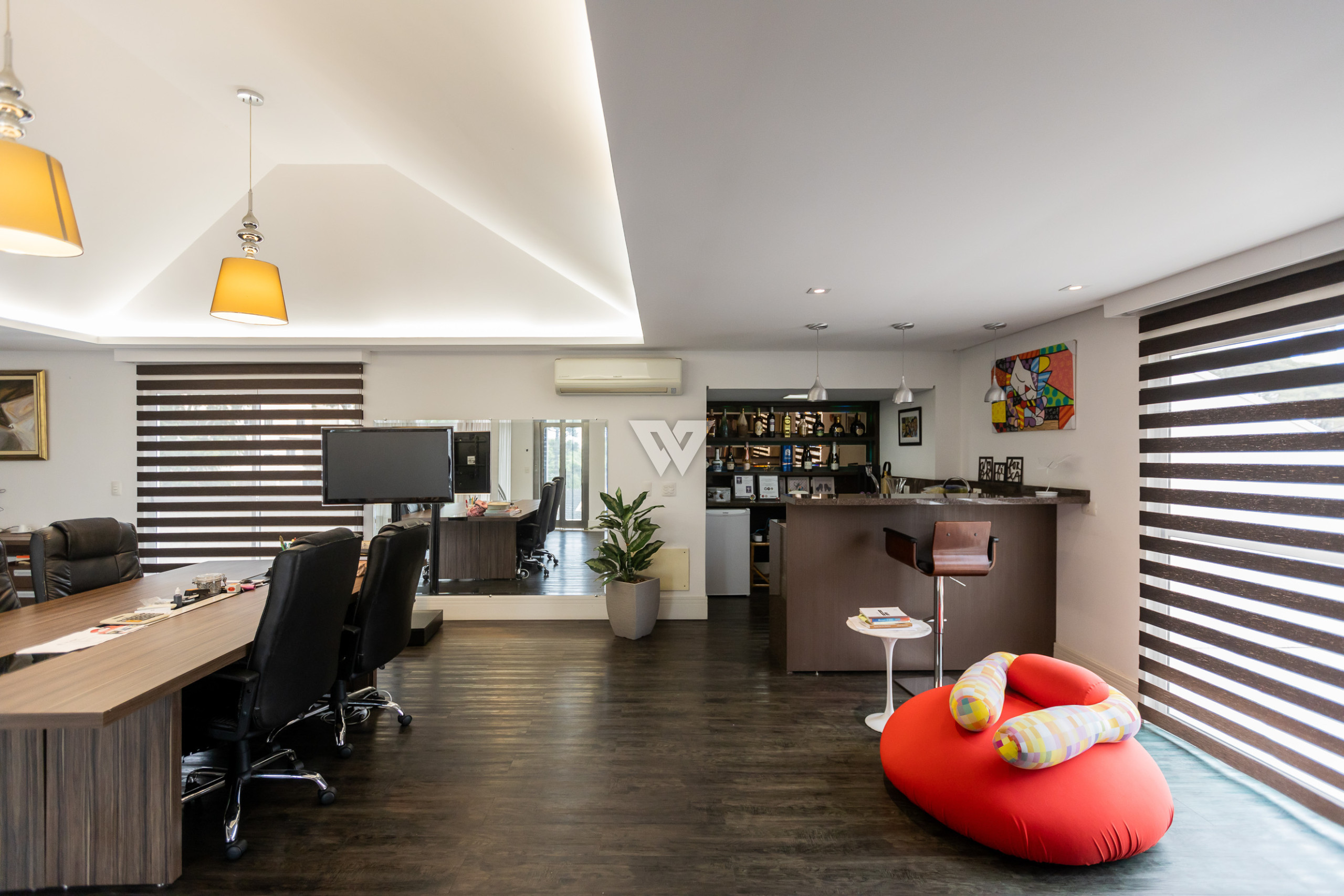 São 743m² divididos em 4 pavimentos, alimentados pelo elevador panorâmico que atende a todos os andares, com ambientes amplos, integrados entre si porem com vida própria.