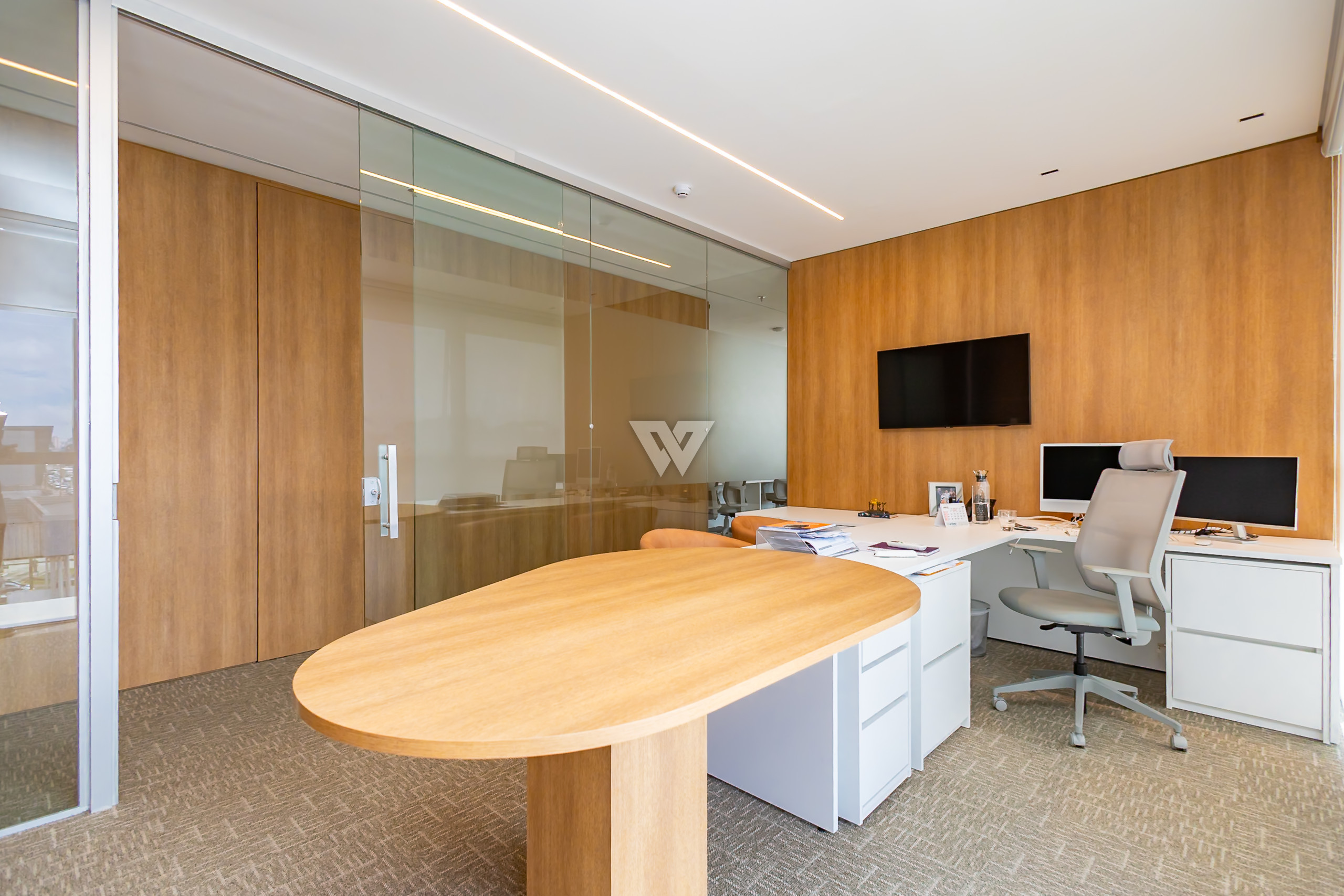 Sala comercial no Edifício comercial de alto padrão mais cobiçado da região do Parque Barigui, o Mai Work. Finamente decorada com 111,60m² privativos, subdividos em 05 salas, recepção, 03 banheiros e 01 cozinha.